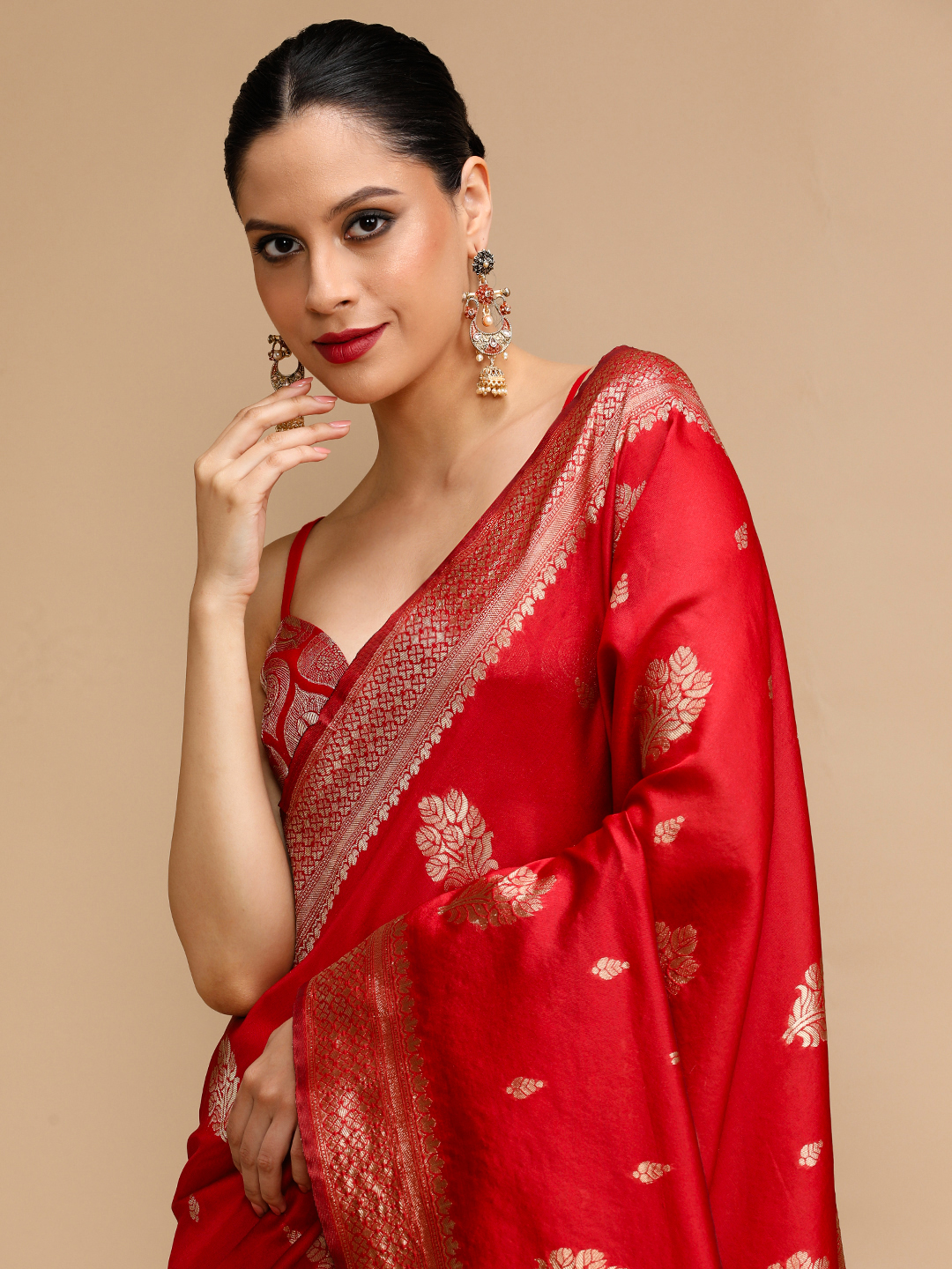Red Color Lichi Silk Saree Woven Jacquard Designer For Ceremonial Looks