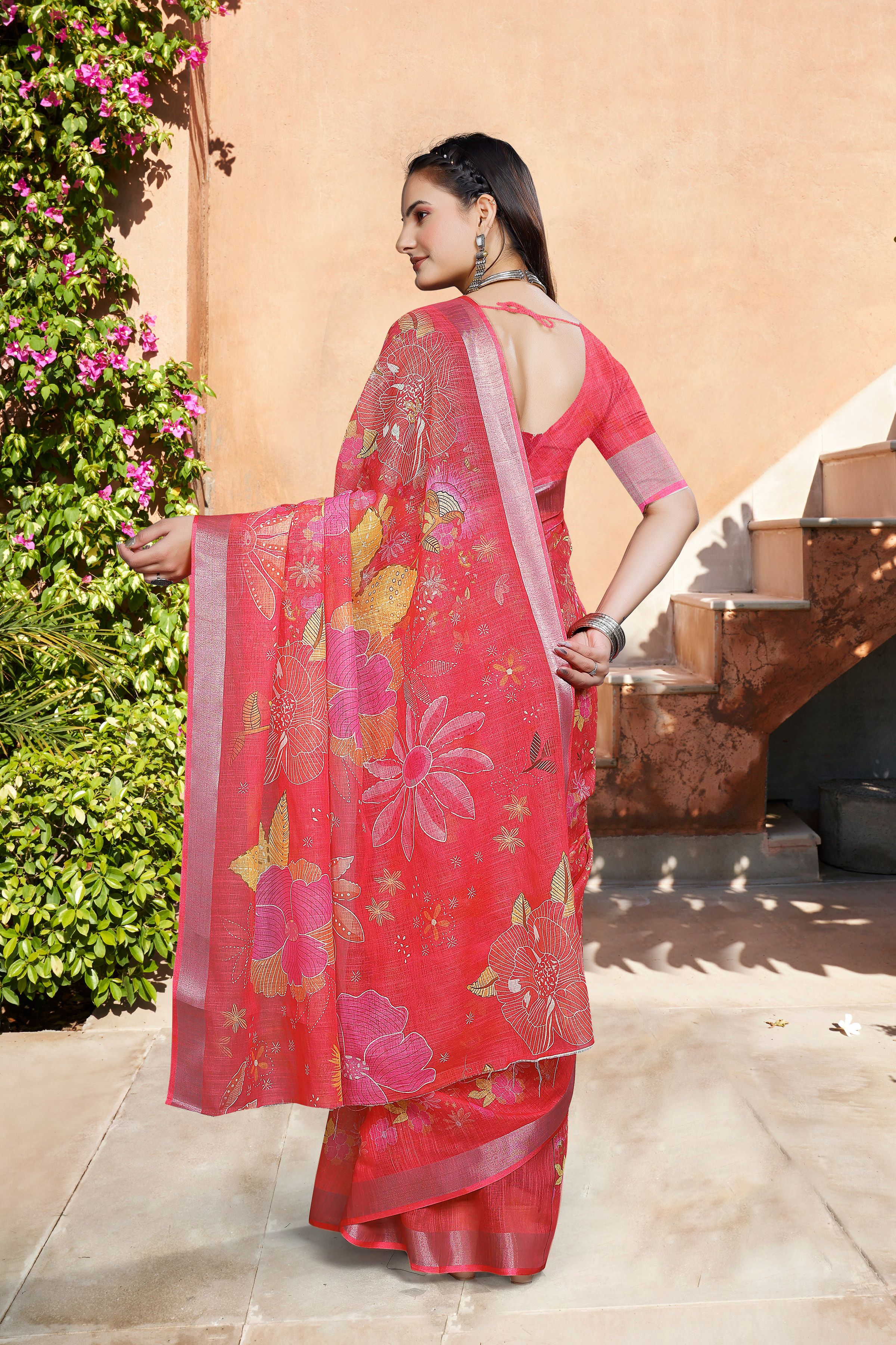 Red Color Linen Cotton Fabric Woven Border Designer Printed Saree