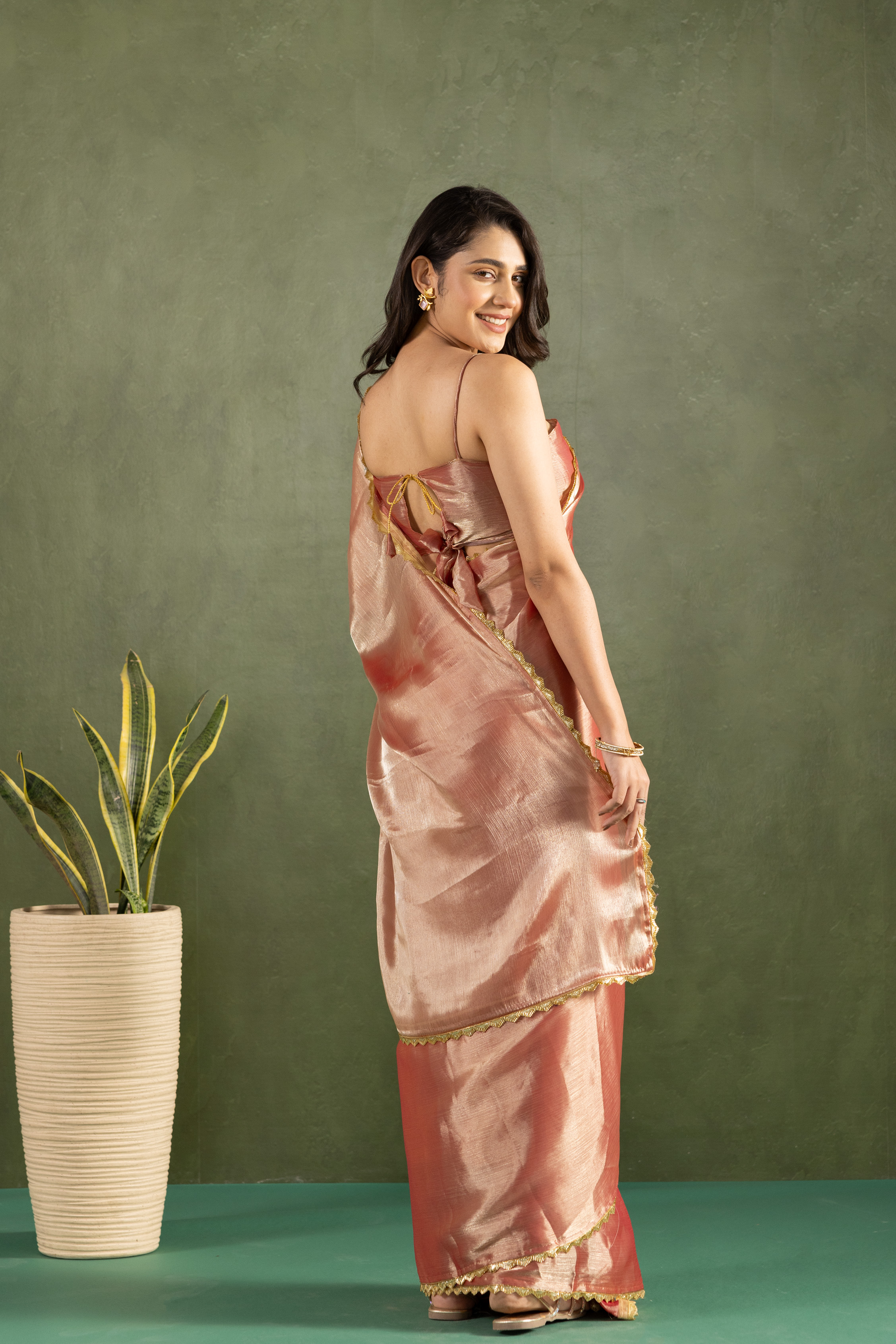 Rose Gold Color Chiffon Fabric Ready To Wear Designer Solid Partywear Saree