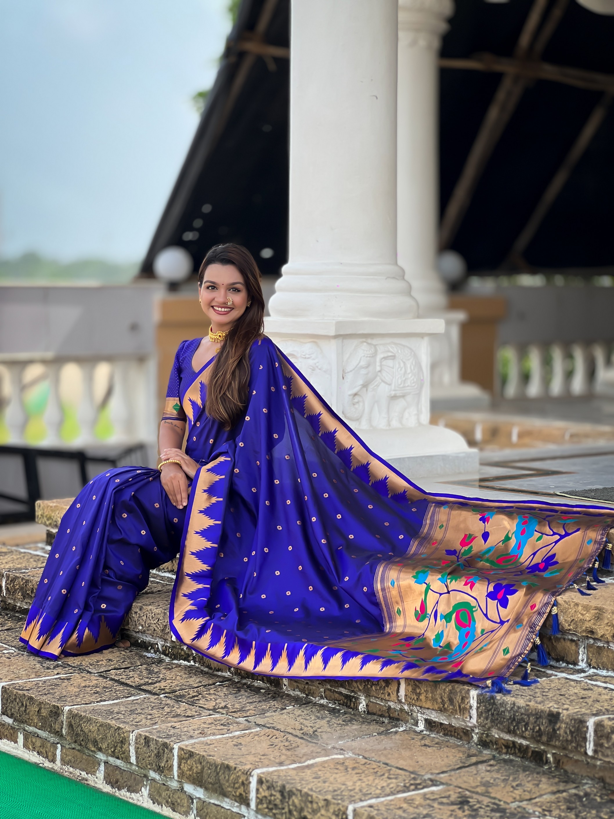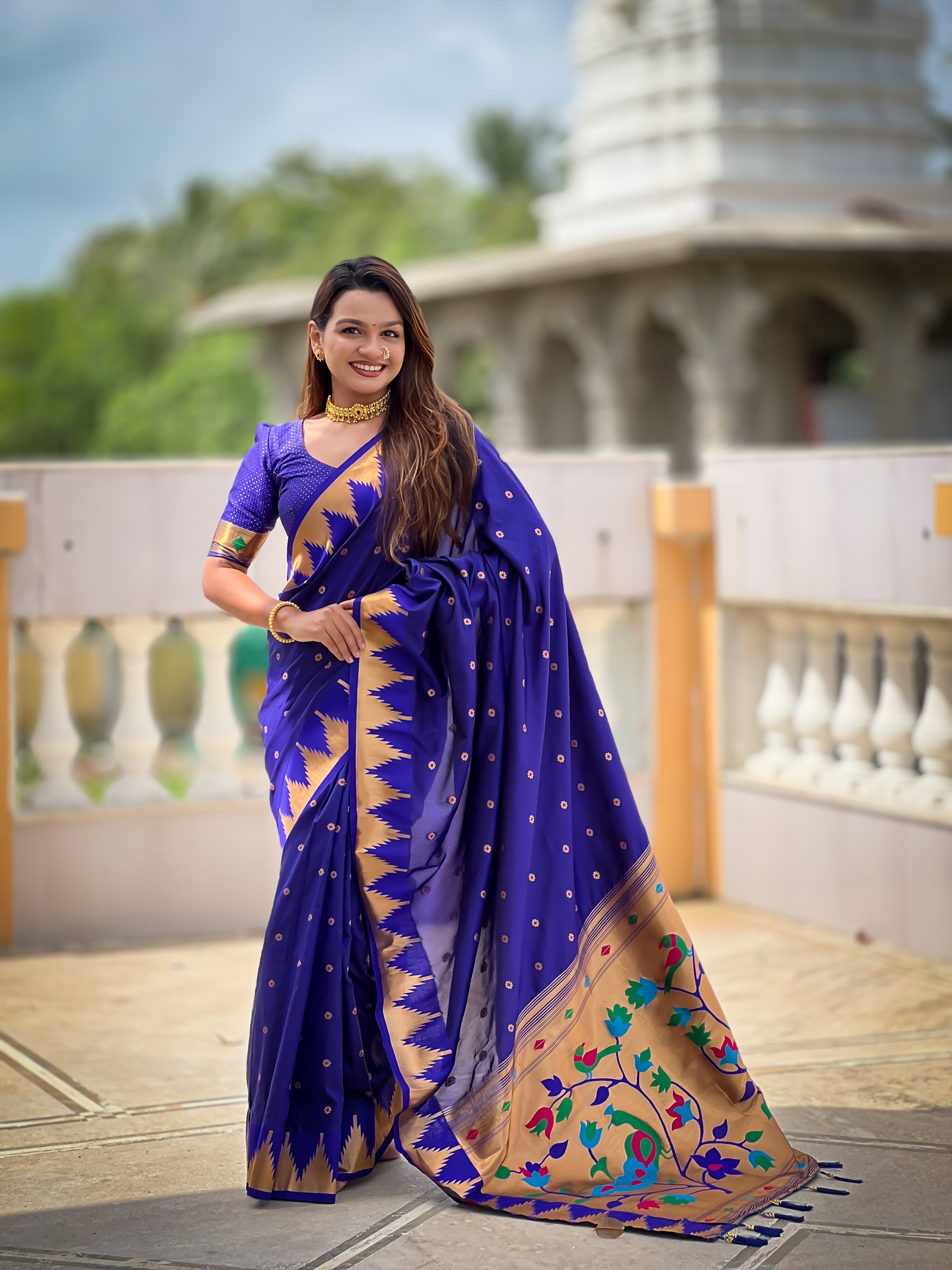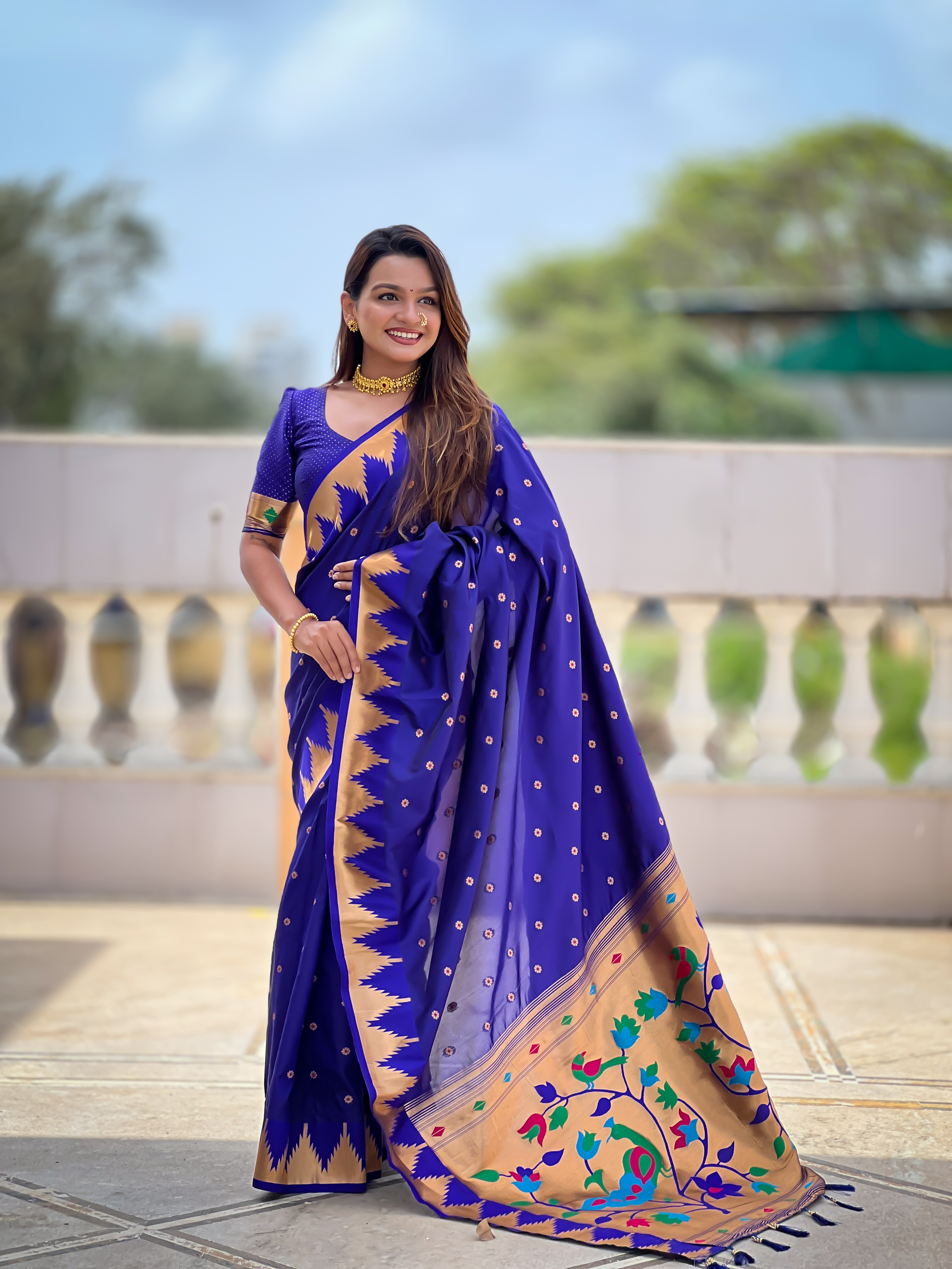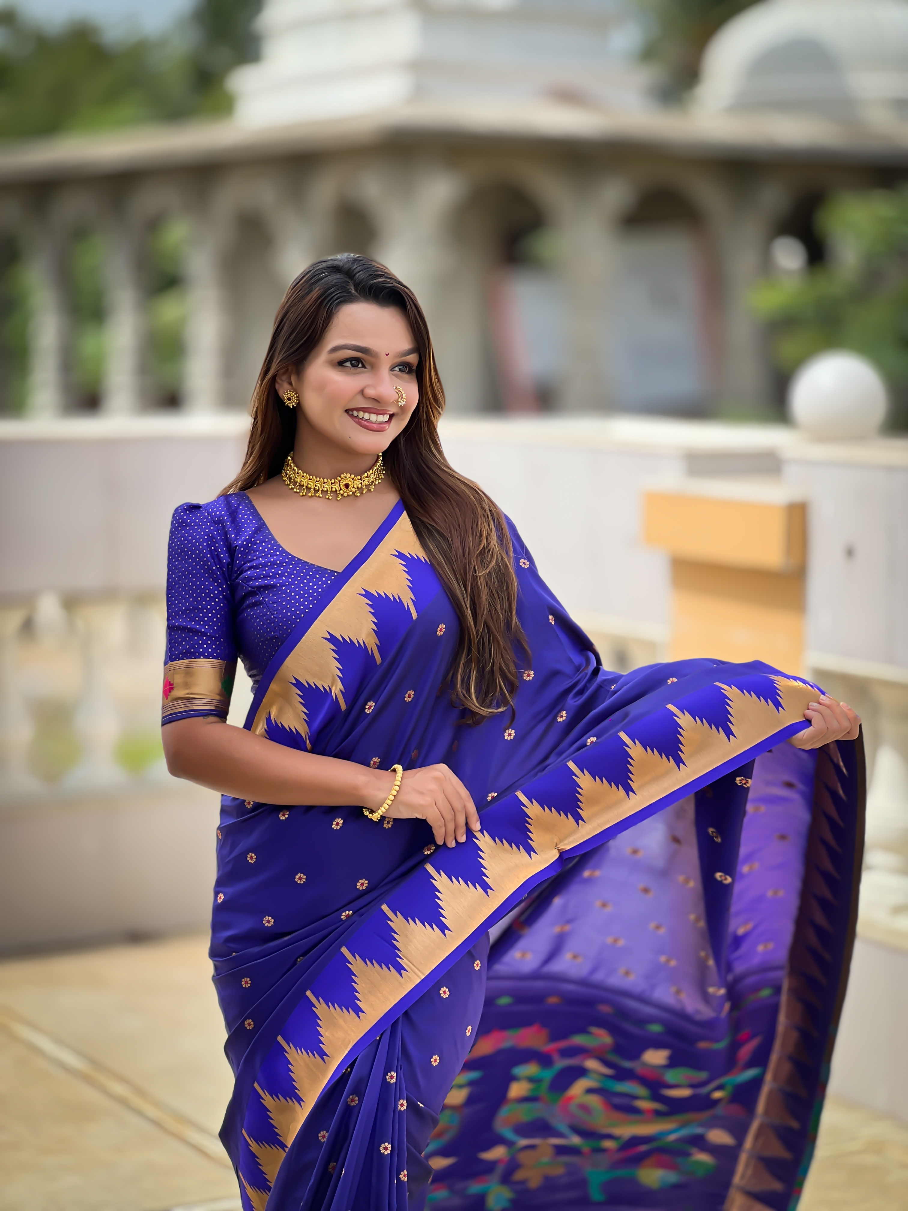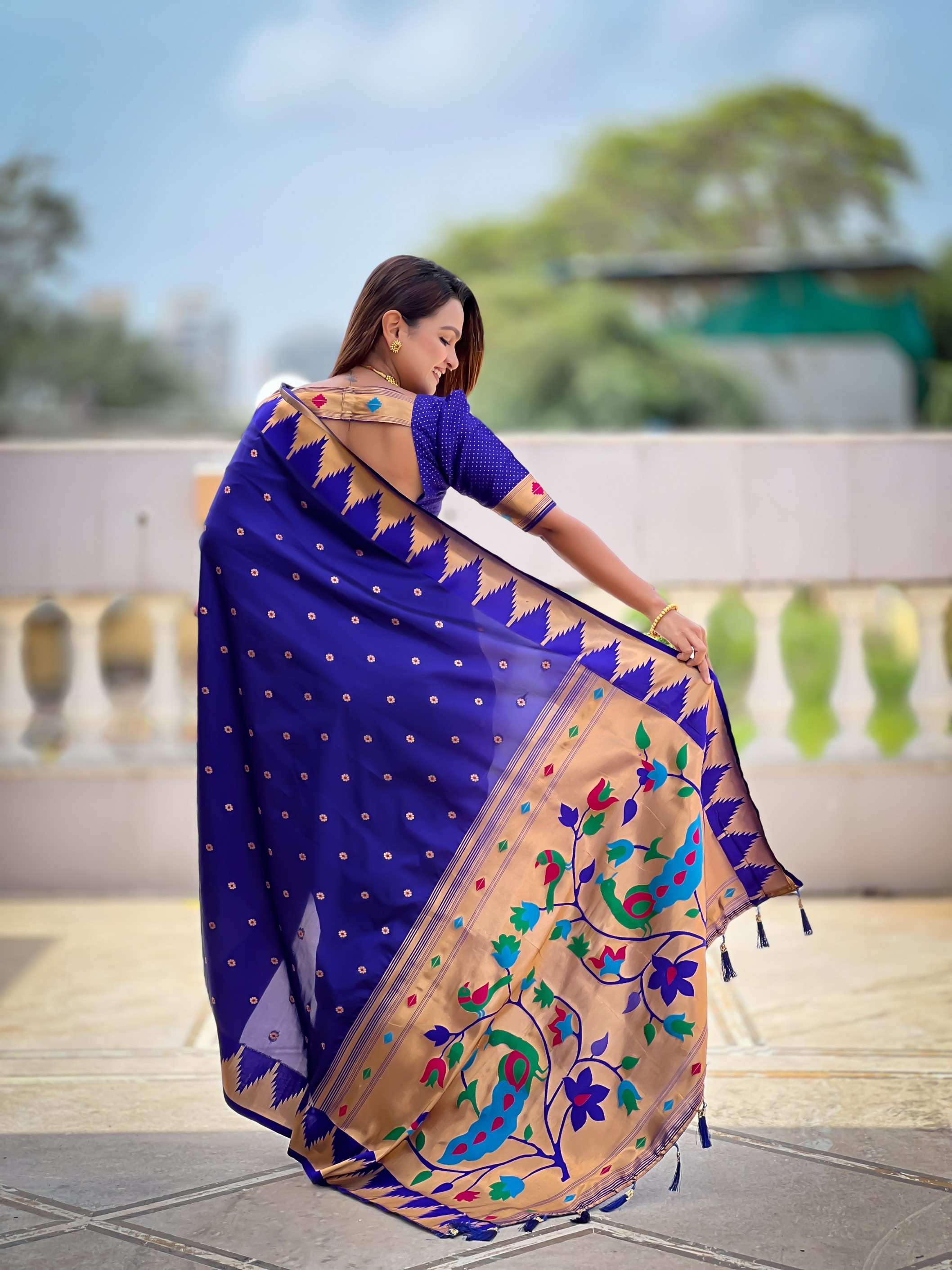 Royal Blue Color Sophisticated Paithani Silk Fabric Woven Jacquard Meenakari Designer Saree
