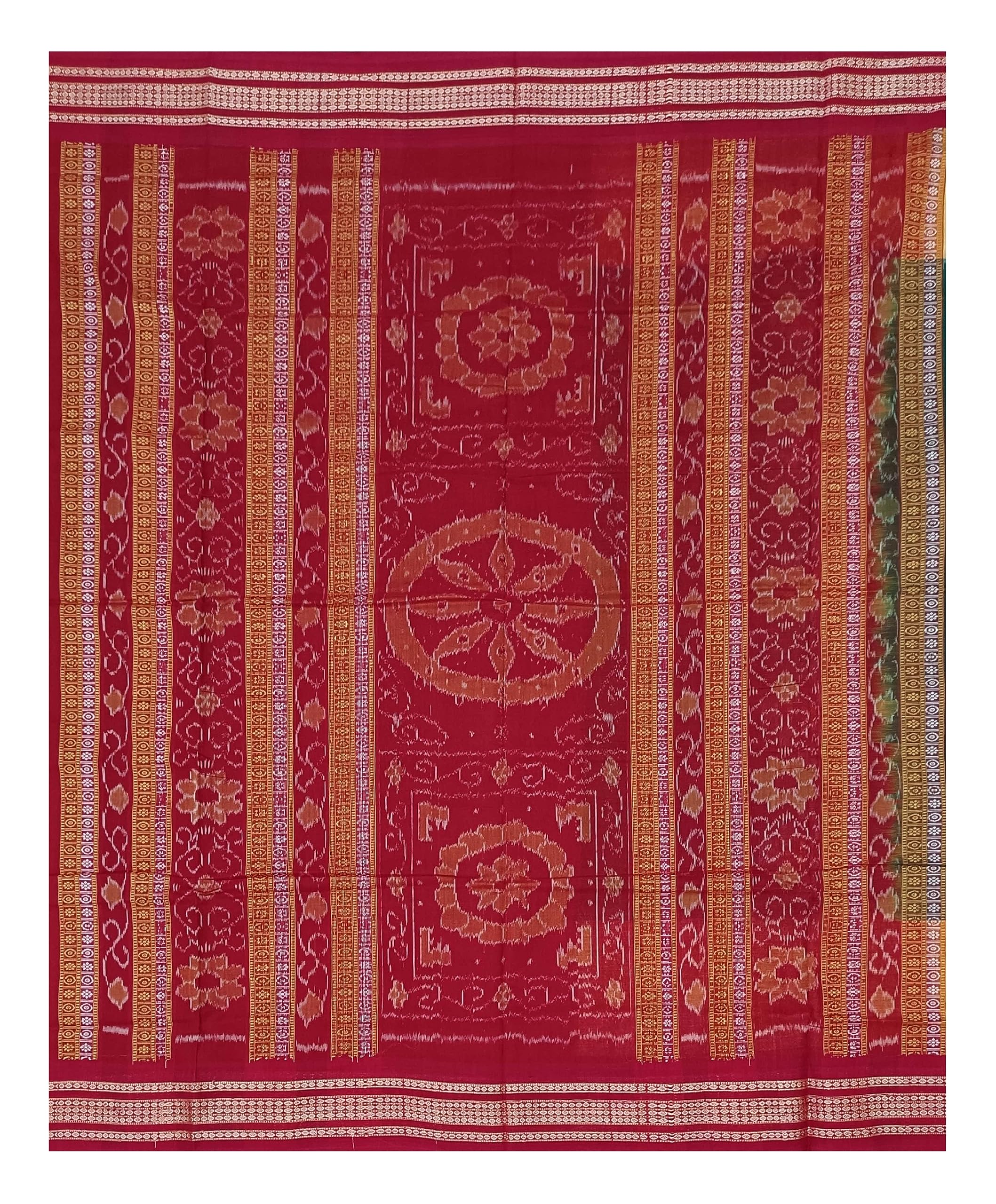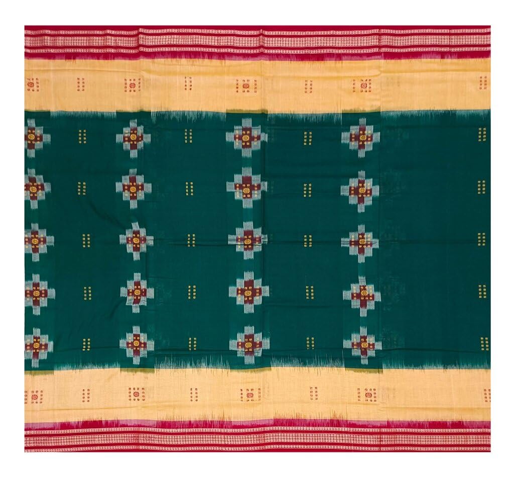 SAMBALPURI BANDHA CRAFT sambalpuri bomkai cotton saree with blouse piece(Pasapali design in green red and light peach colors combination)