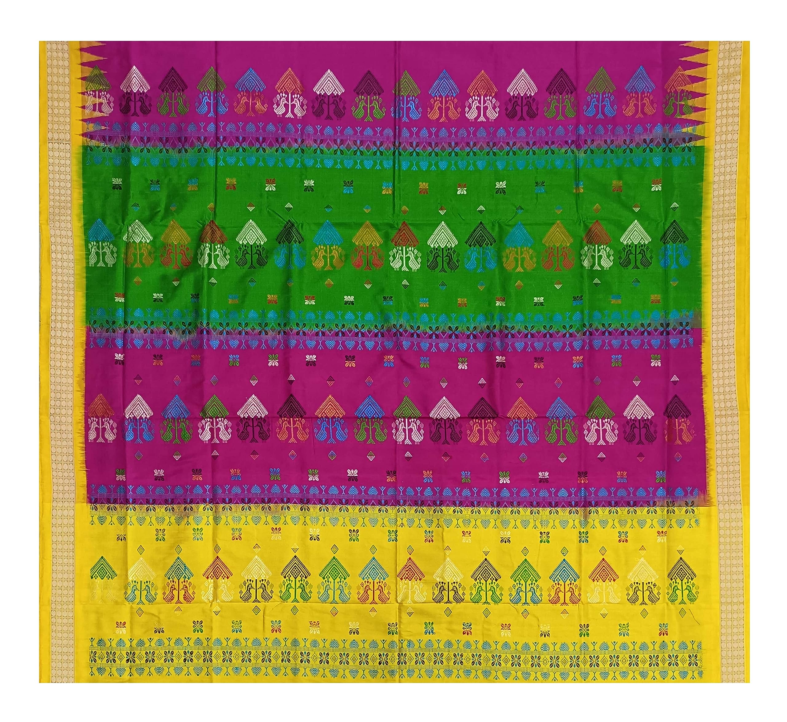 SAMBALPURI BANDHA CRAFT sambalpuri bomkai silk saree with blouse piece(Peacock motifs in pink color base with multi color pallu)