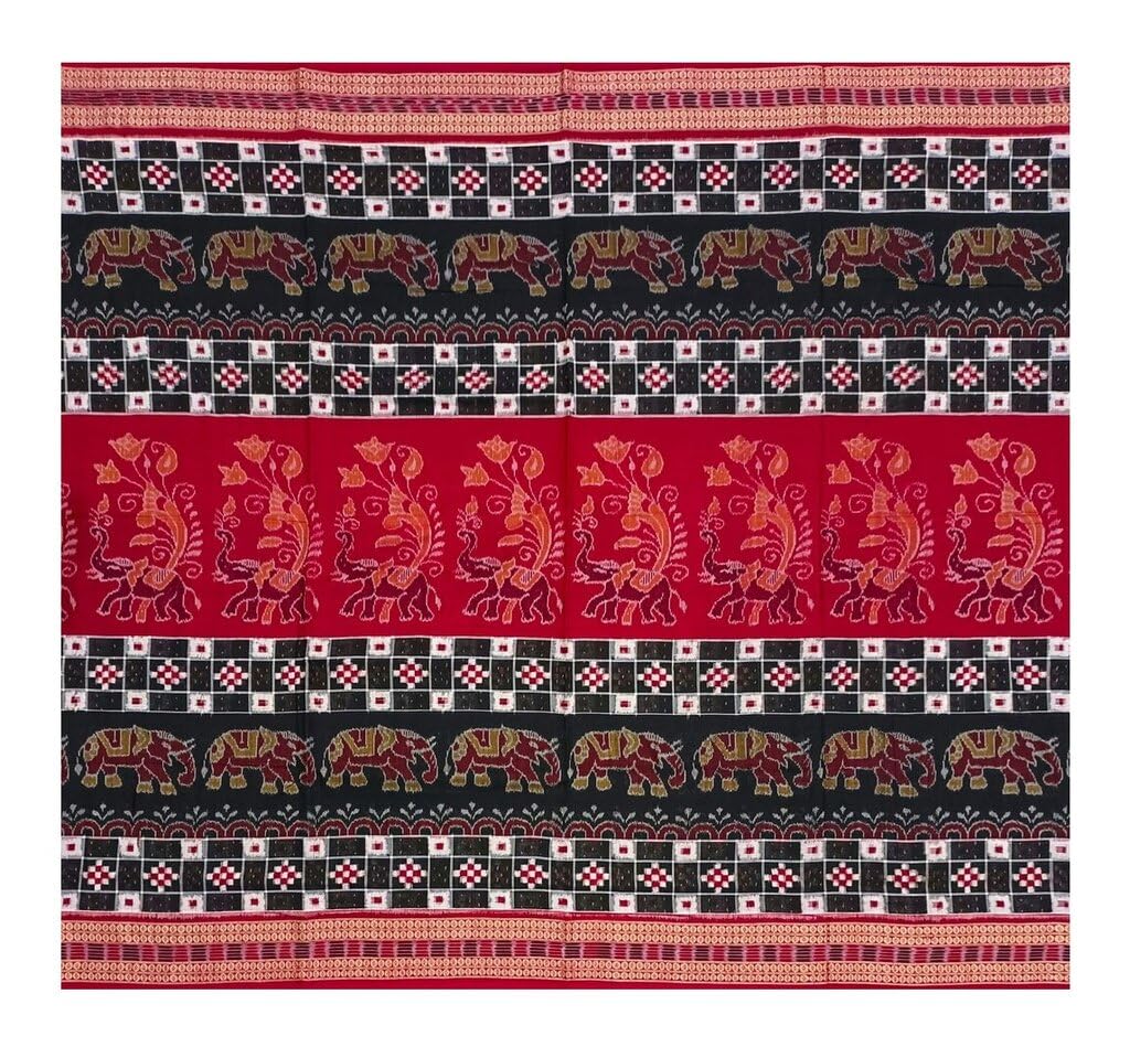 SAMBALPURI BANDHA CRAFT sambalpuri cotton saree with blouse piece(Pasapali and elephants design in black red and white colors combination)