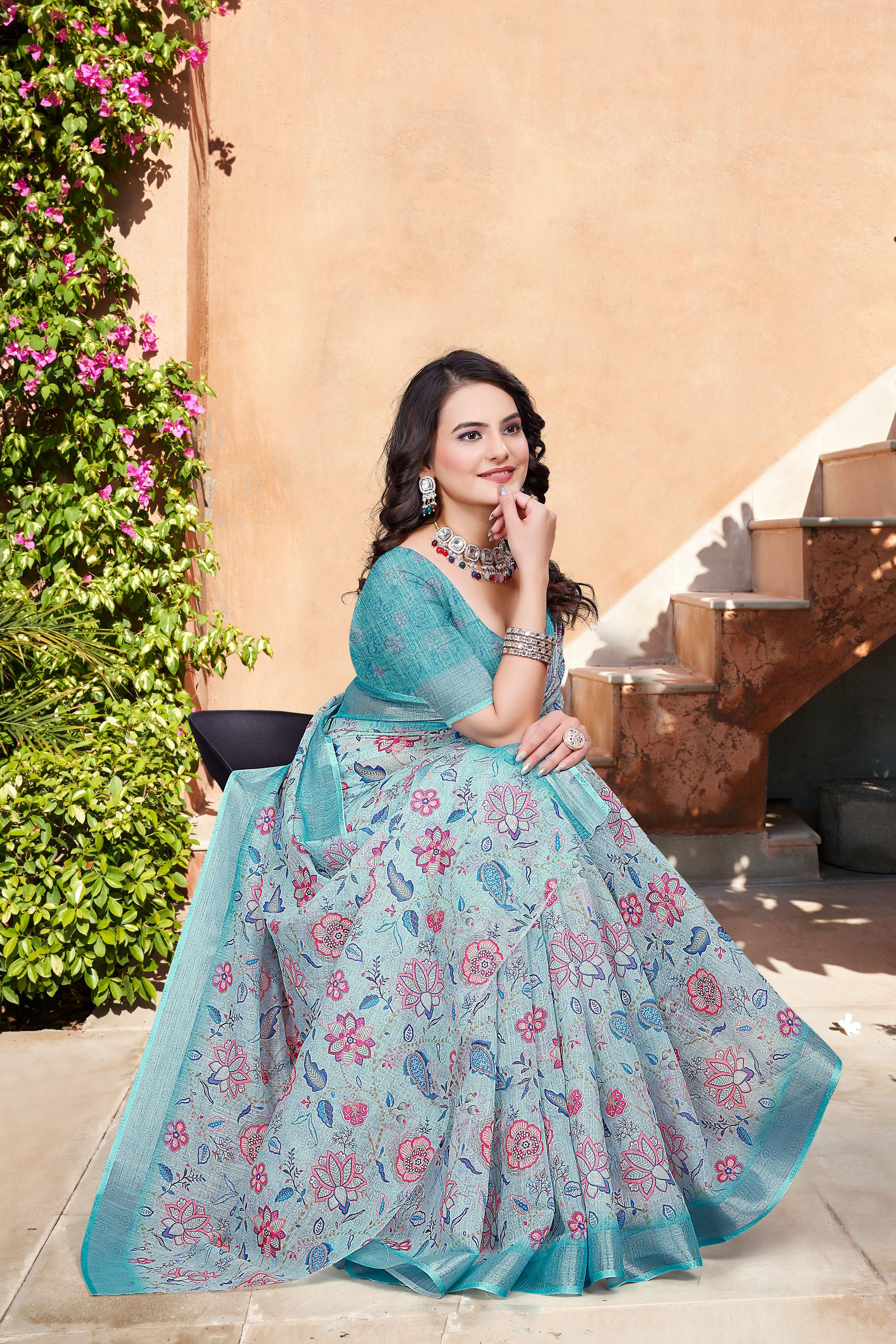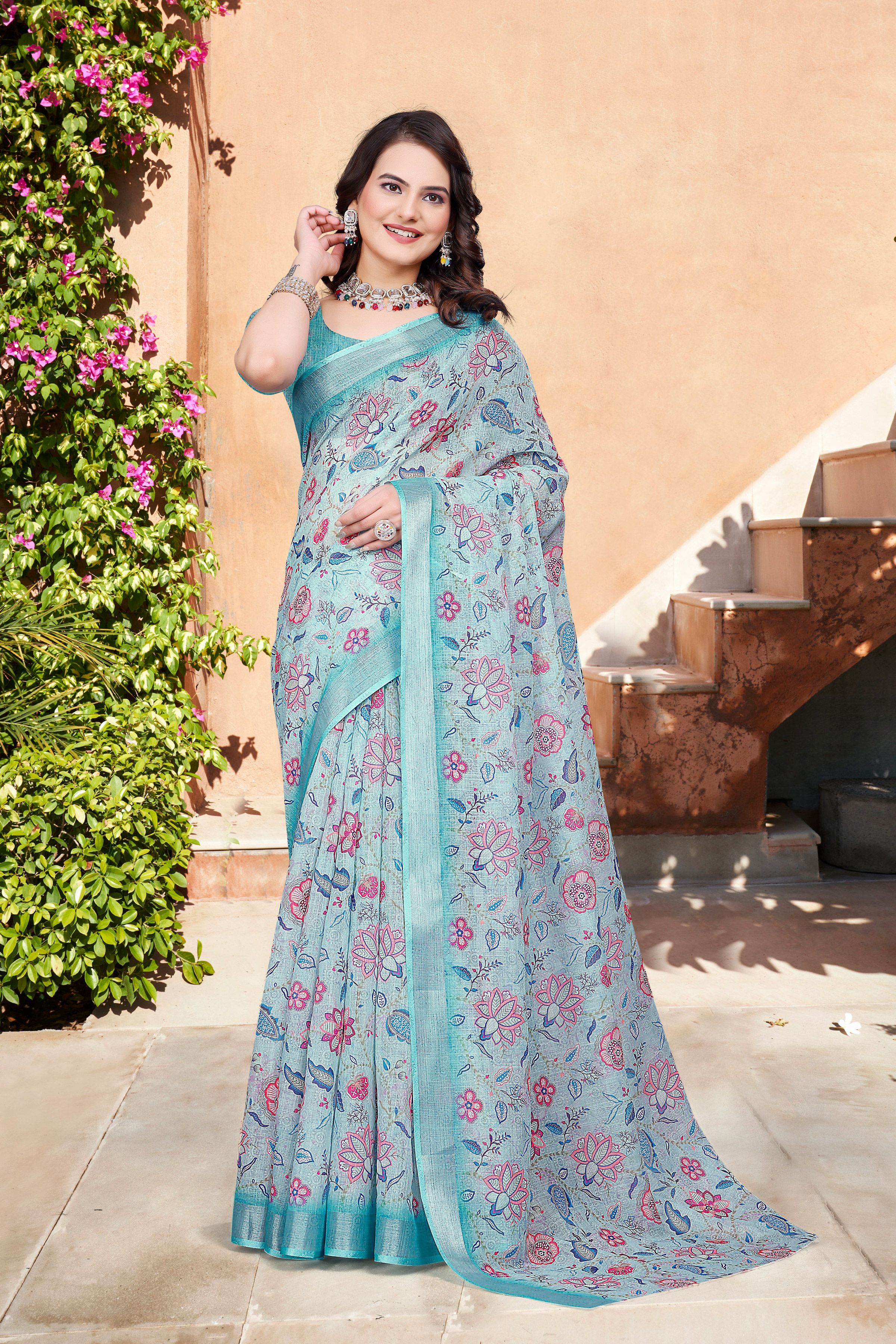 Attractive These Festive Saree in Fine Colored.These Saree Are Linen Cotton And Blouse is Fabricated On Linen Cotton Pair.Its Beautified With Woven Jari Border With Designer Digital Printed.