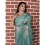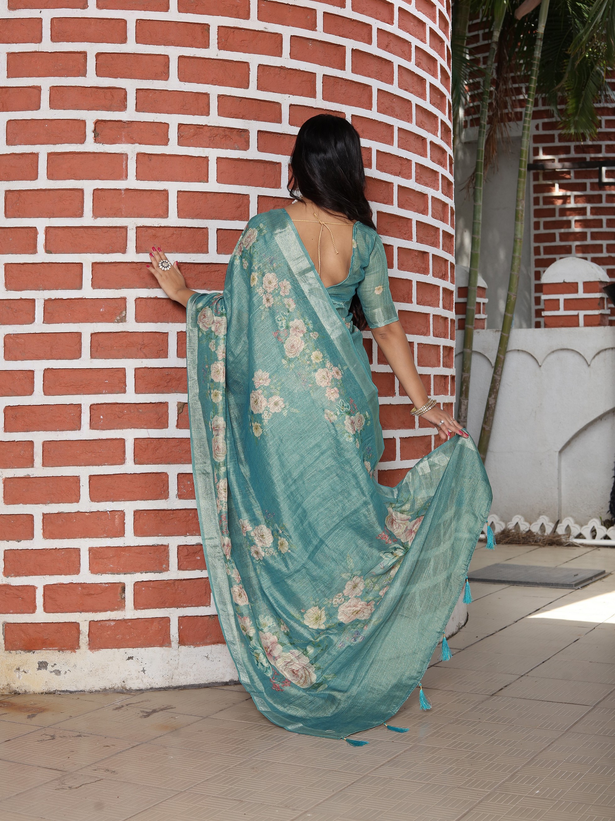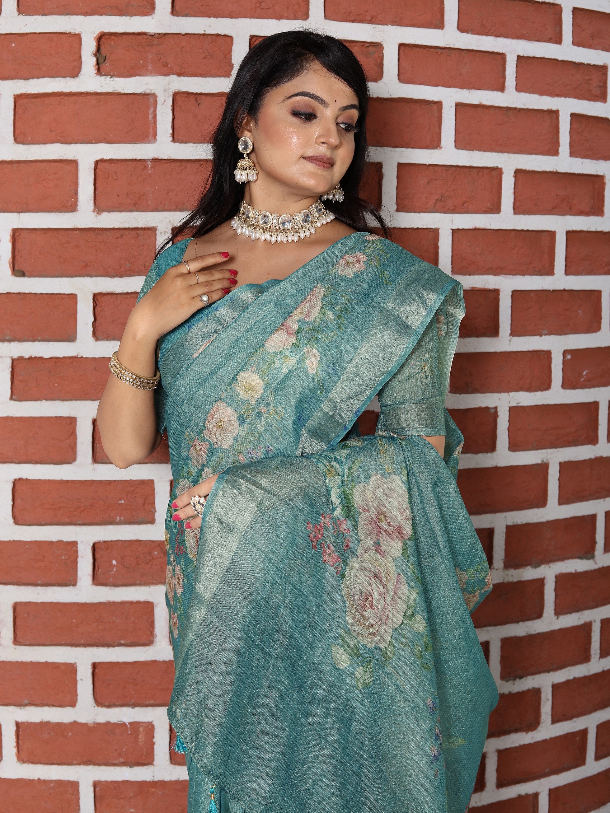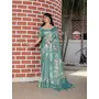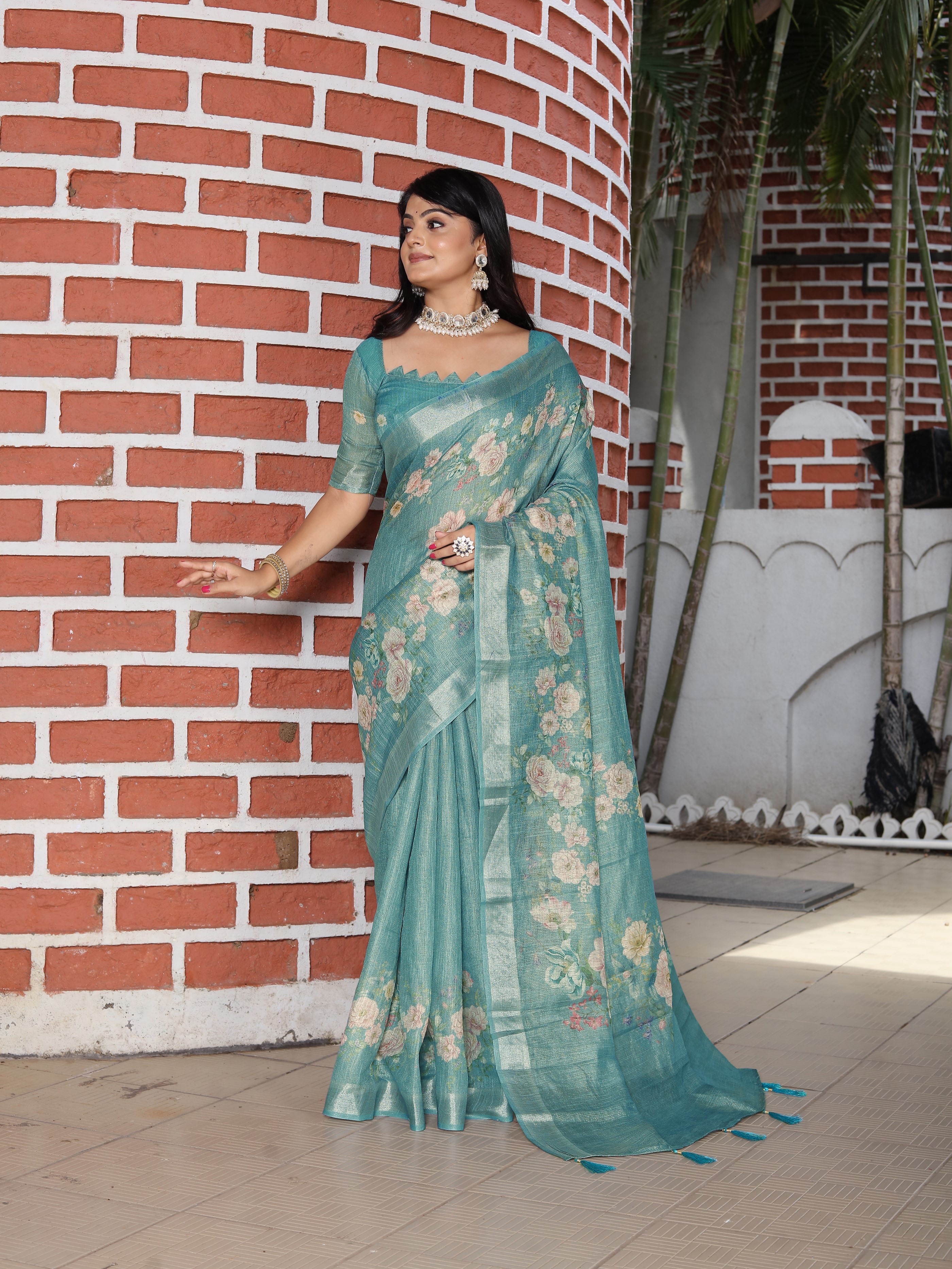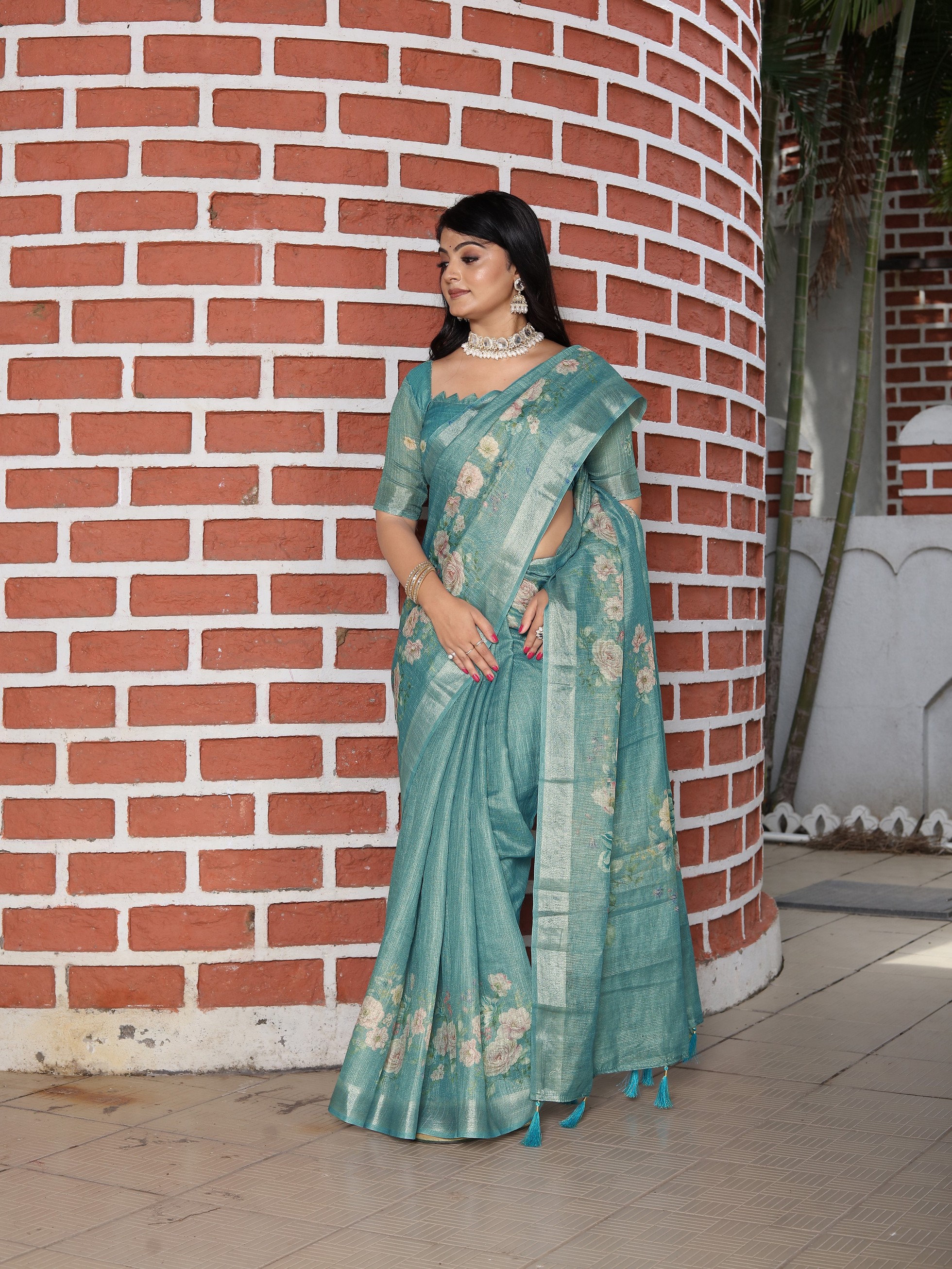 Sea Green Color Cotton Shimmer Fabric Smart Printed Saree With Woven Border
