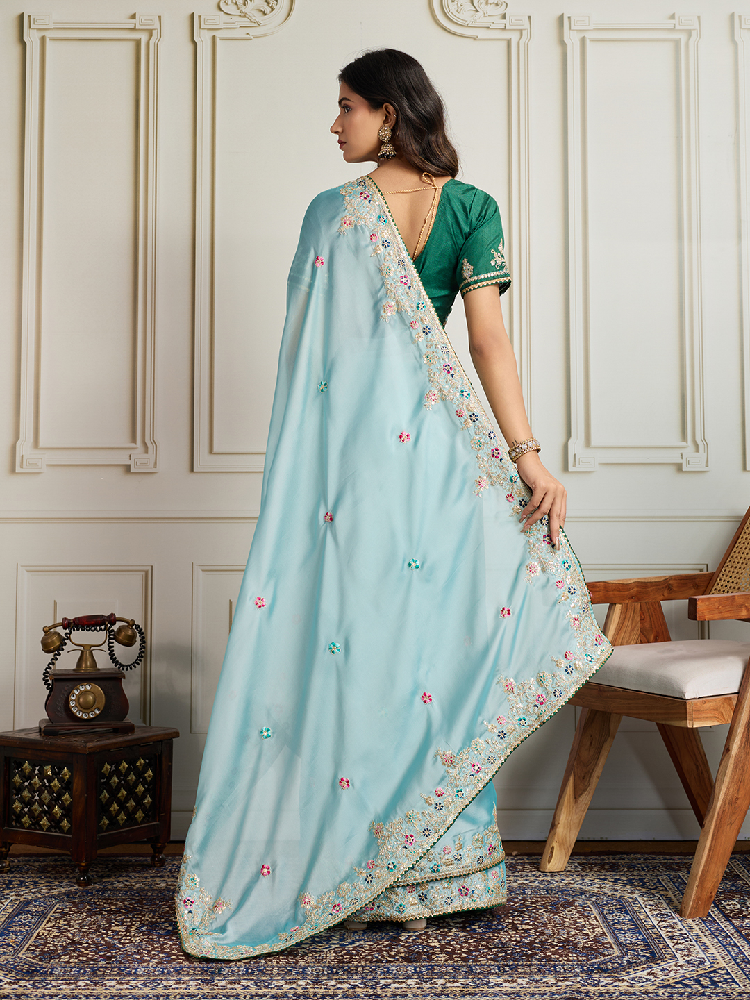 Sea Green Color Star Georgette Fabric Designer Embroidery Work Heavy Ceremonial Saree