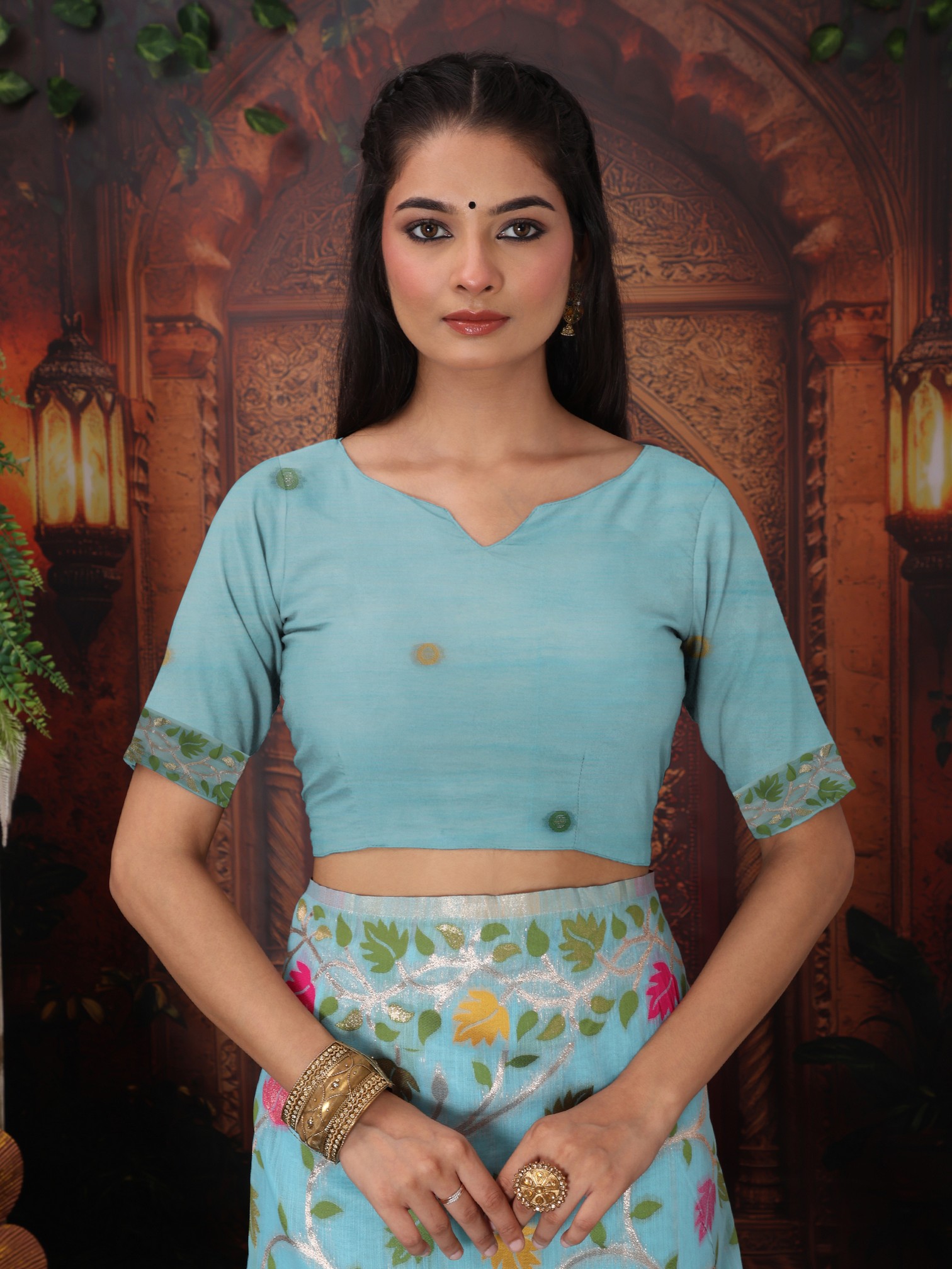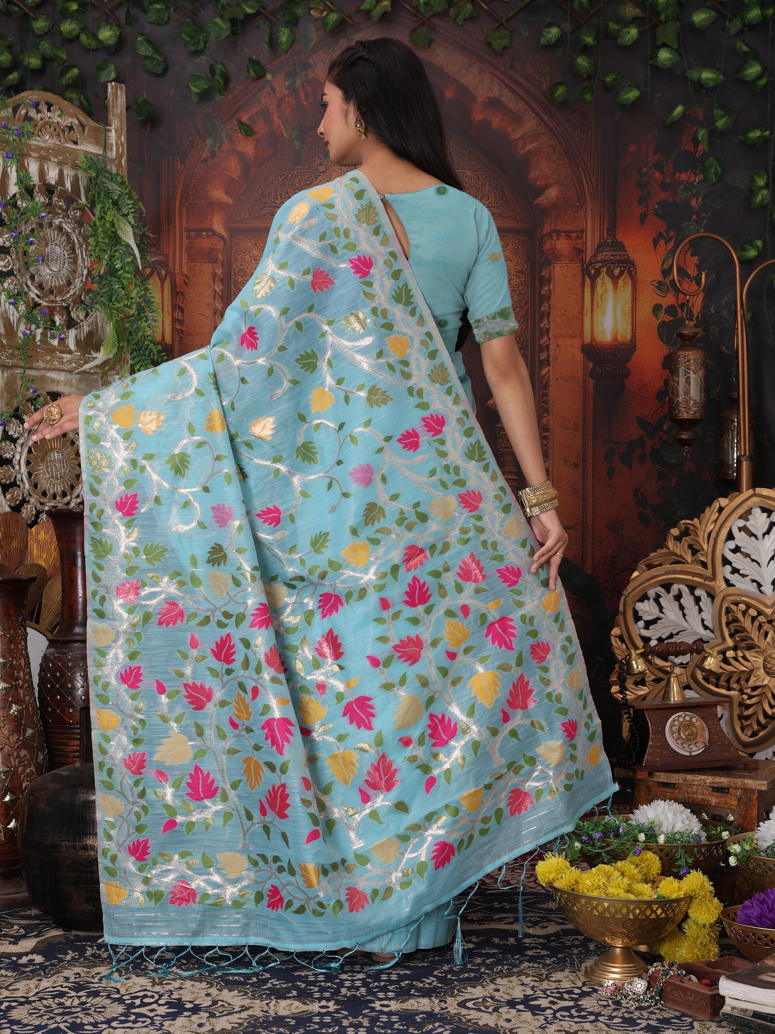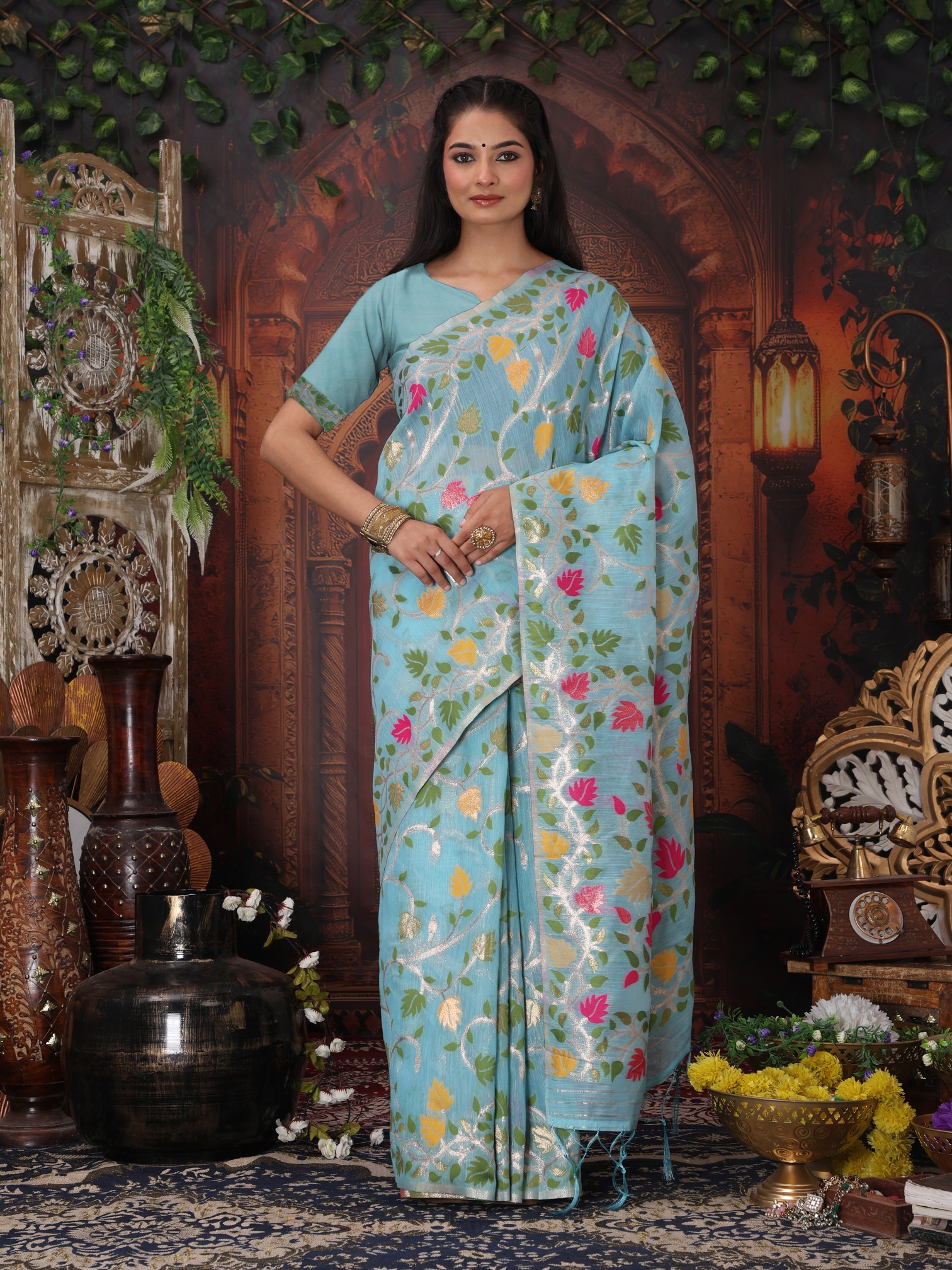 Sky Blue Color Linen Cotton Fabric Woven Designer Partywear Saree