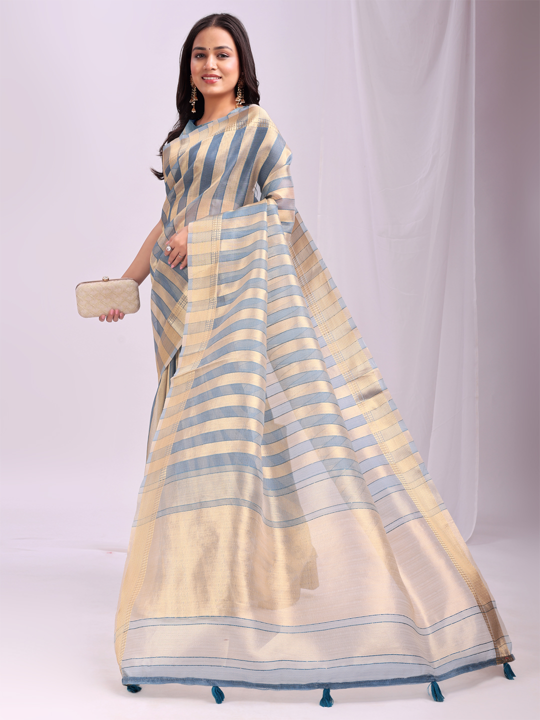 Sky Blue Color Organza Fabric Woven Patta Designer Trendy Ethnic Saree