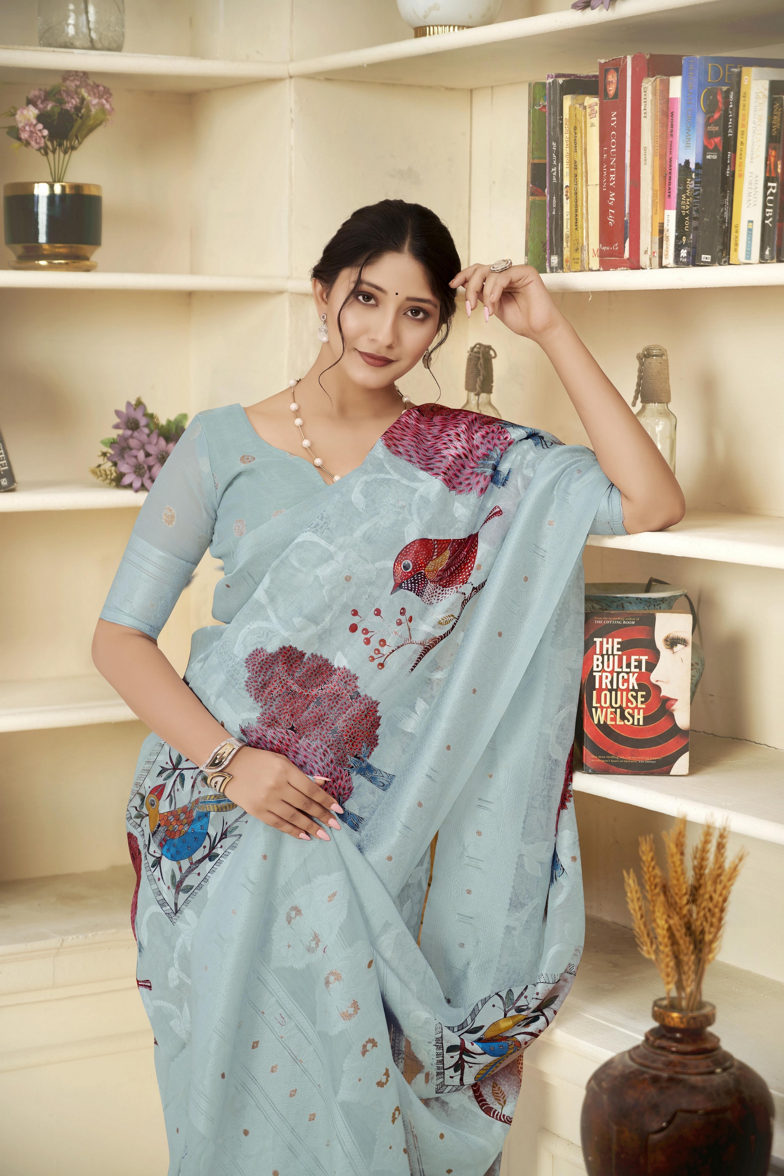 Sky Blue Color Wevon Jacquard Designer With Printed Rich Silk Fabric Stylish Ceremonial Saree