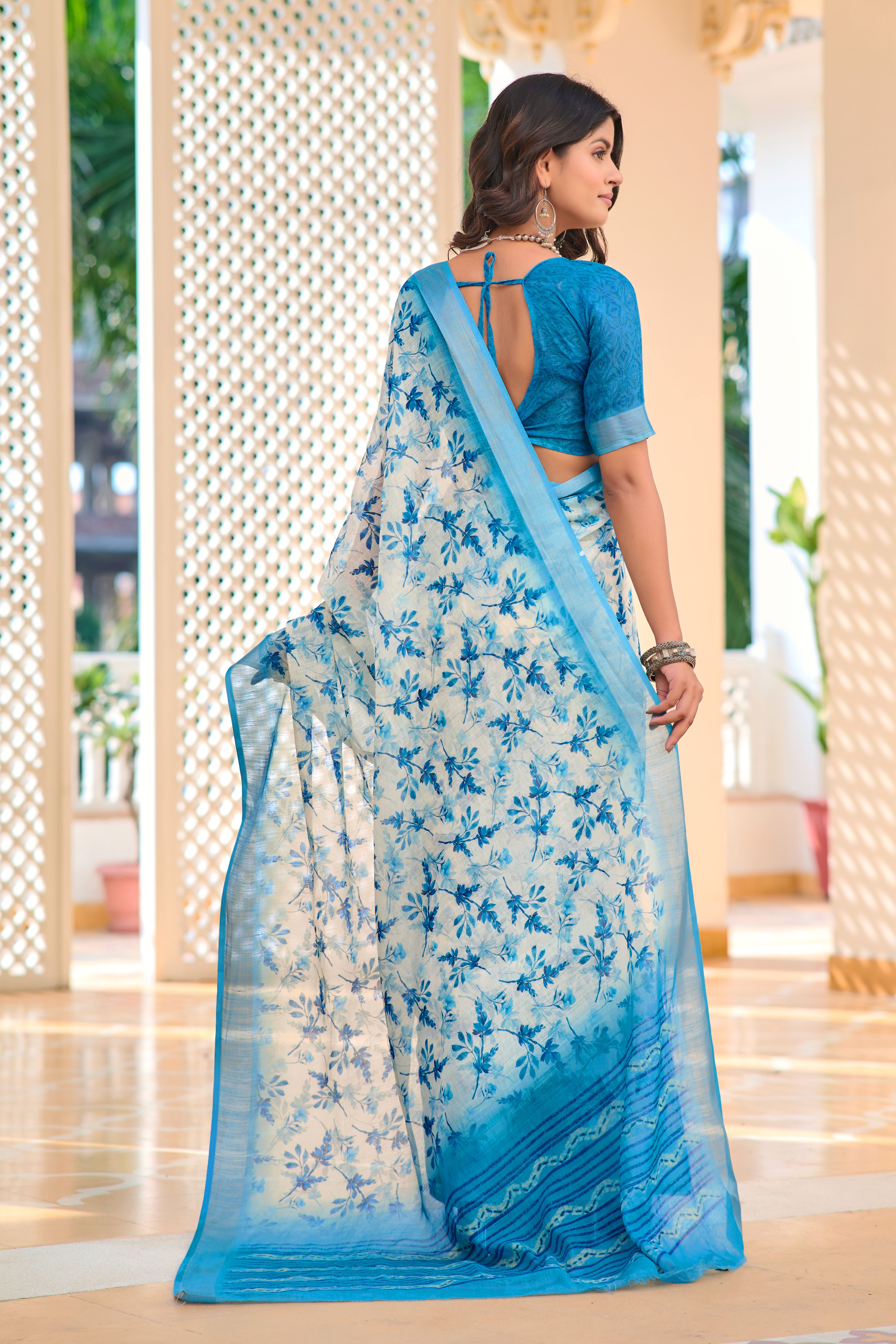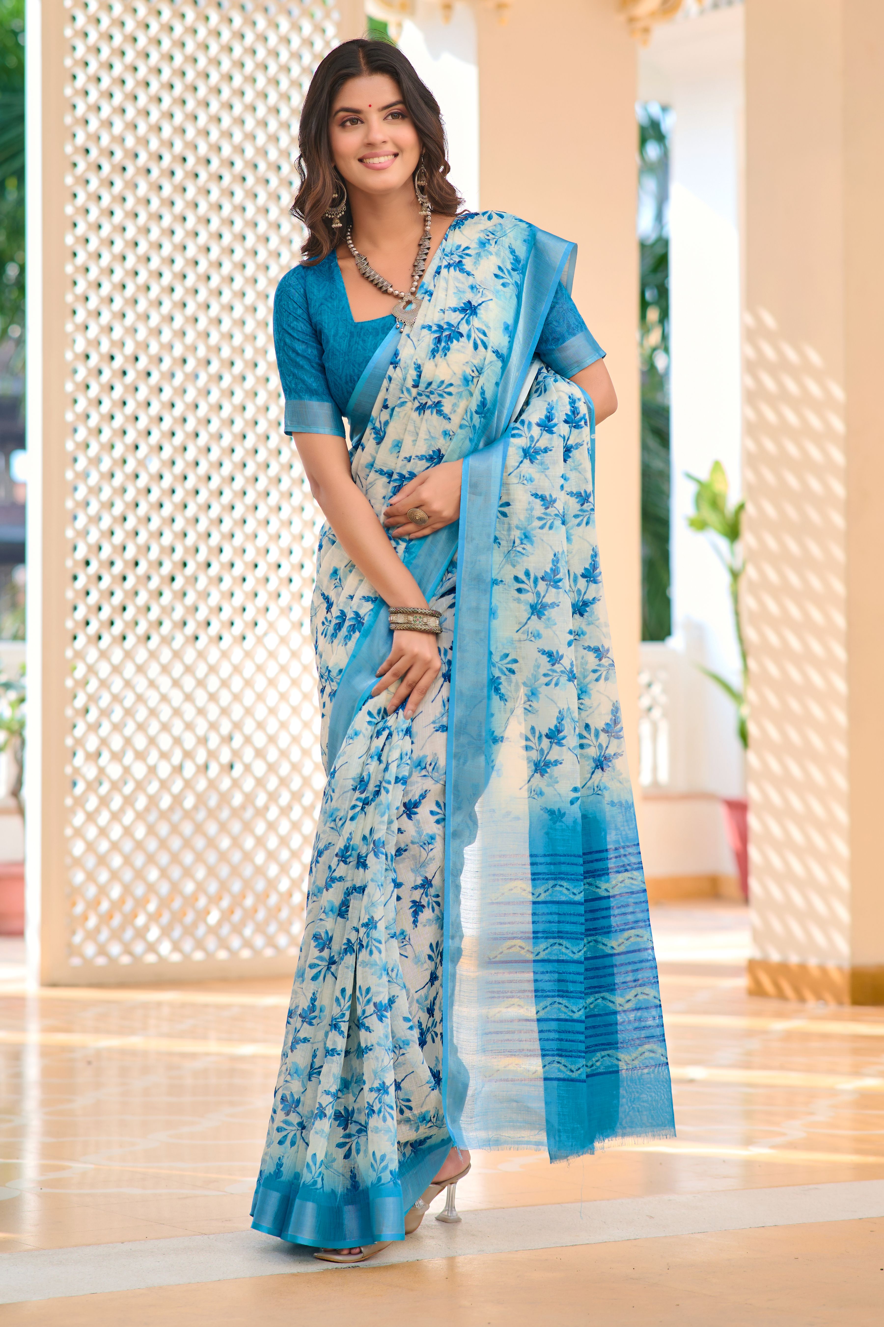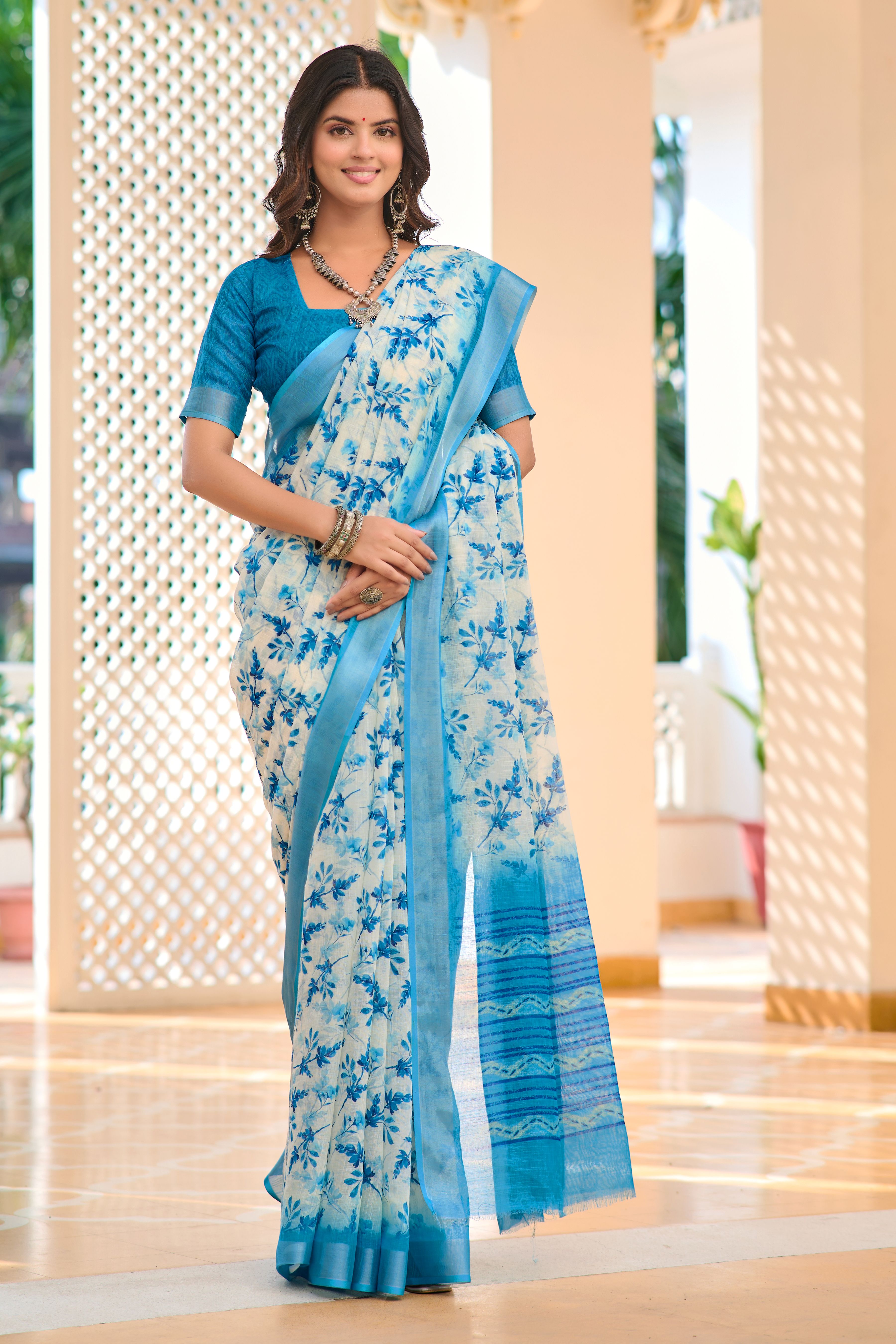 Garb These Festive Saree in Fine Colored.These Saree Are Linen Cotton And Blouse is Fabricated On Linen Cotton Pair.Its Beautified With Woven Jari Border With Designer Digital Printed.