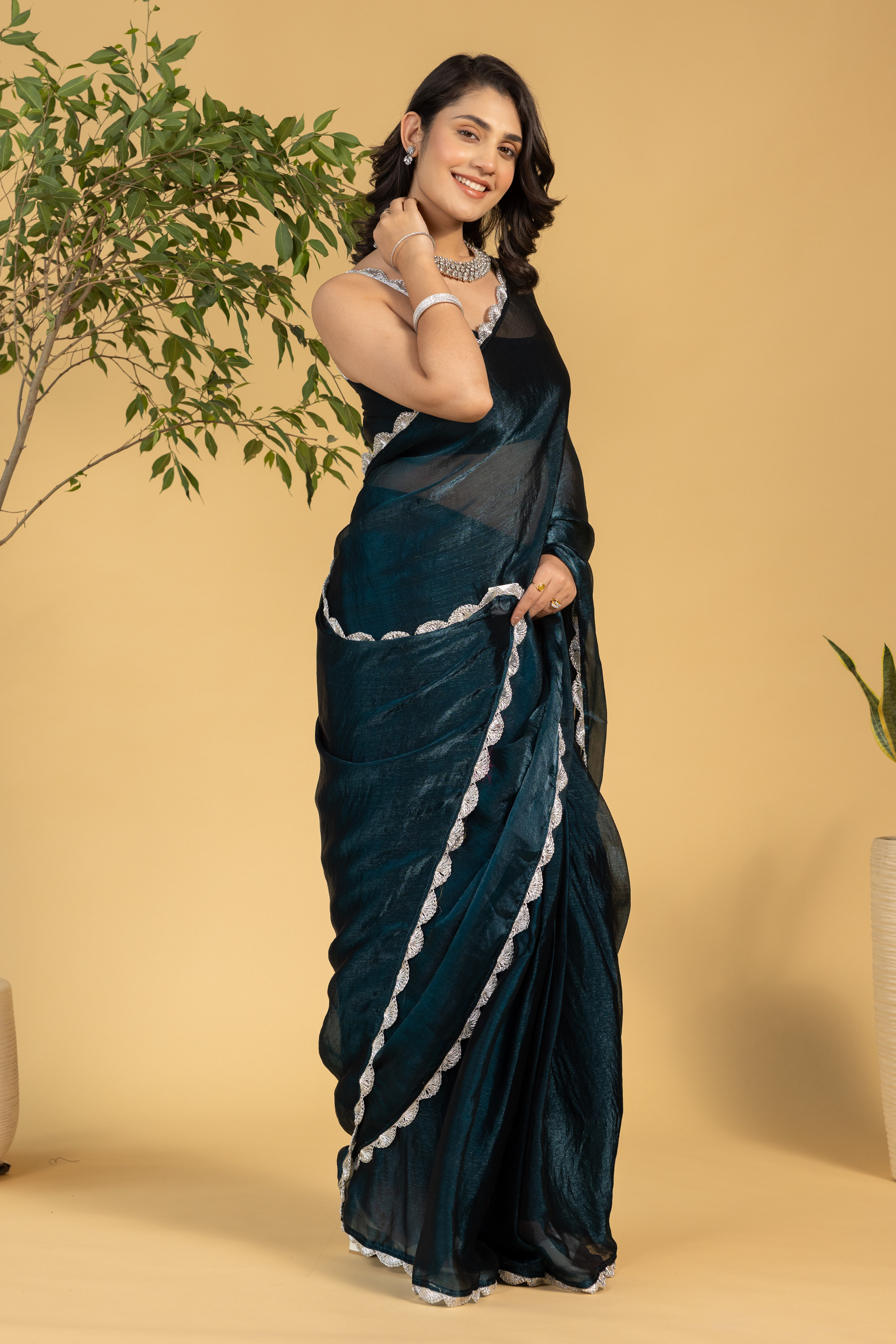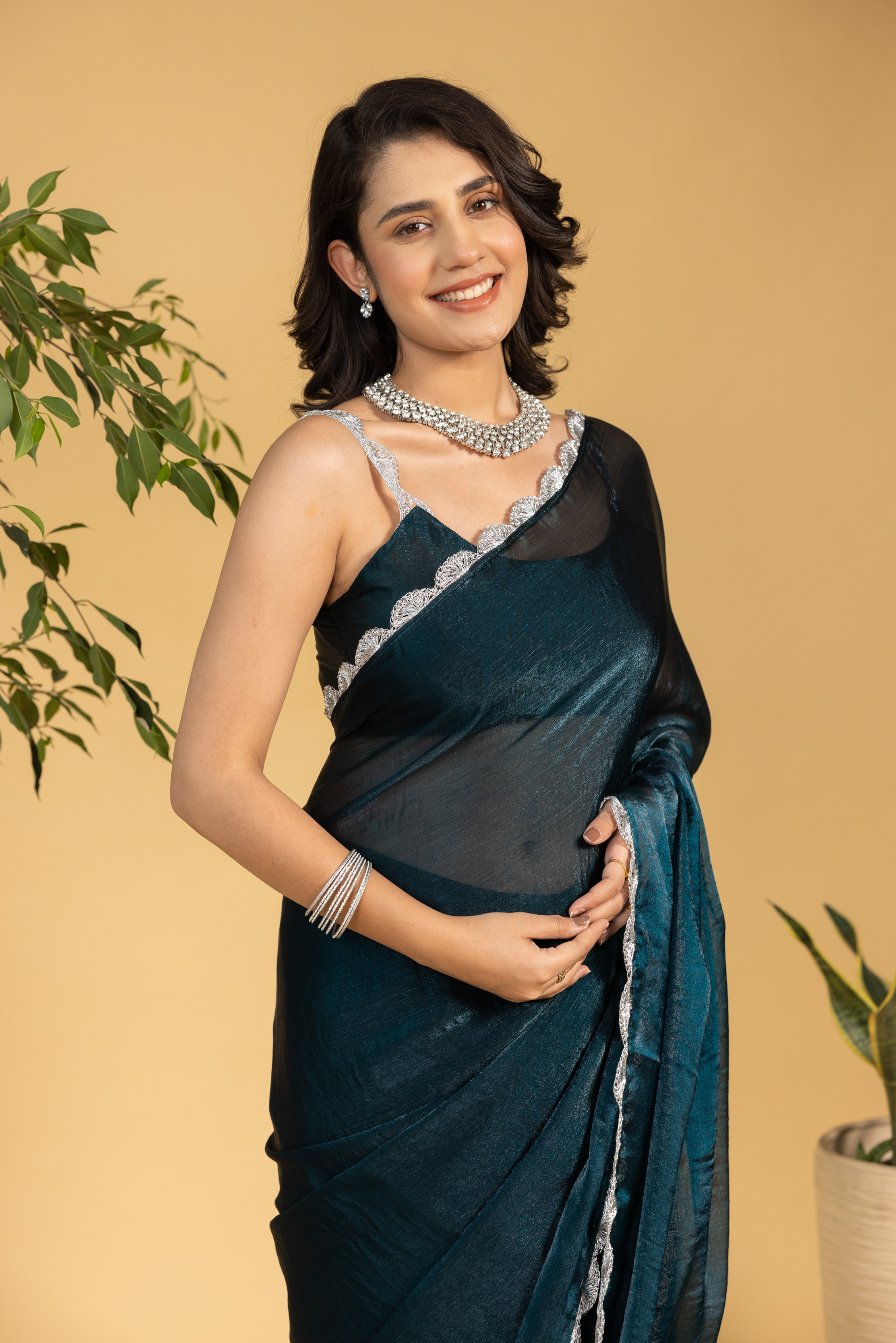 Teal Blue Color Chiffon Fabric Ready To Wear Saree For Graceful Bollywood Style Saree
