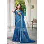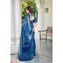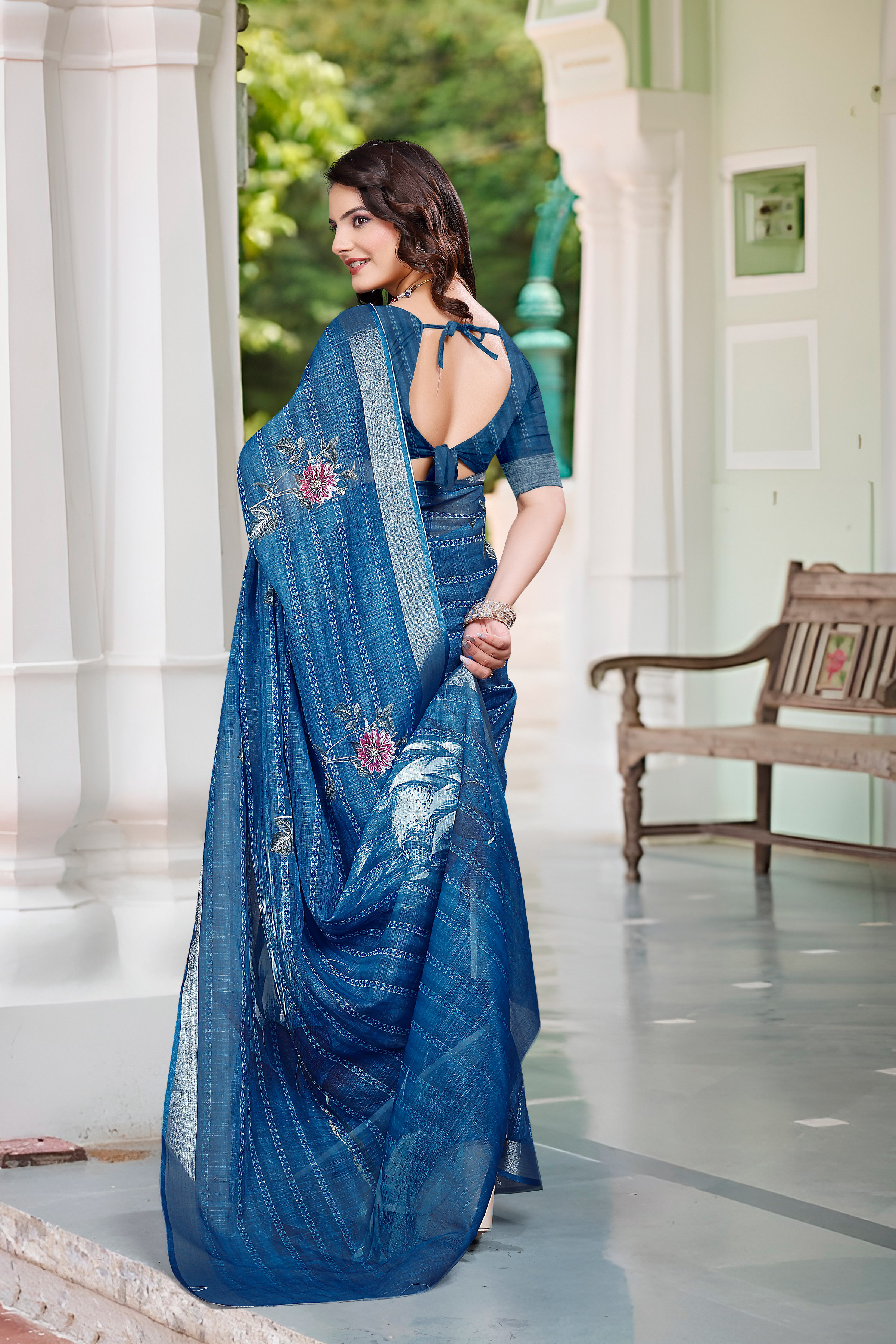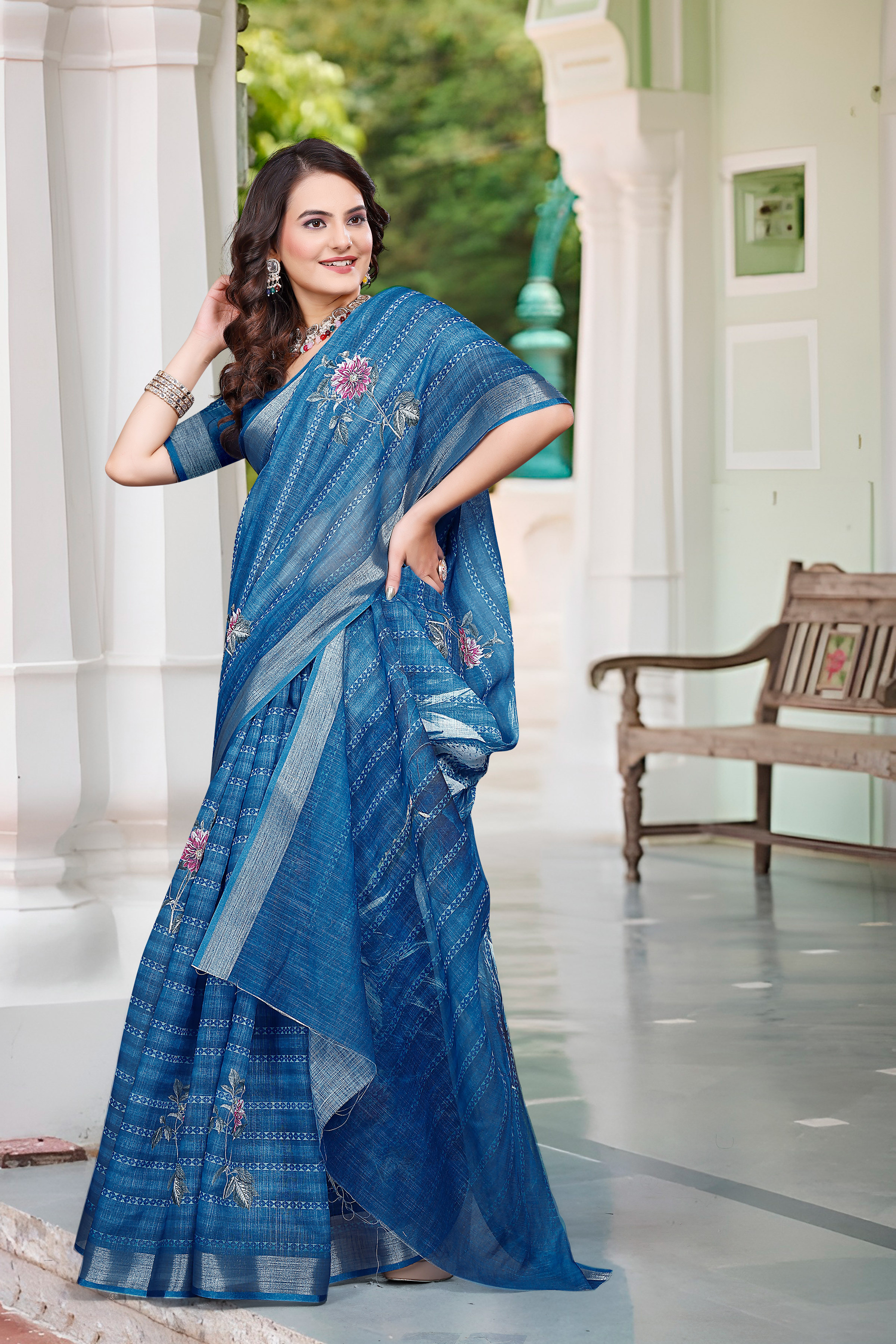 Teal Blue Color Linen Cotton Saree With Smart Partywear Printed Looks