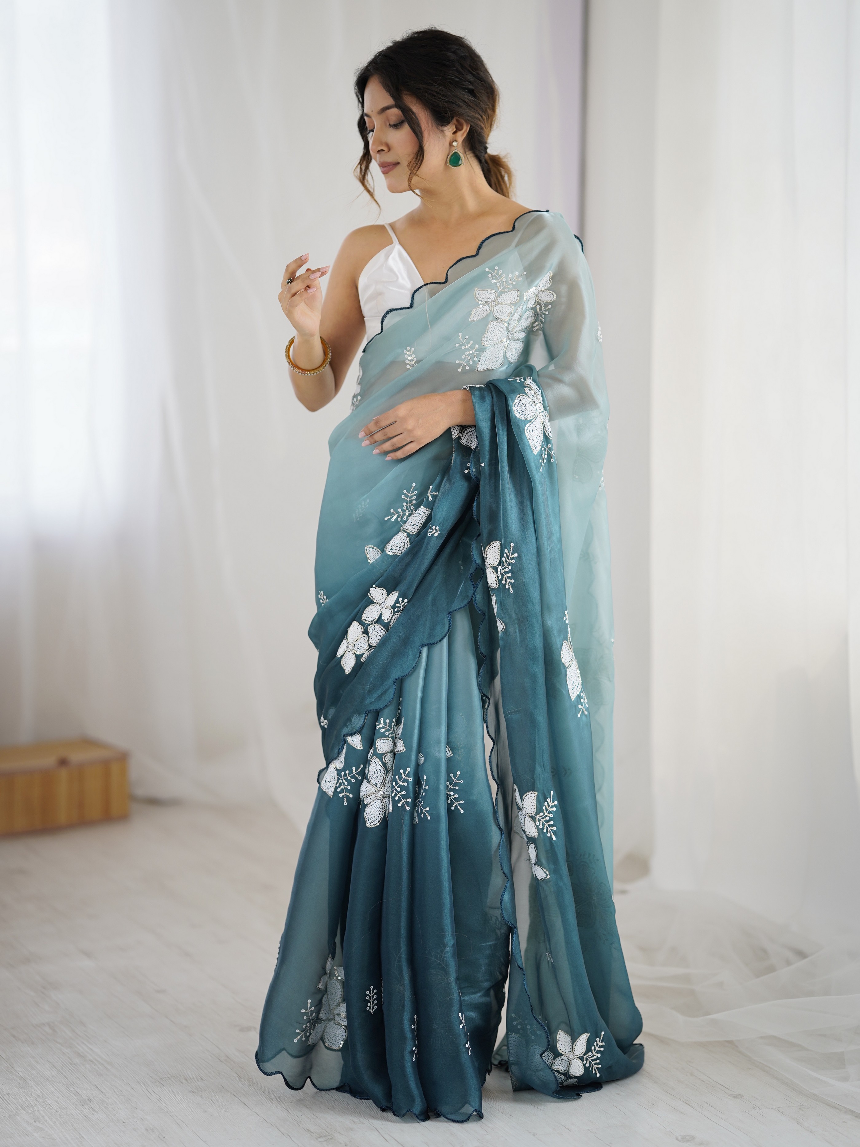 Teal Color Glamorous Jimmy Choo Fabric Beautiful Embroidered Saree