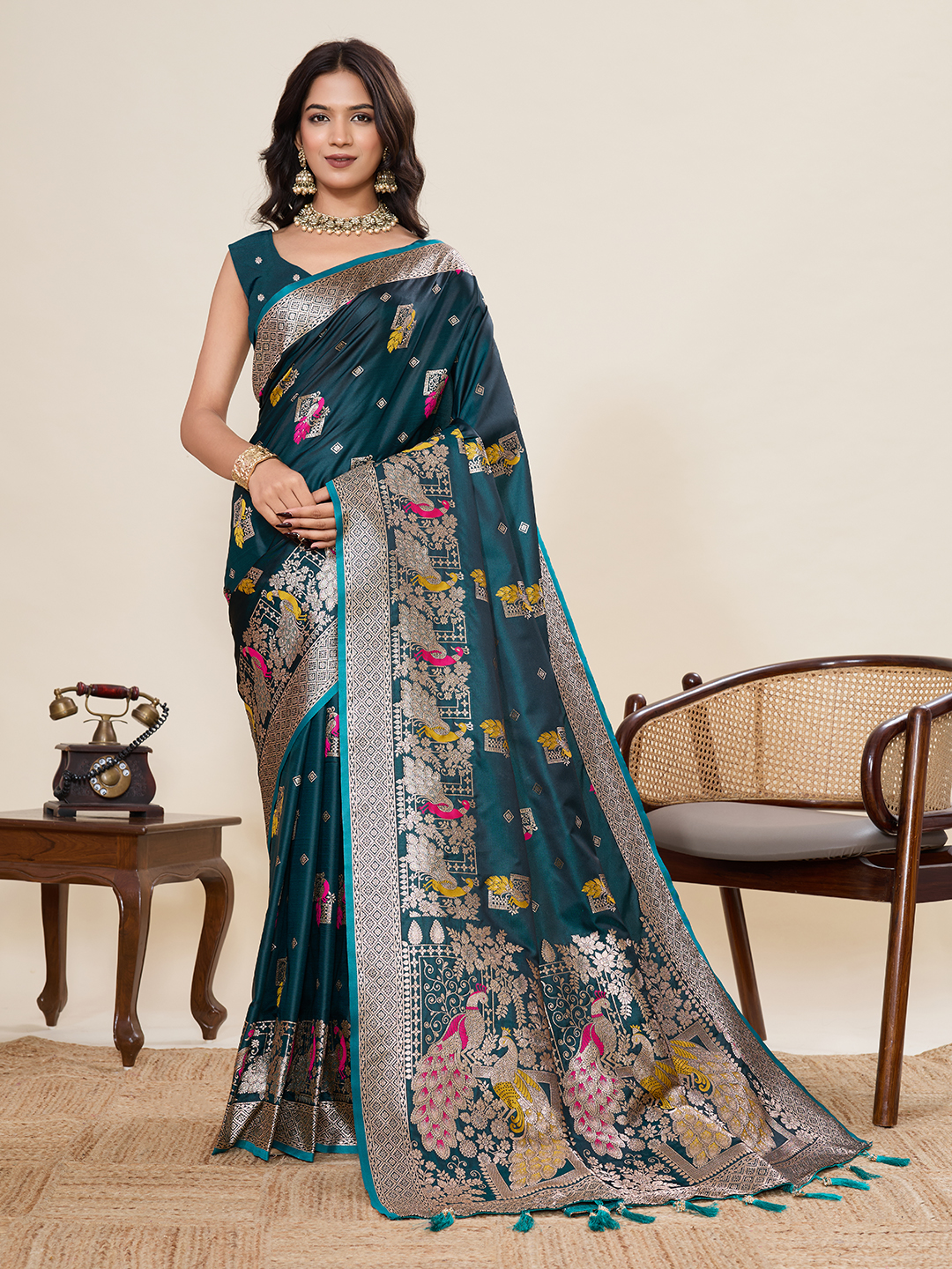 Teal Color Two Tone Satin Silk Saree For Rich Sophisticated Looks
