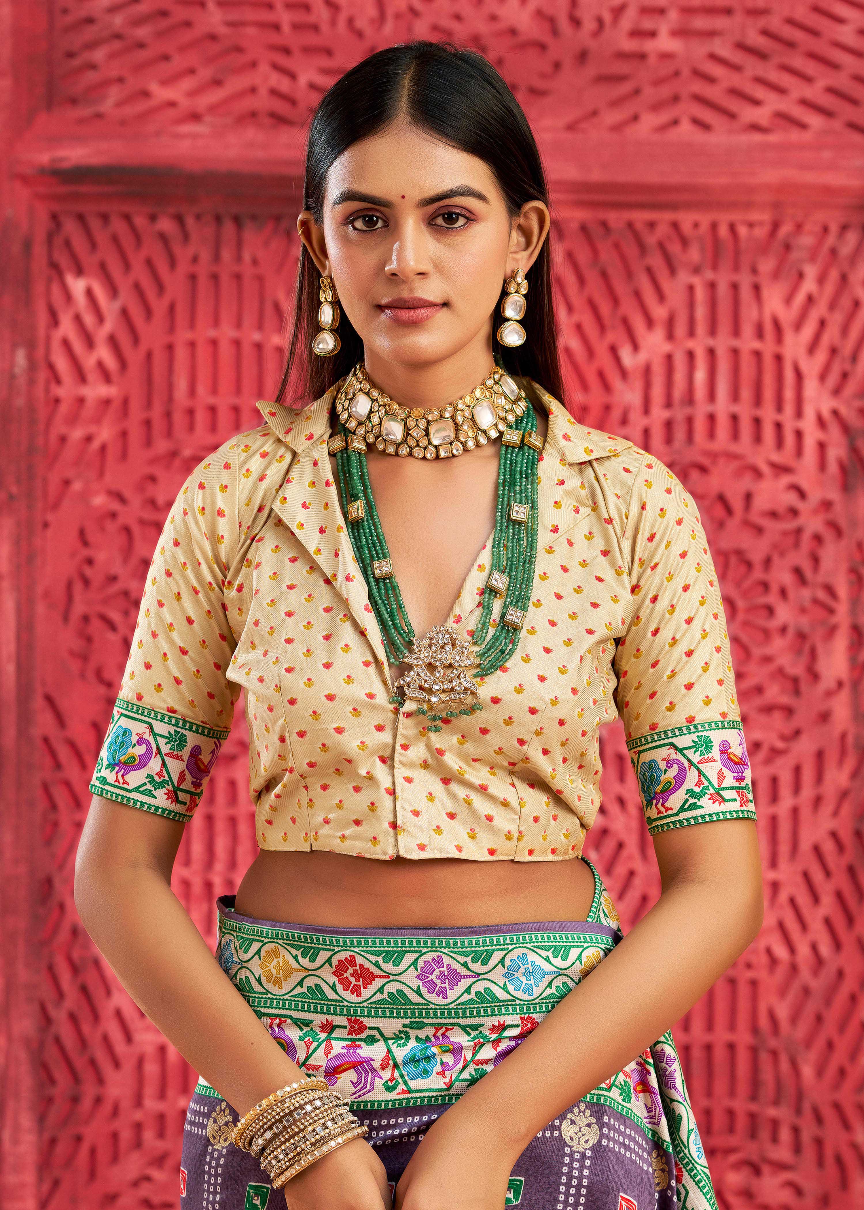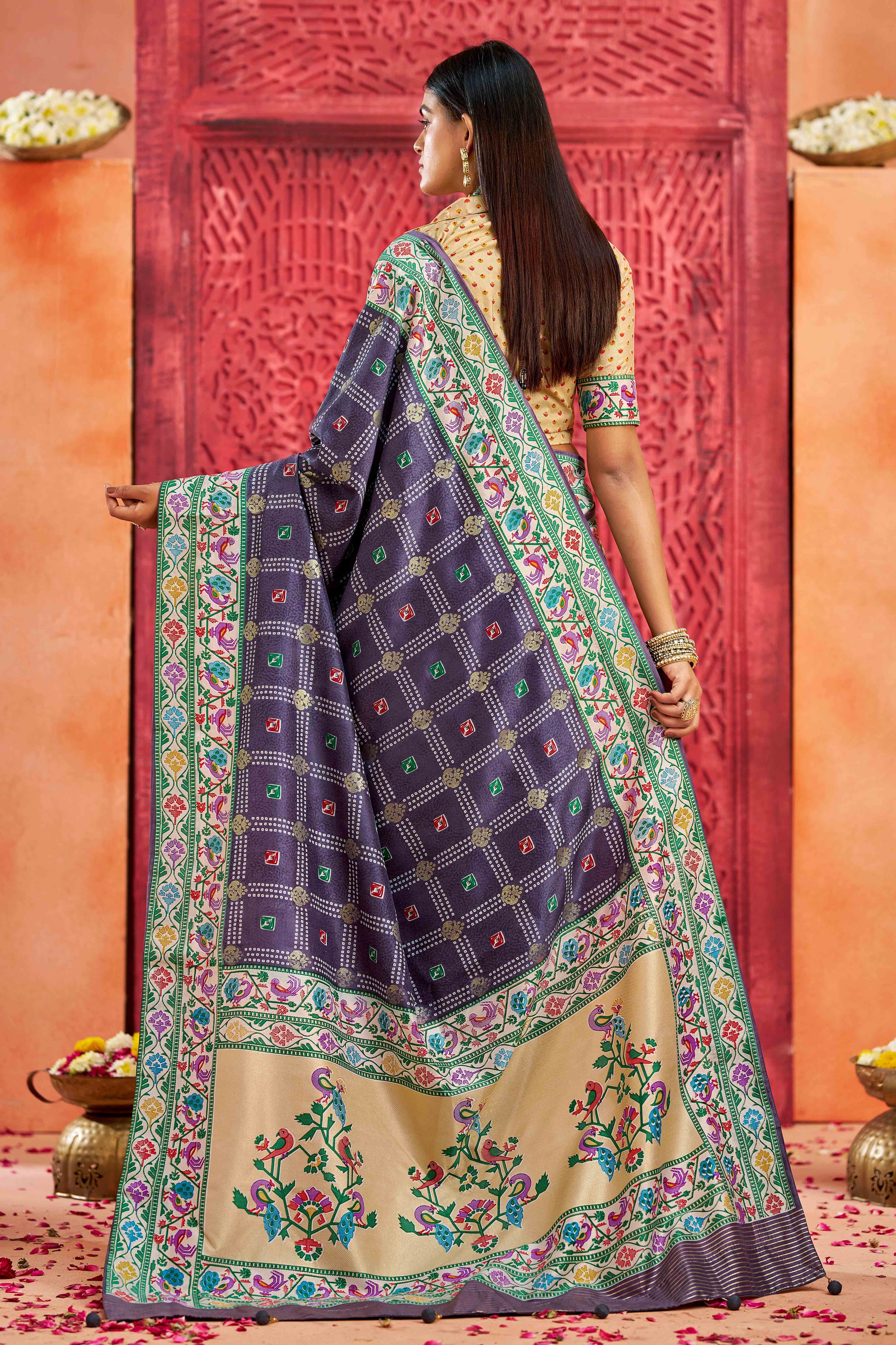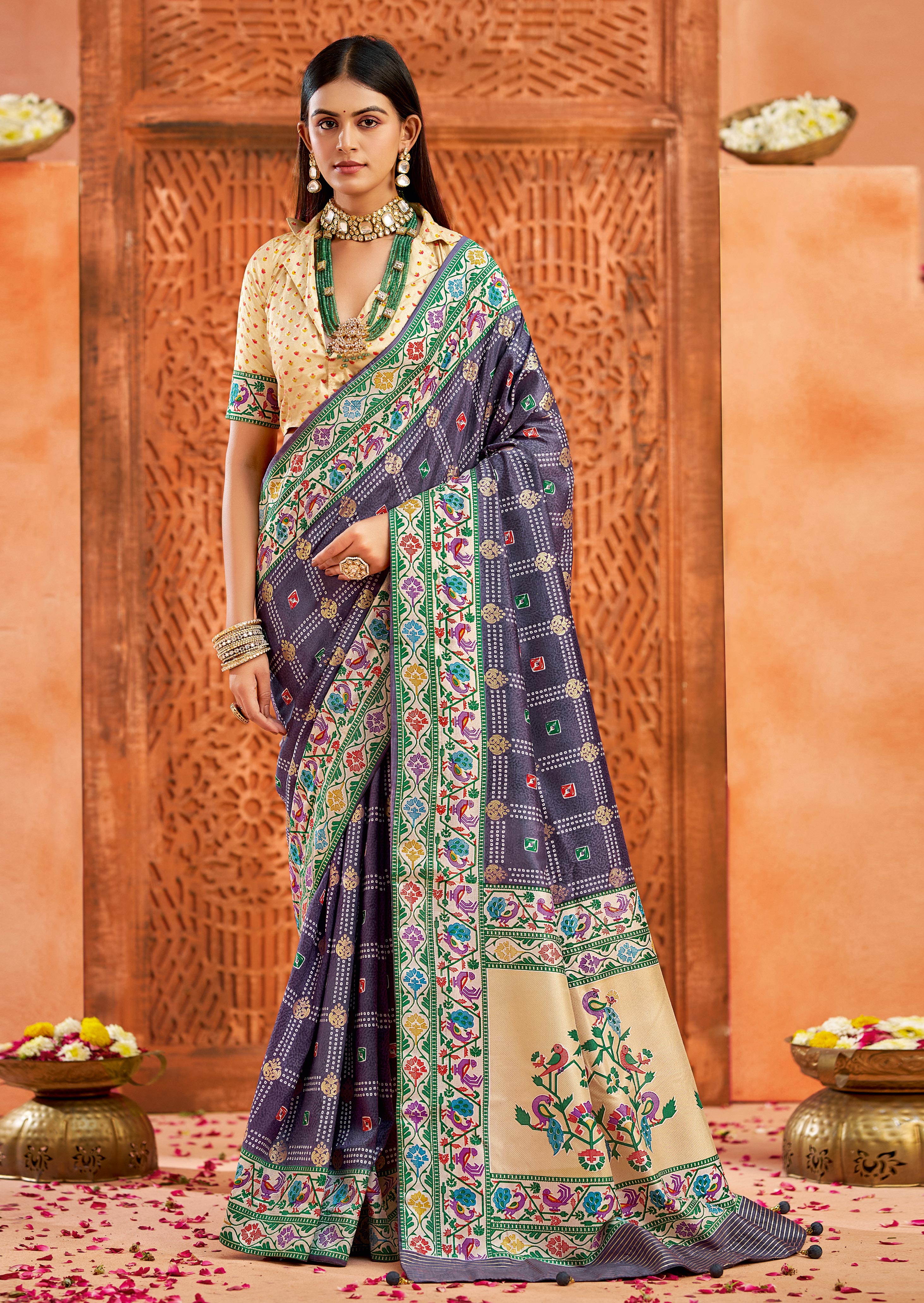 Violet Indigo Color Velvet Tussar Silk Fabric Partywear Saree With Paithani Pallu And Traditional Ghatchola Print