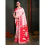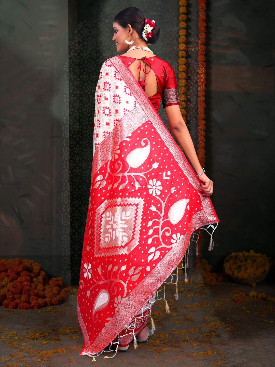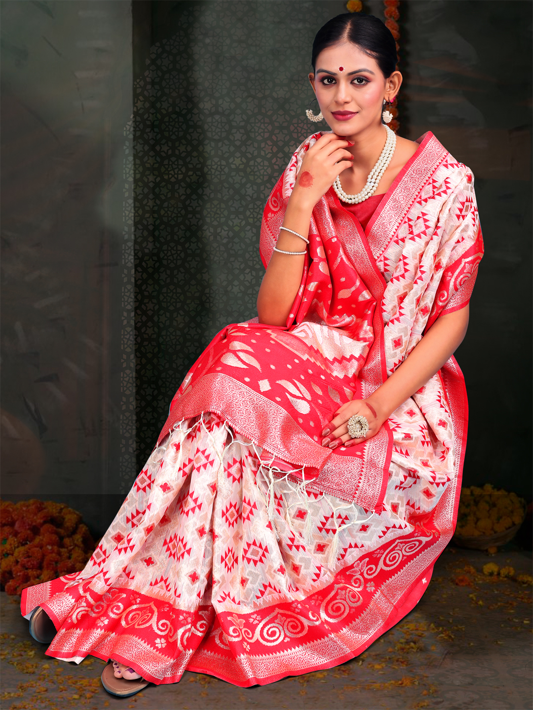 White & Red Color Linen Cotton Wevon Jacquard Designer Saree