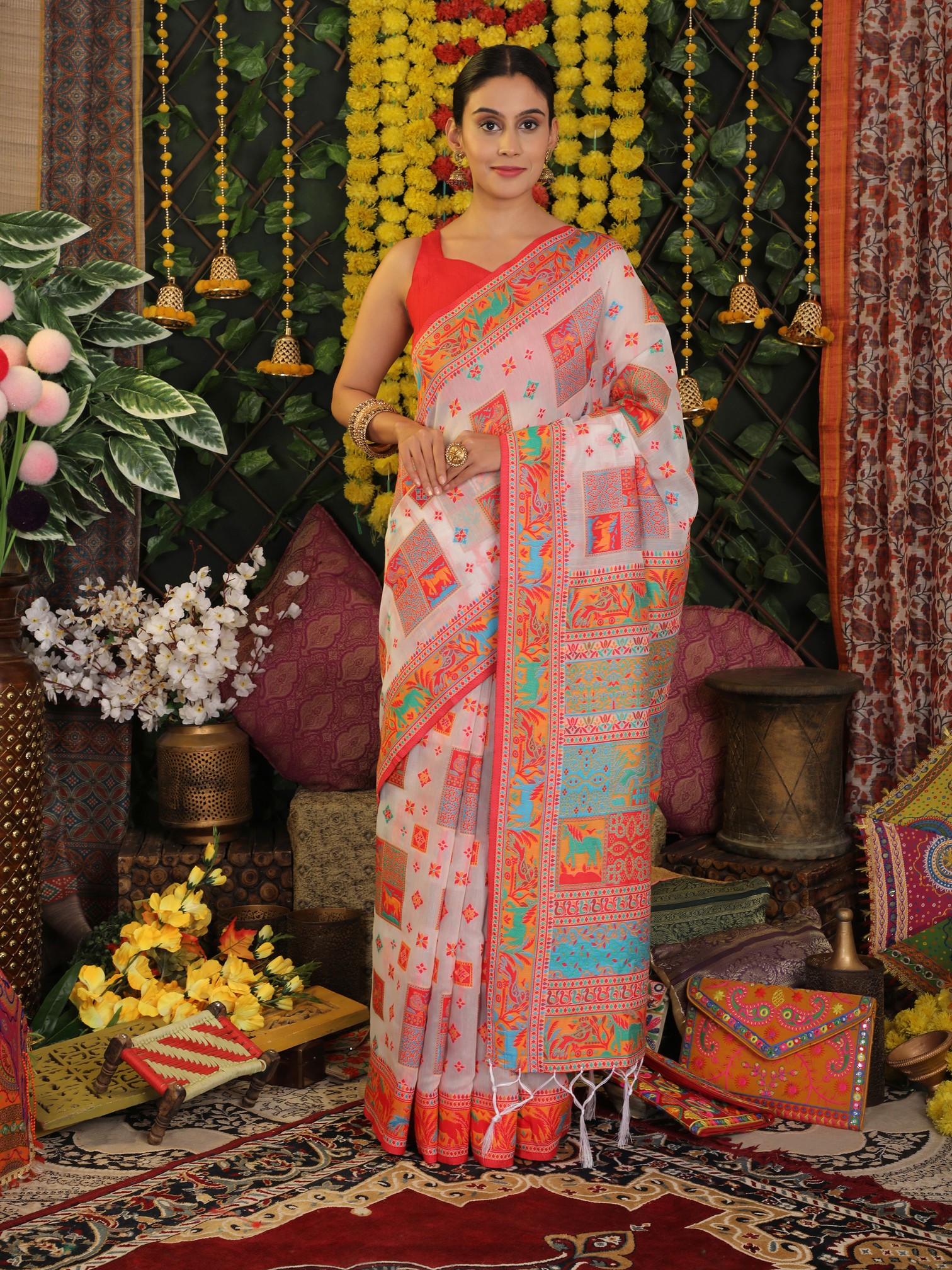 White Color Linen Cotton Fabric Resham Woven Designer Partywear Saree