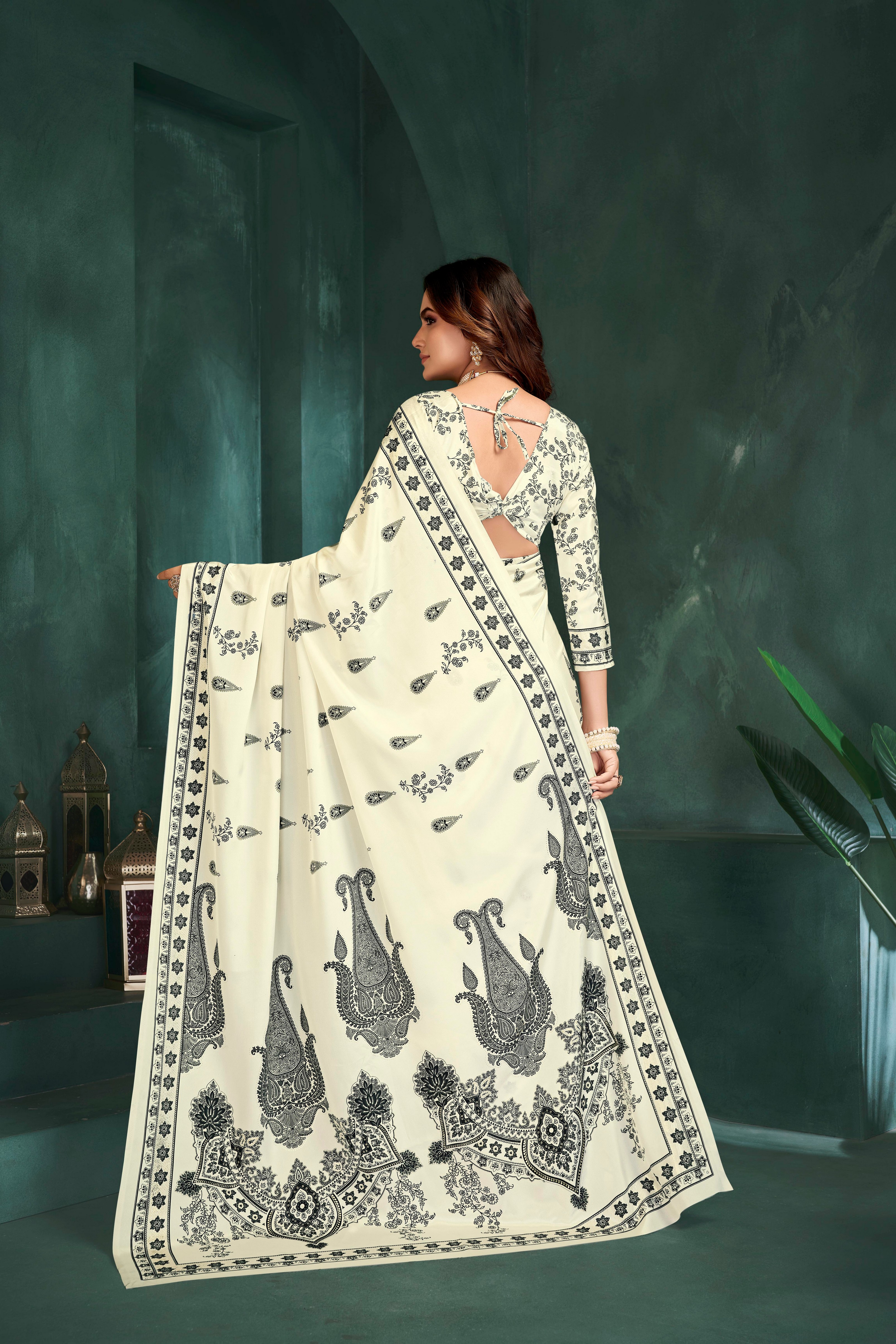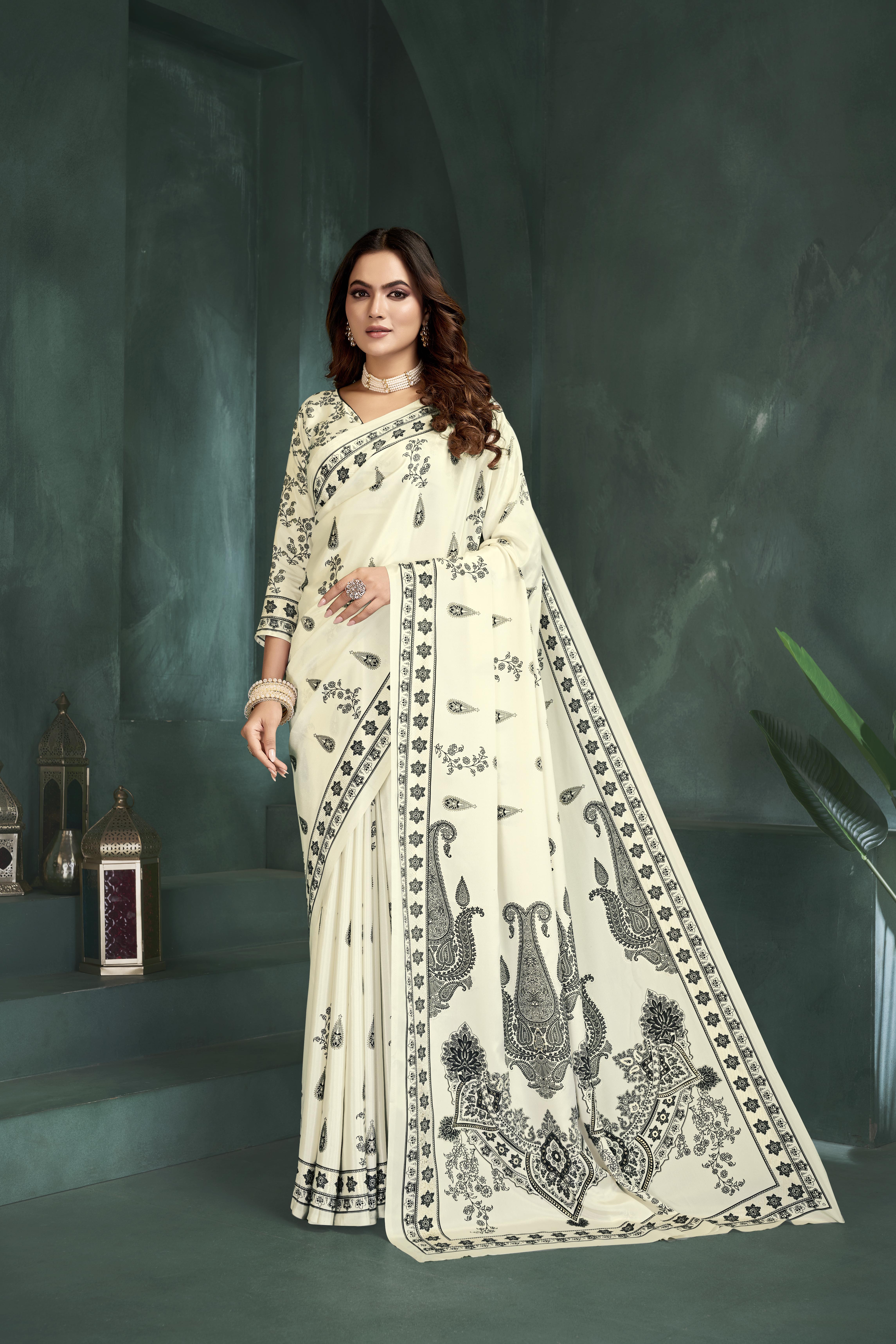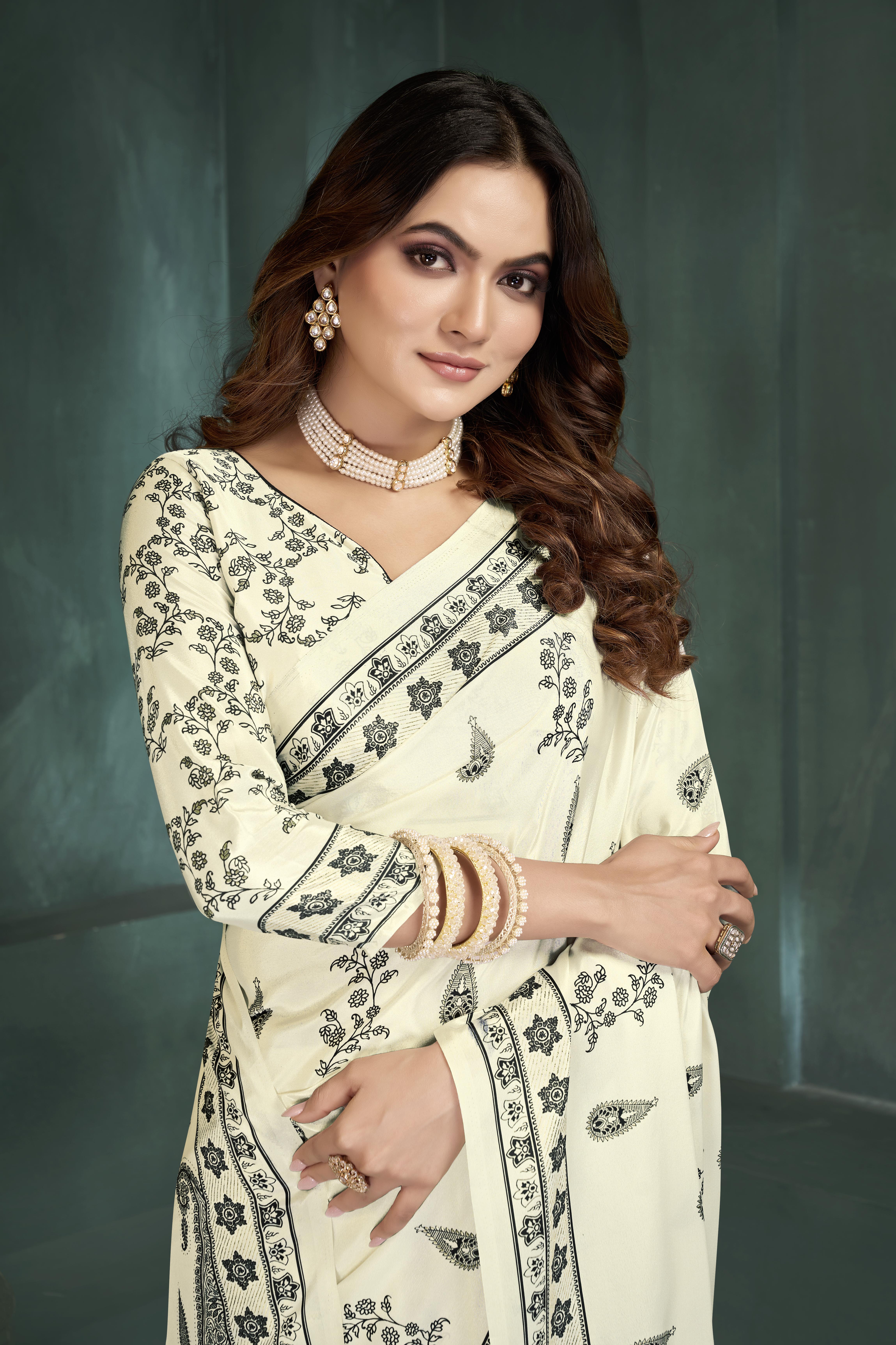 White Color Sophisticated Position Digital Foil Printed Crepe Silk Saree