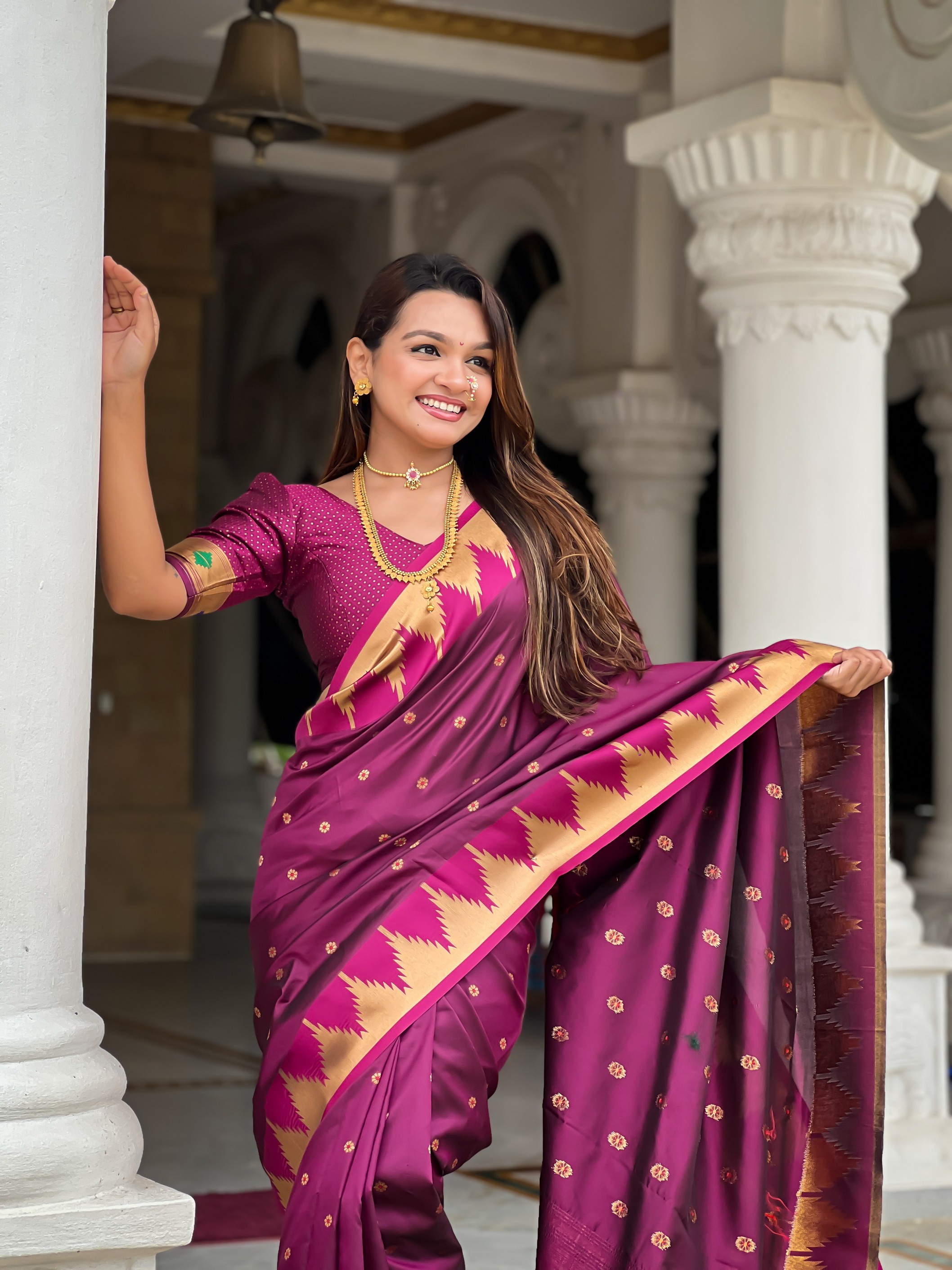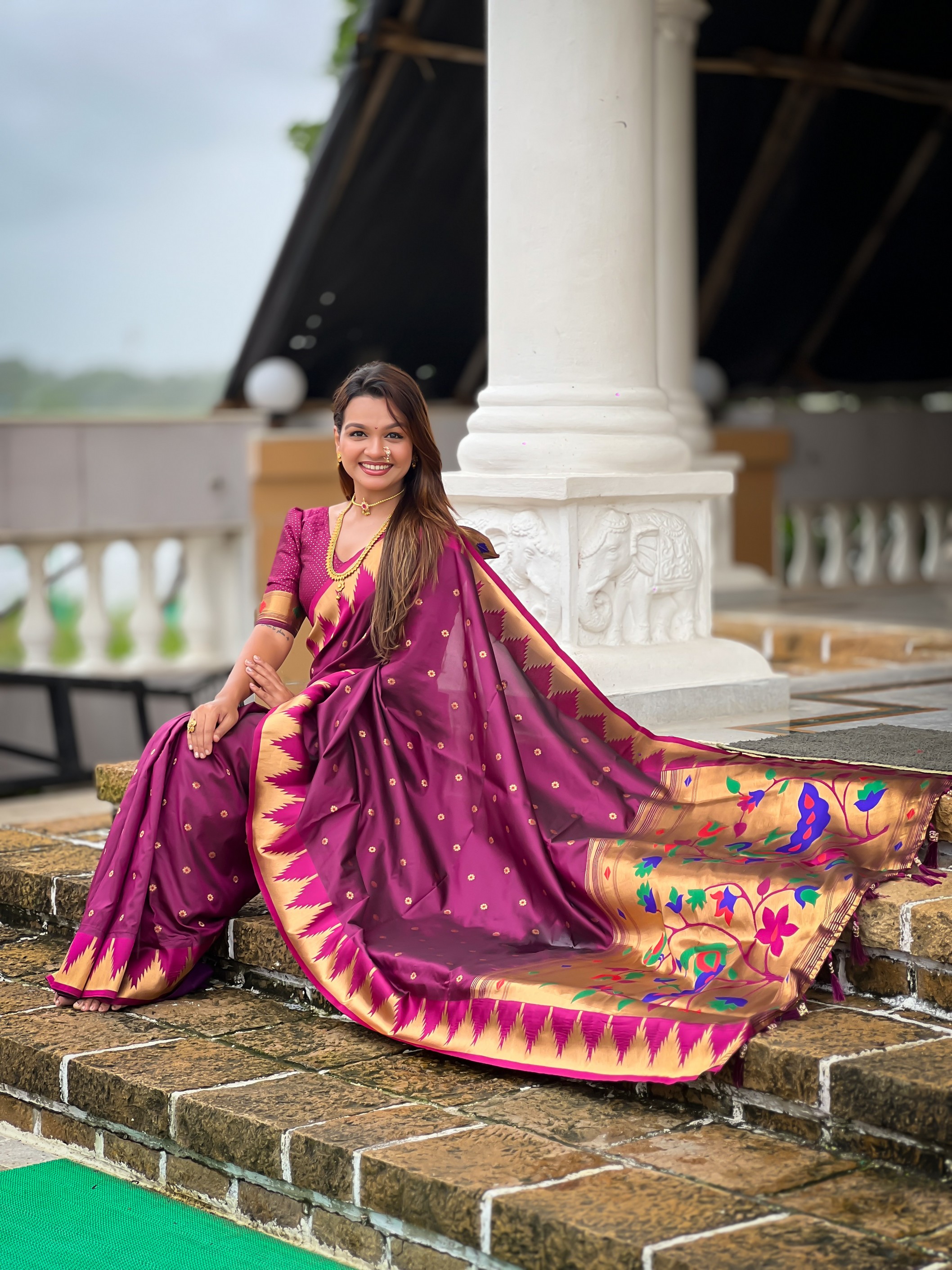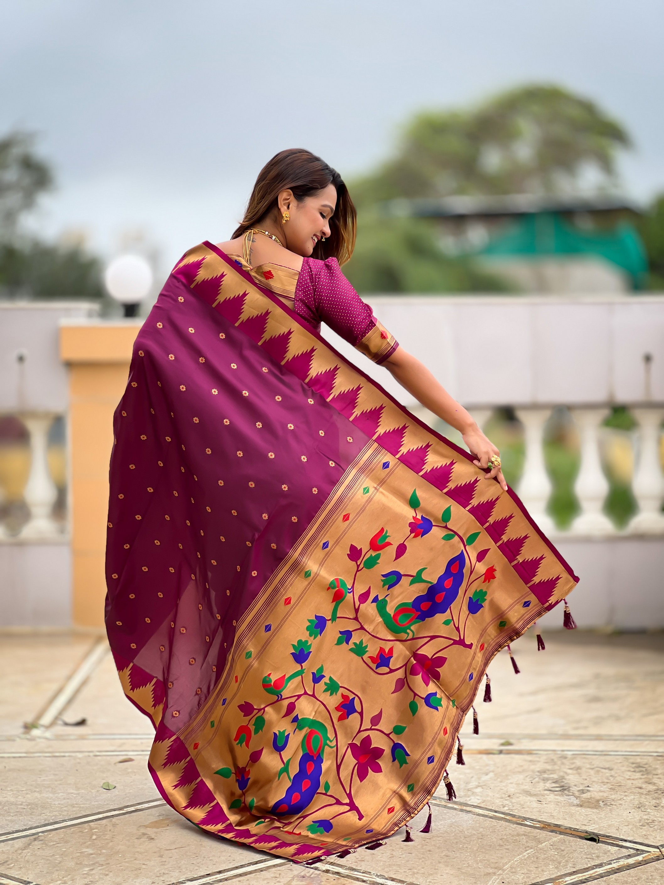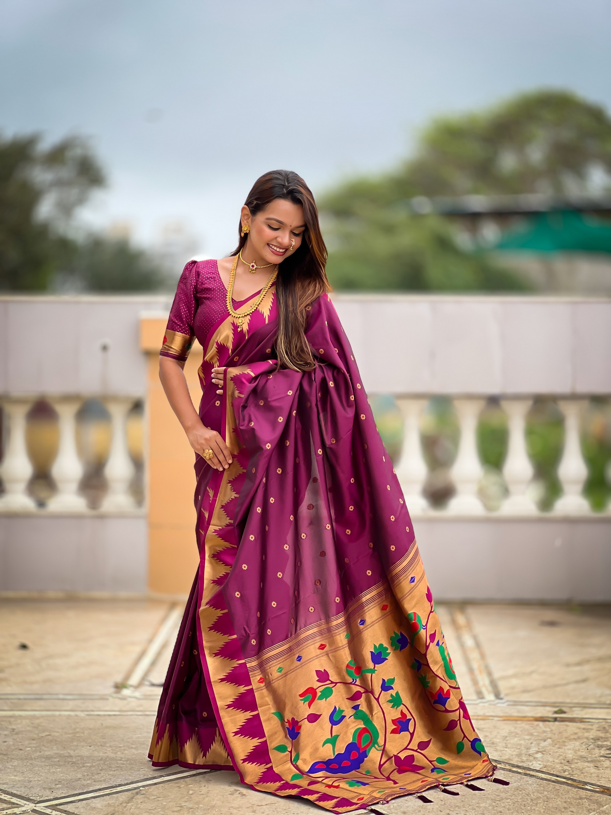 Wine Color Sophisticated Paithani Silk Fabric Woven Jacquard Meenakari Designer Saree
