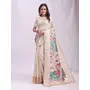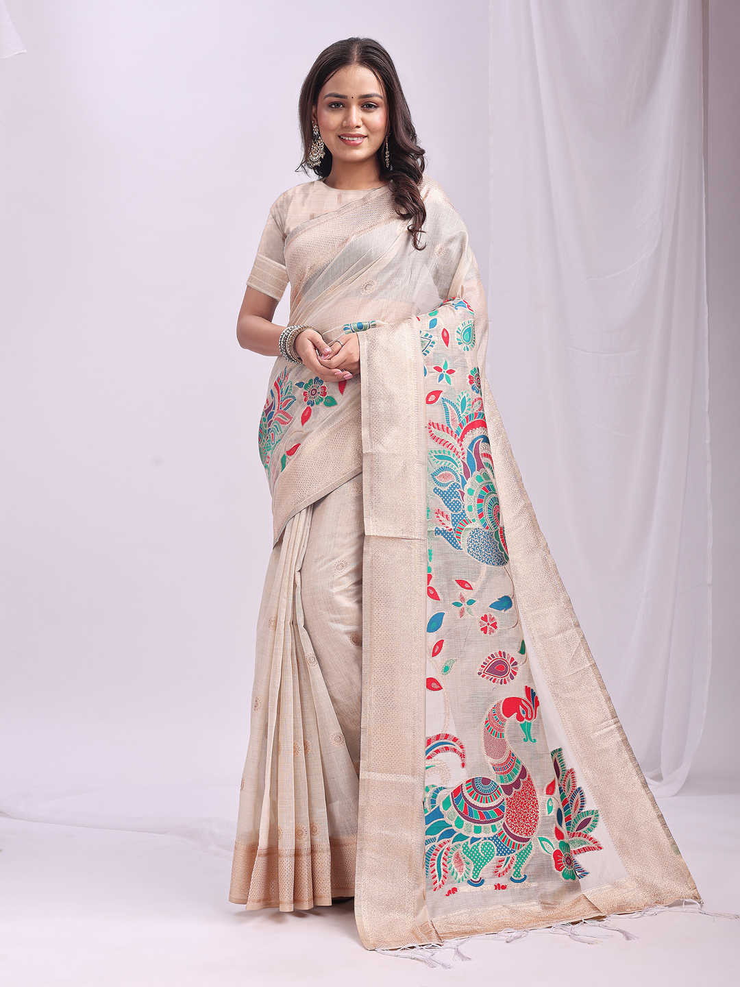 Woven Jacquard Designer Cream Color Linen Cotton Fabric Ceremonial Saree