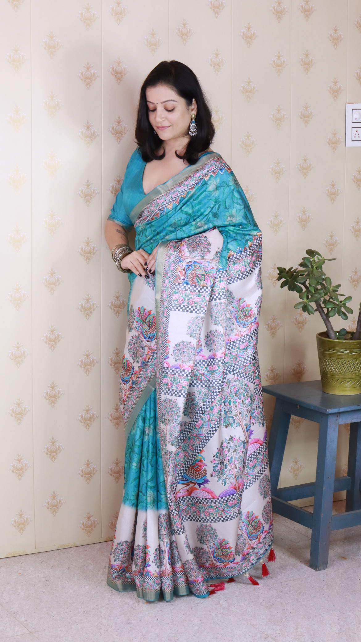 Woven Jari Border Designer Madhubani Digital Printed Sea Green Color Tussar Silk Saree
