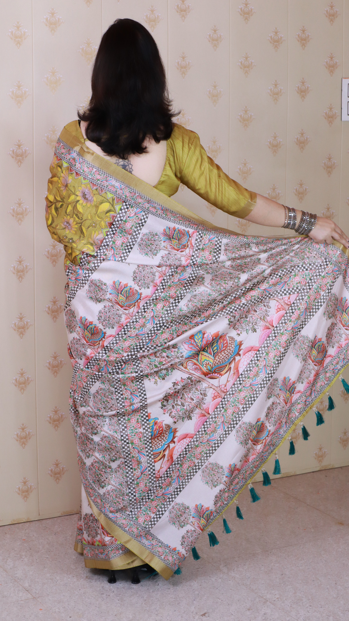 Woven Jari Border Designer Madhubani Digital Printed Yellow Color Tussar Silk Saree