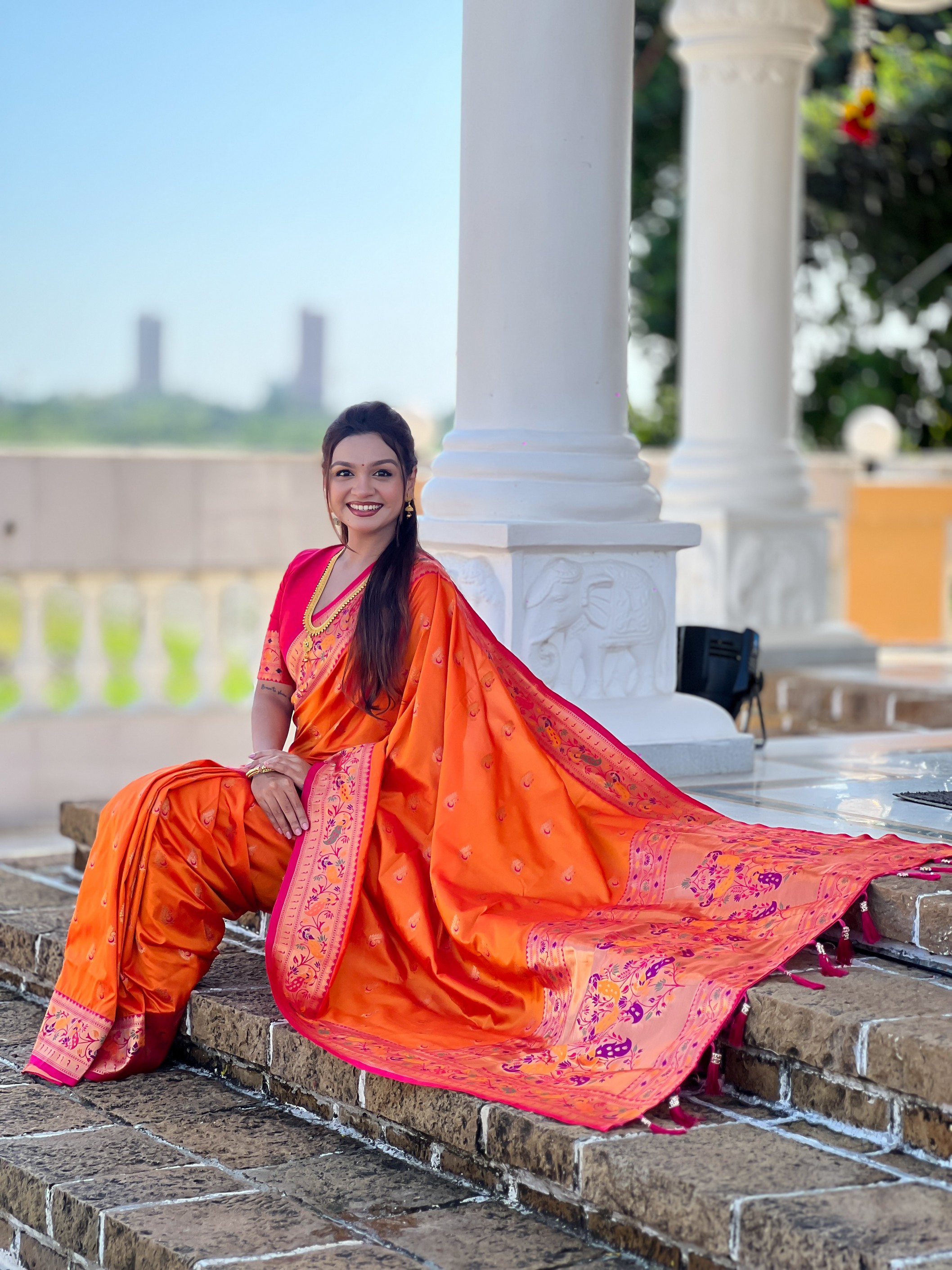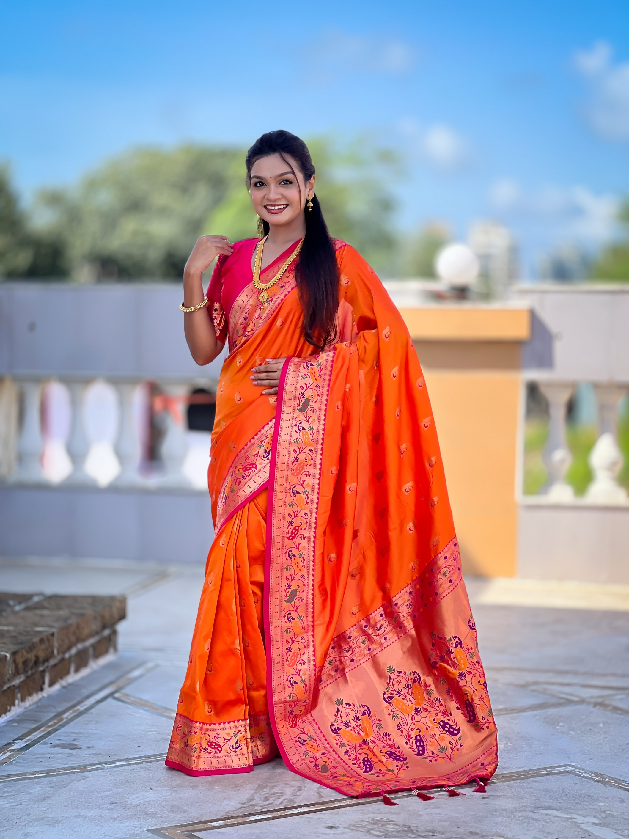 Woven Meenakari Jacquard Designer Orange Color Paithani Silk Saree