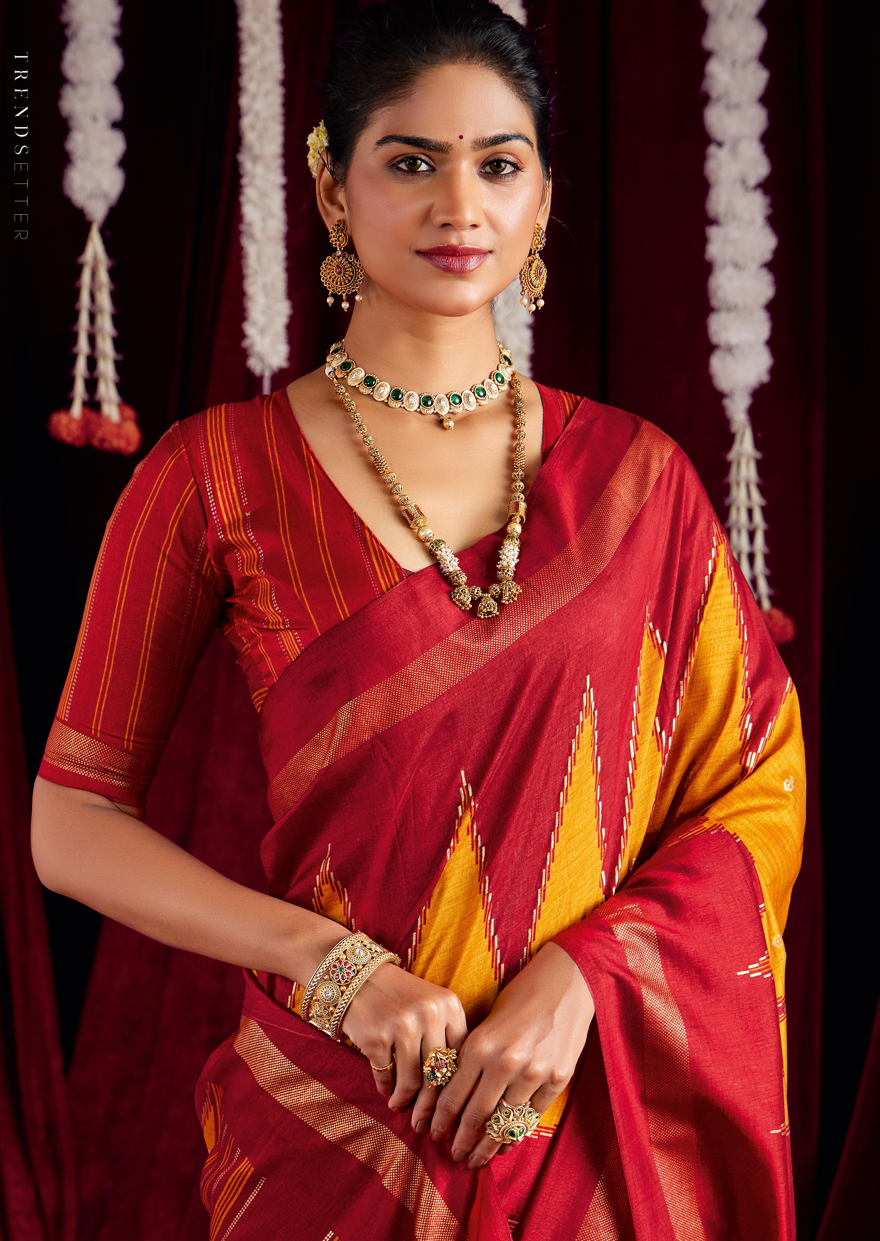 Yellow & Red Color Ikkat Silk Fabric Designer Zig Zag Printed Traditional Party Looks Saree