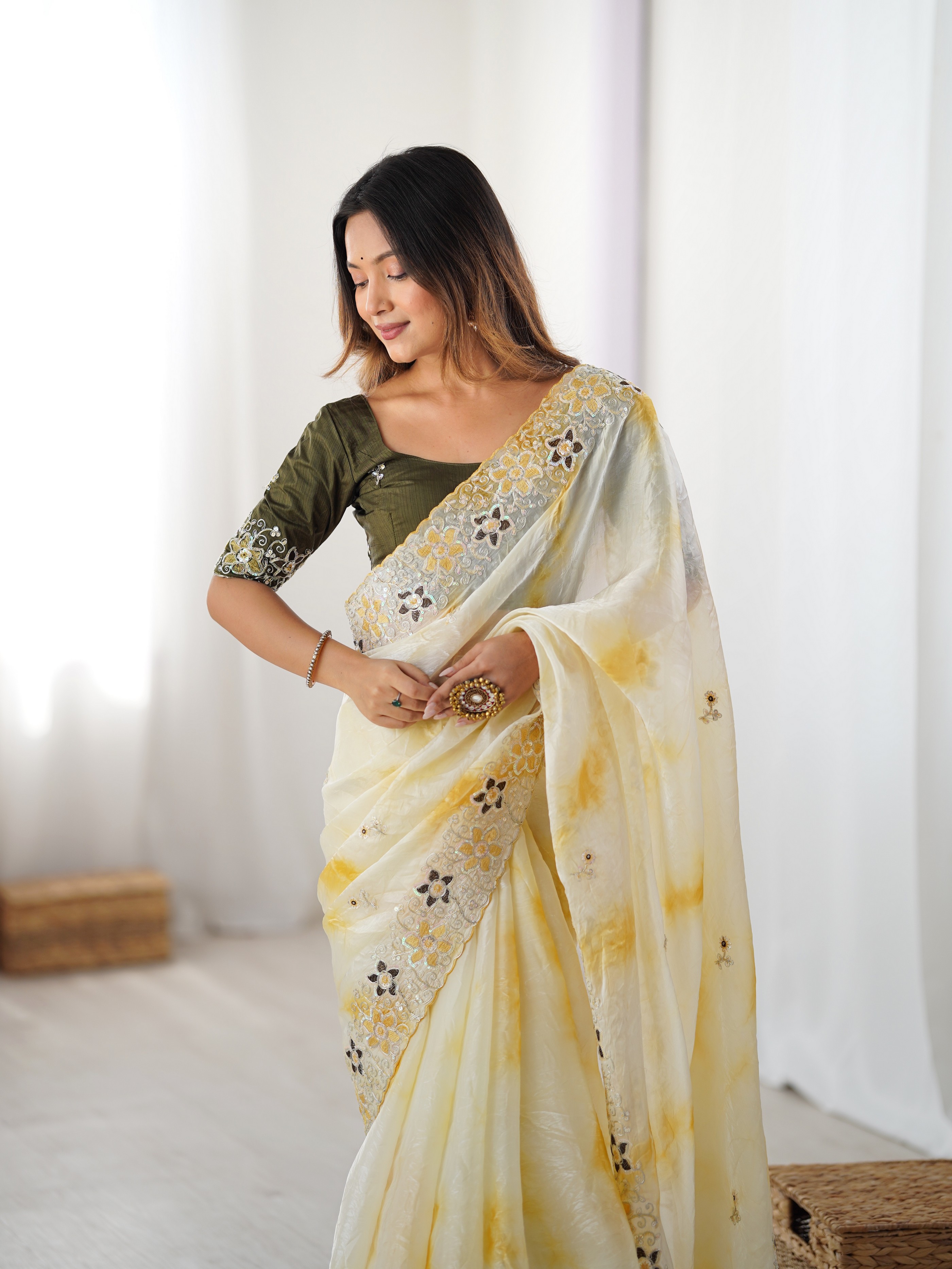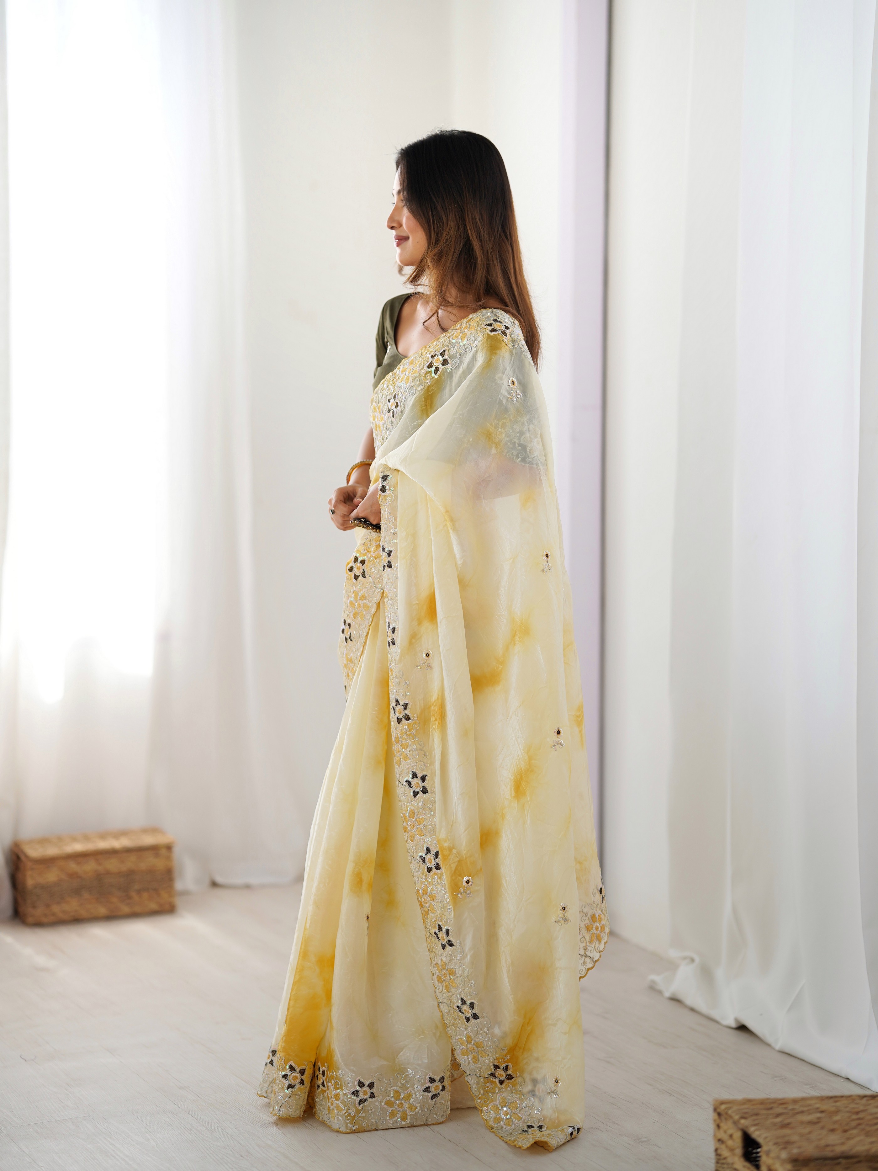Yellow color Fendy Fabric Stylish Girlie Saree