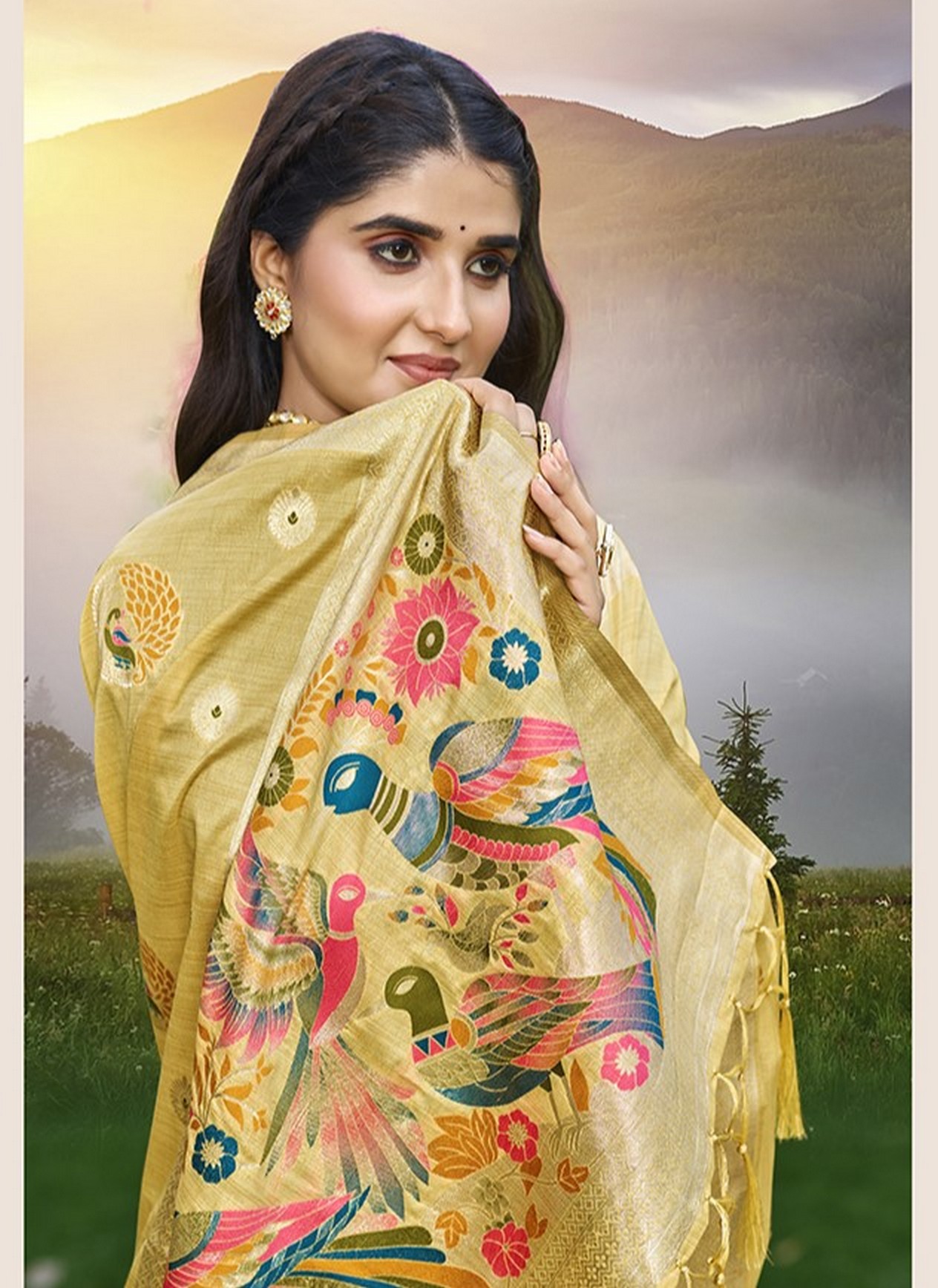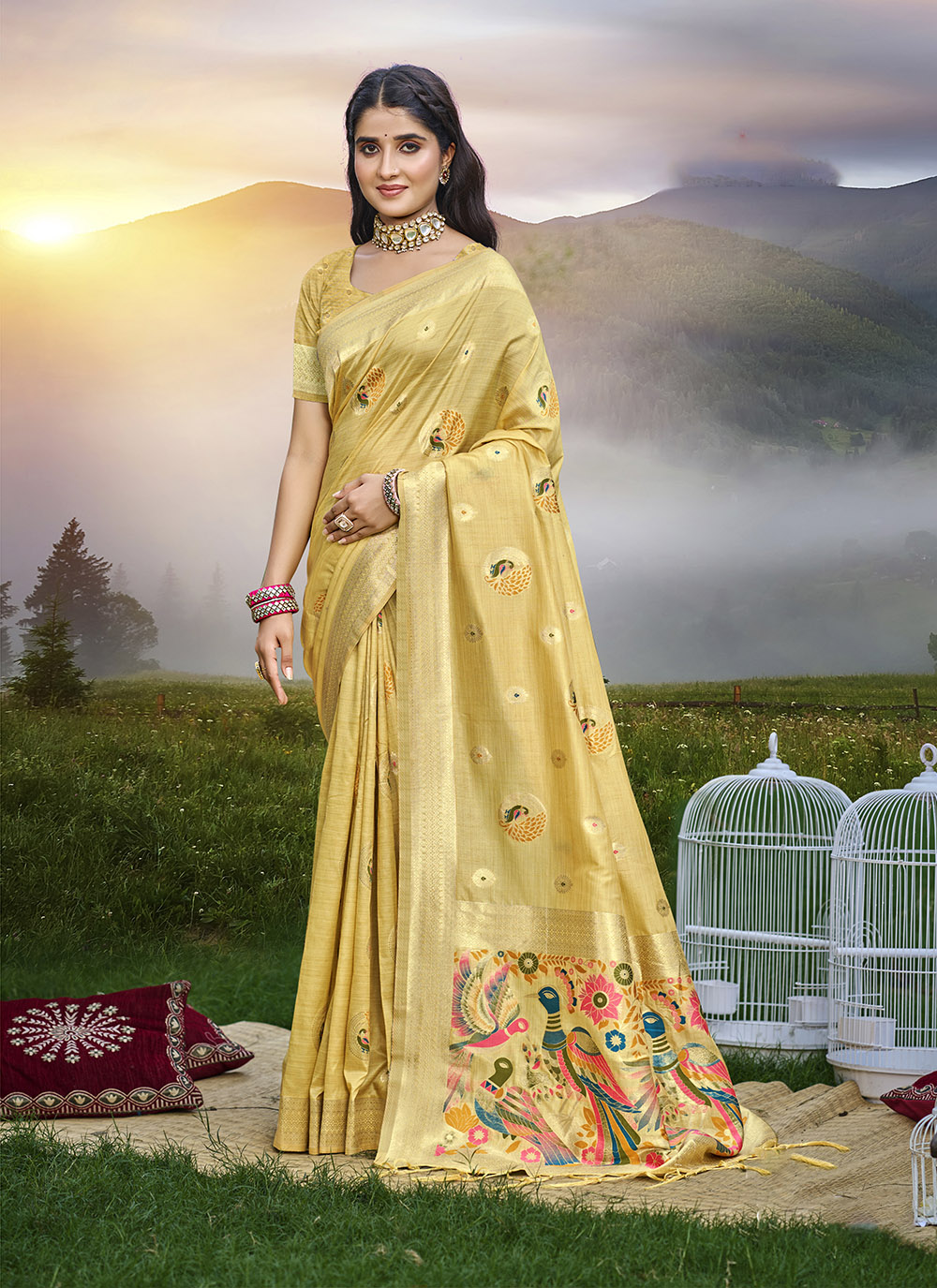 Yellow Color Graceful Woven Meenakari Designer Saree On Assam Silk Fabric