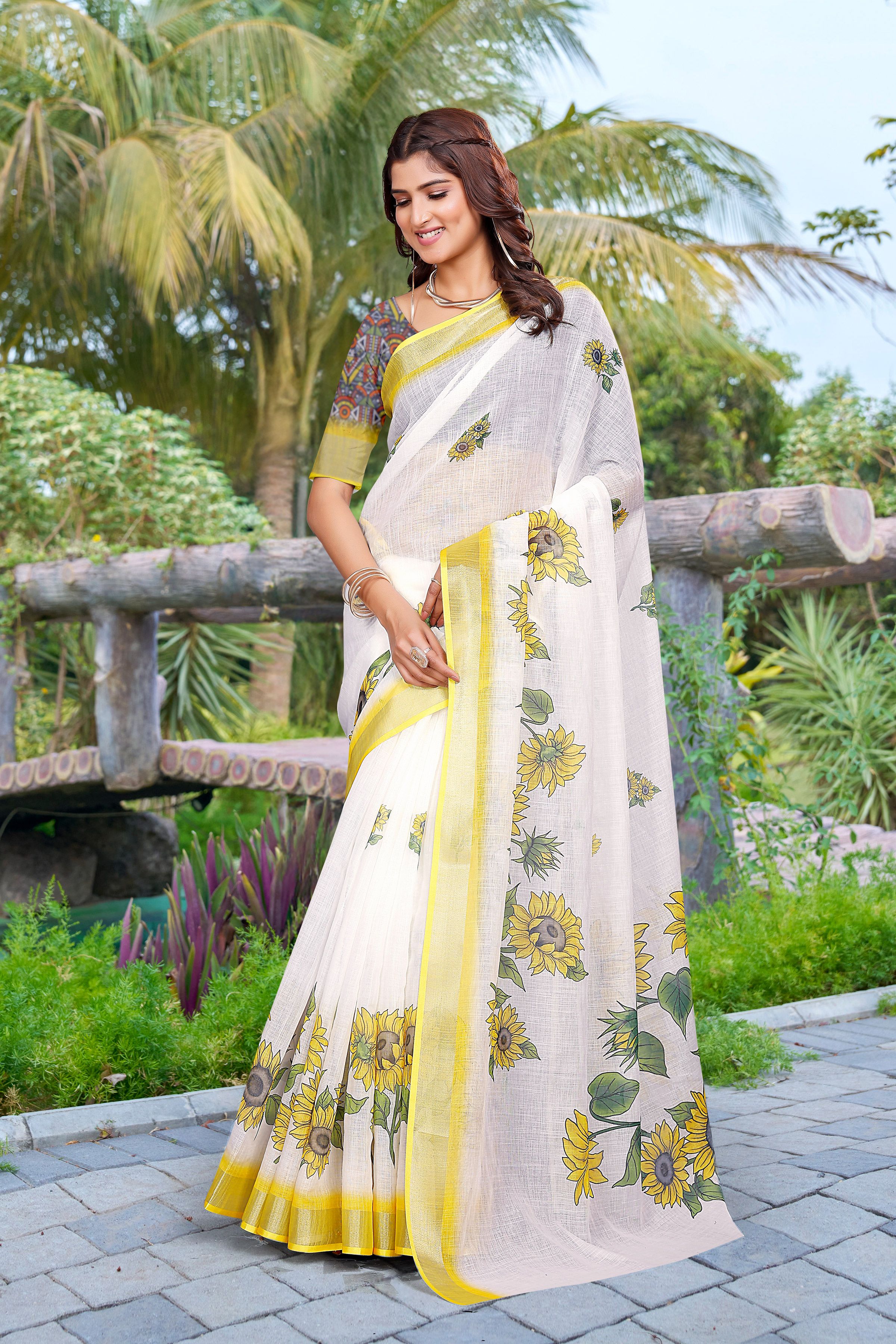 Garb These Festive Saree in Fine Colored.These Saree Are Linen Cotton And Blouse is Fabricated On Linen Cotton Pair.Its Beautified With Wevon Jari Border With Designer Digital Printed.