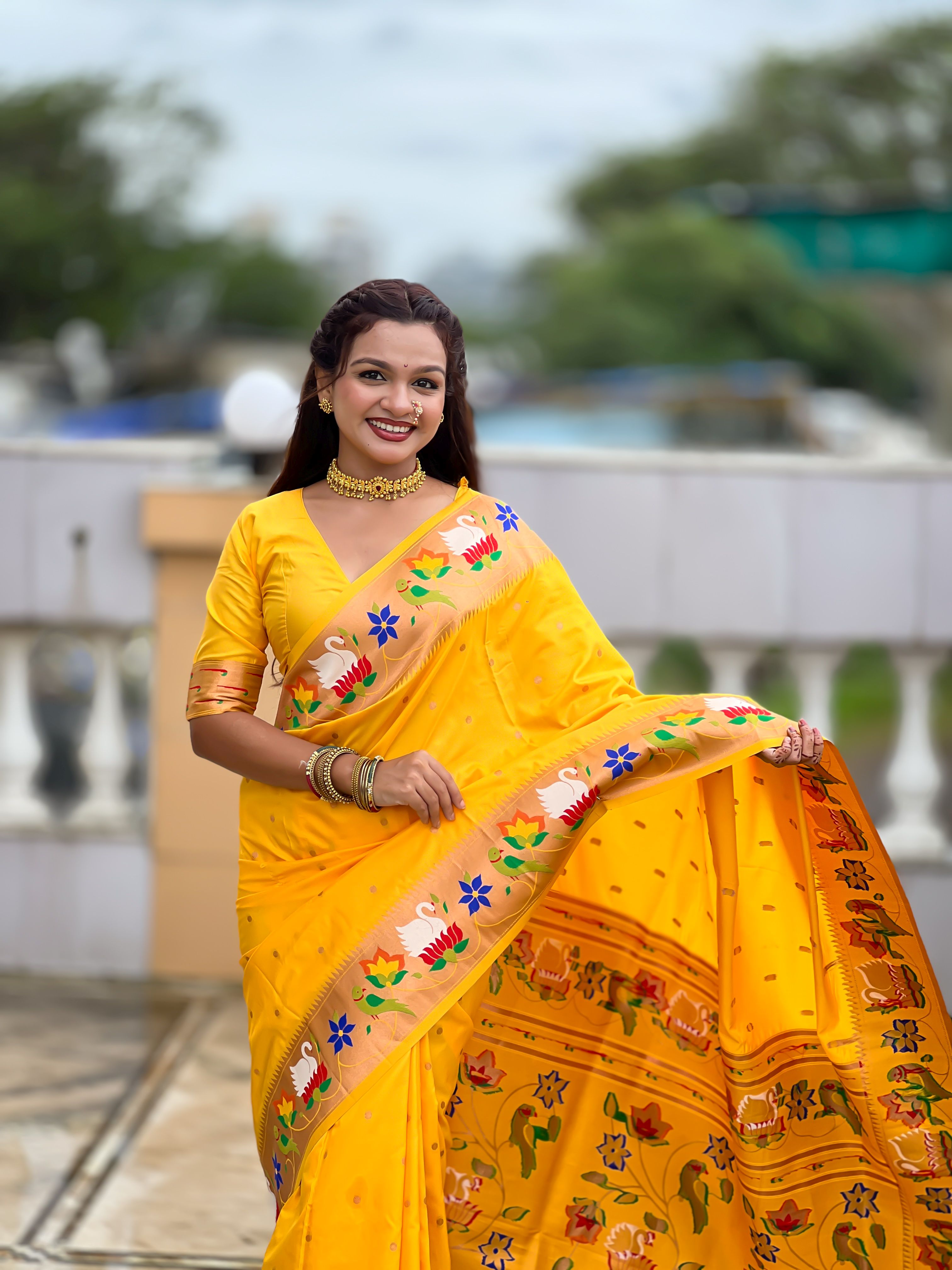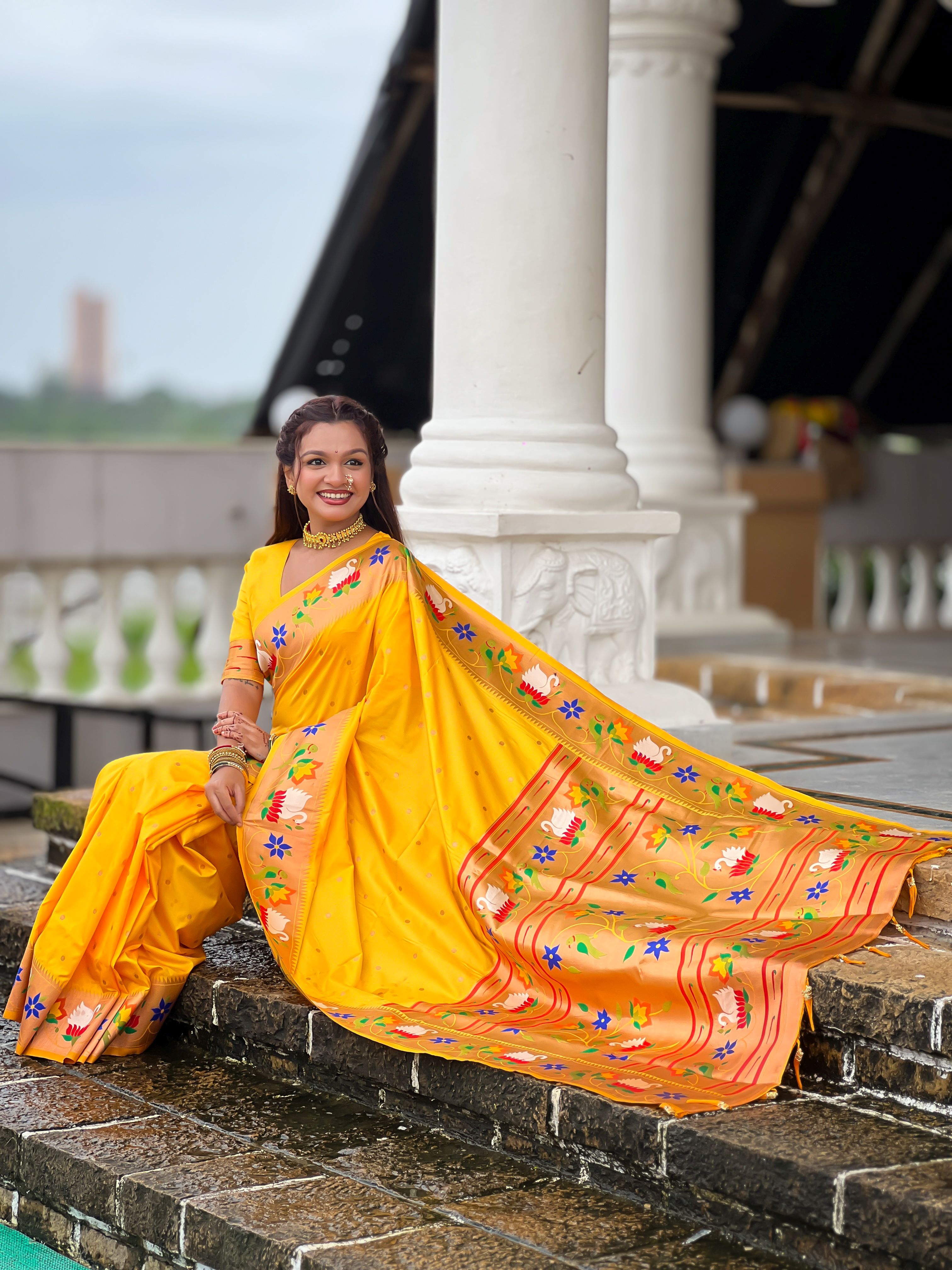 Yellow Color Paithani Silk Woven Meenakari Jacquard Designer Heavy Wedding Special Saree