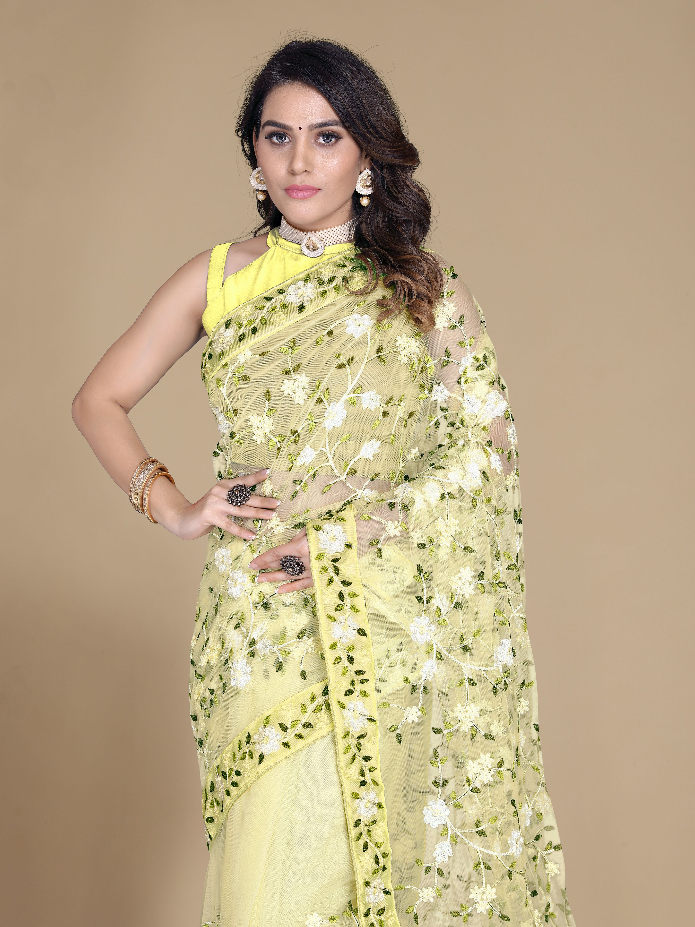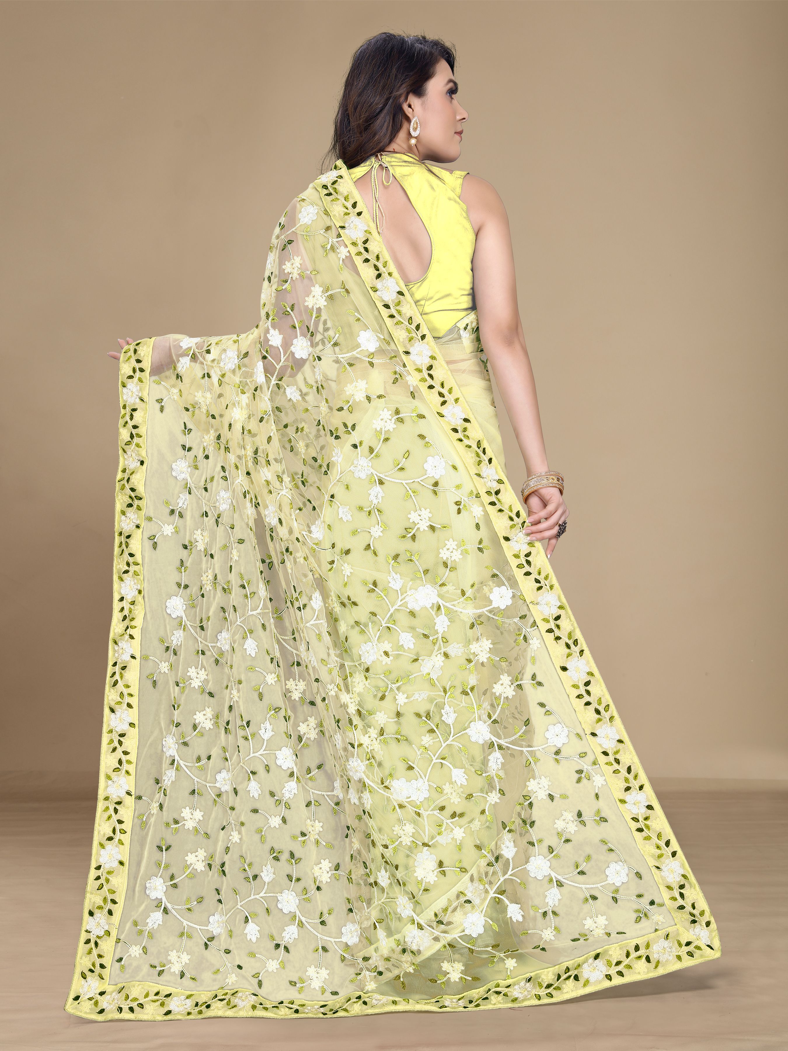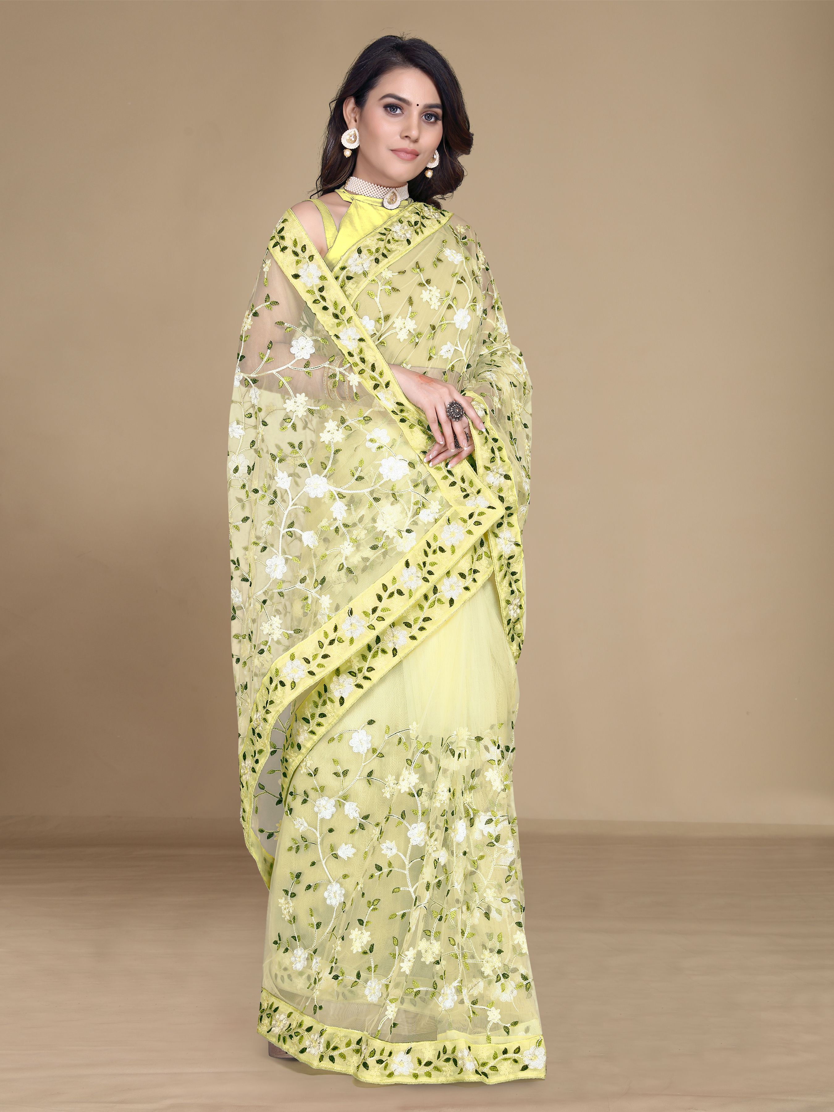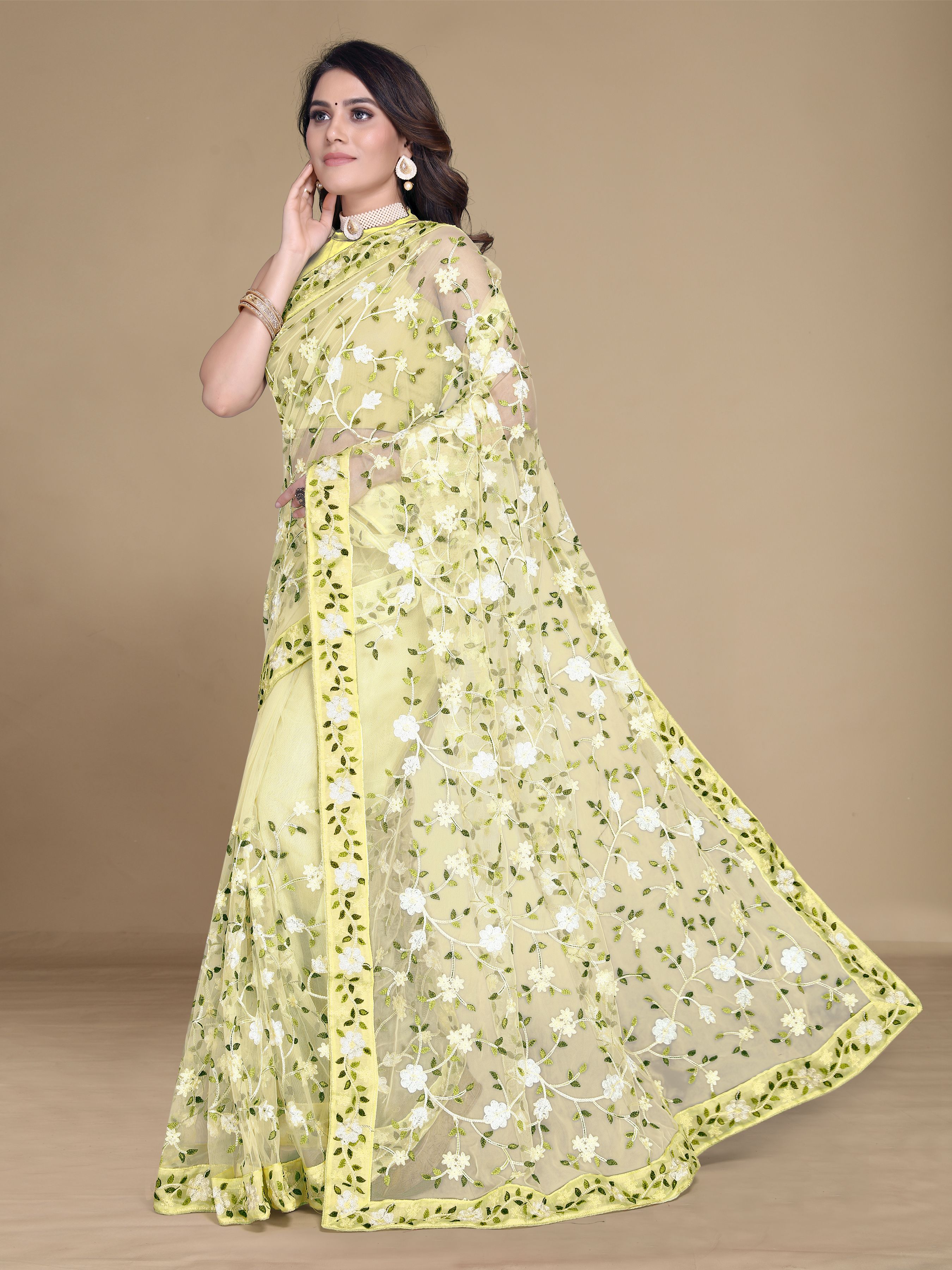 Yellow Color Soft Net Fabric Designer Multy Thread Embroidery Work Smart Partywear Saree