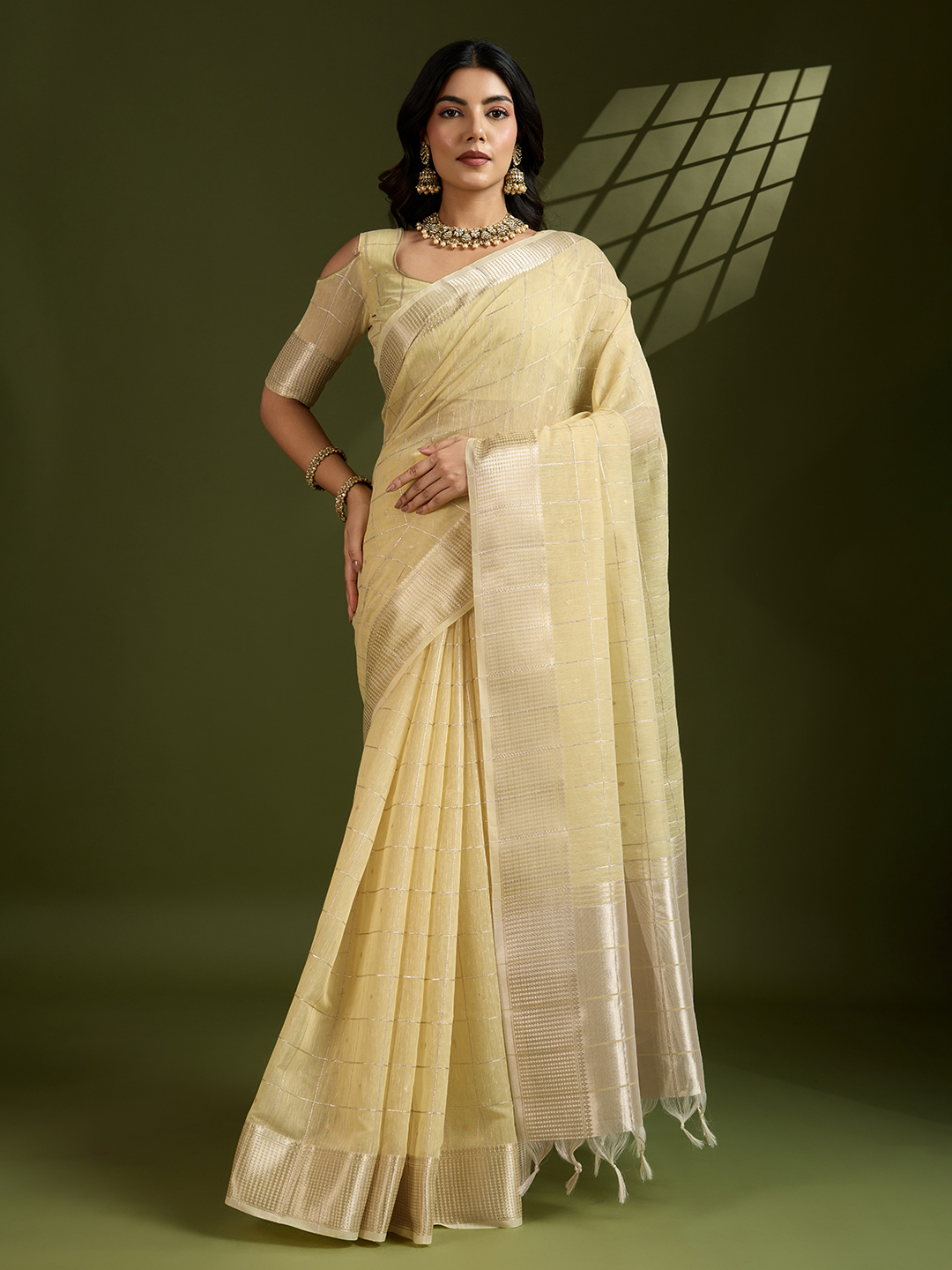 Yellow Color Tissue Linen Silk Weaving Checks Designer Graceful Trendy Saree