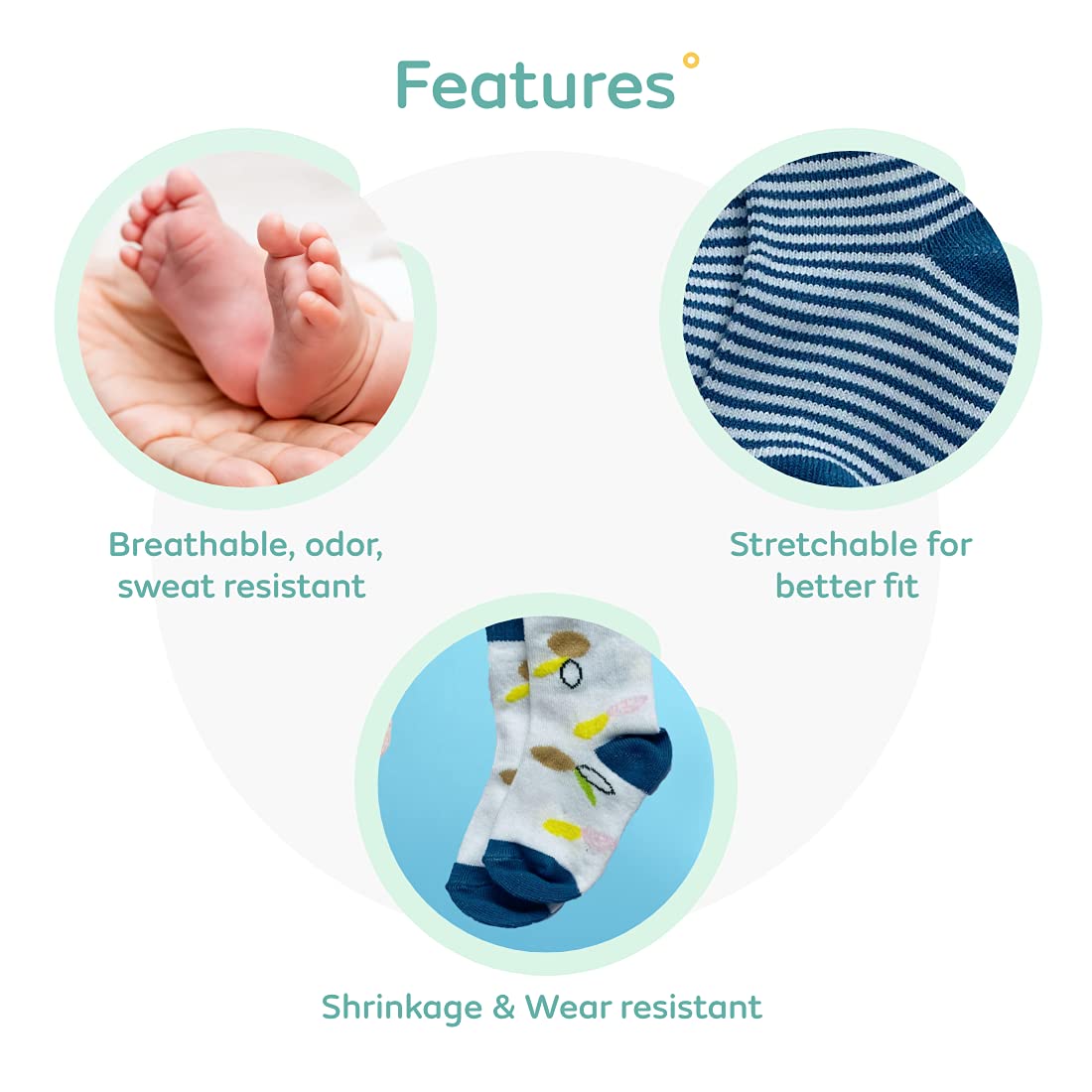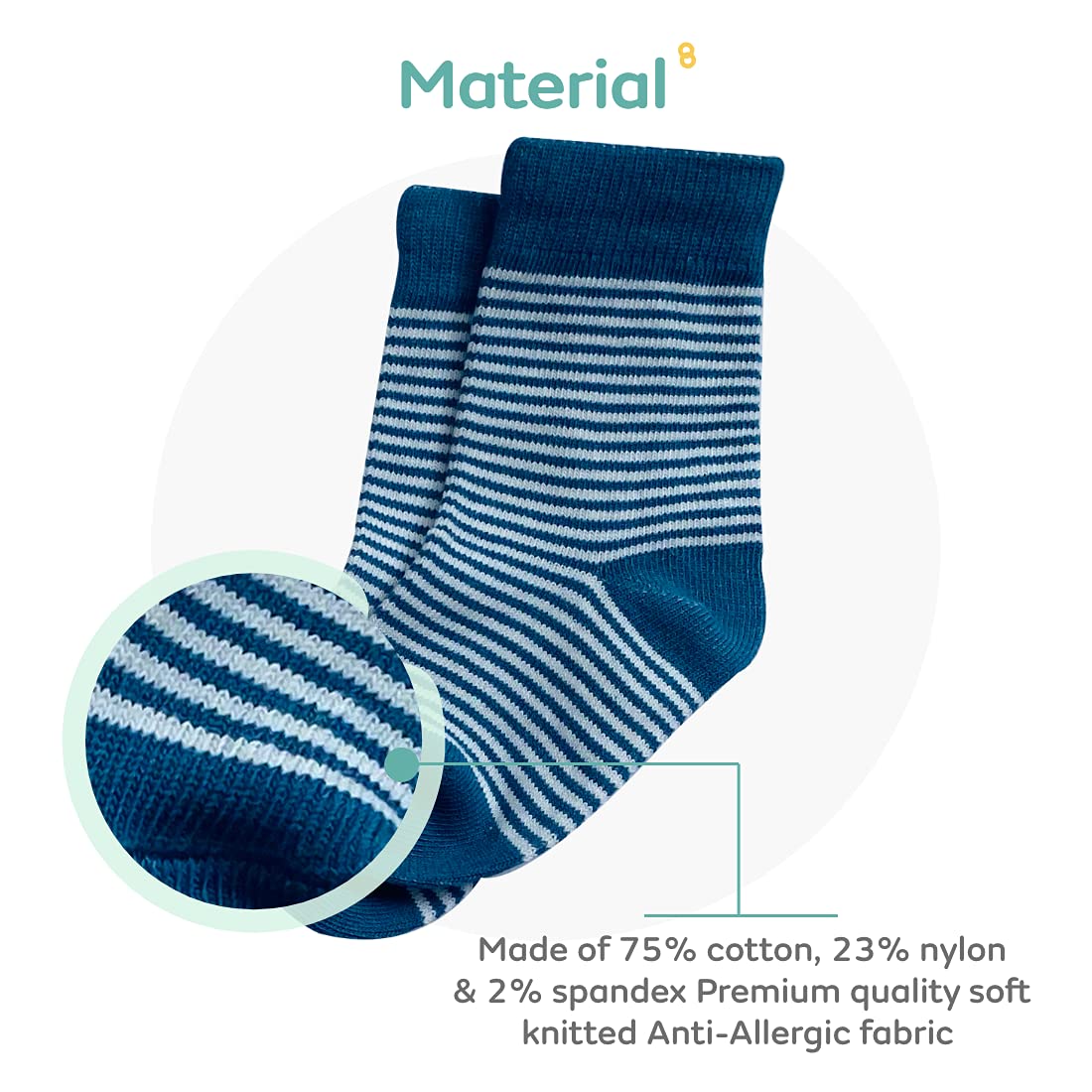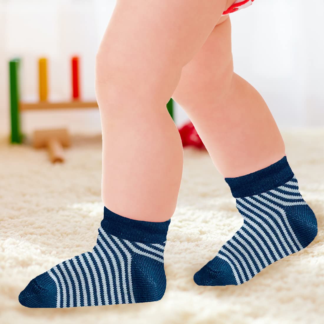 Comfort for tiny little feet! What it is: Babies can catch a cold easily because of the ever-developing immune system. It is essential to make your baby wear socks to make them feel comfortable and warm. And when the baby grows it may safeguard their feet from getting hurt while crawling walking or climbing. Mylo Essentials premium-quality all seasons cotton socks are super soft elastic and are skin-friendly. These soft and snug socks are designed to keep the comfort & energy of babies & toddlers in mind. The baby remains comfortable around the ankle. The pressure-free and extra arch elastic prevent the socks from falling off while carrying the baby on the shoulder or in the case of older babies while playing walking or jumping. The cute patterns and vibrant colors are a must in your babyâs wardrobe. Smart Wash Care Tip- Easy Ways to Stop Losing Socks During a Wash -Use A Mesh Laundry Bag. Zip all your baby socks into a mesh laundry bag for machine wash. How is our product different? Our Baby Socks are made keeping in mind the delicate skin of babies. They are made of super-soft and comfortable cotton fabric and are anti-bacterial and anti-allergic. Mylo ensures rigorous quality testing to provide the best products to you. Why Mylo Essentials? We at Mylo make high-quality products to make your everyday life a lot easier and more joyful. After thorough research on the needs of a mother and her baby we headed to experts and asked for their opinion. With their guidance we made these products exclusively for you and your family. We care for you and want to help you in your journey of raising happiness as your extended family.
