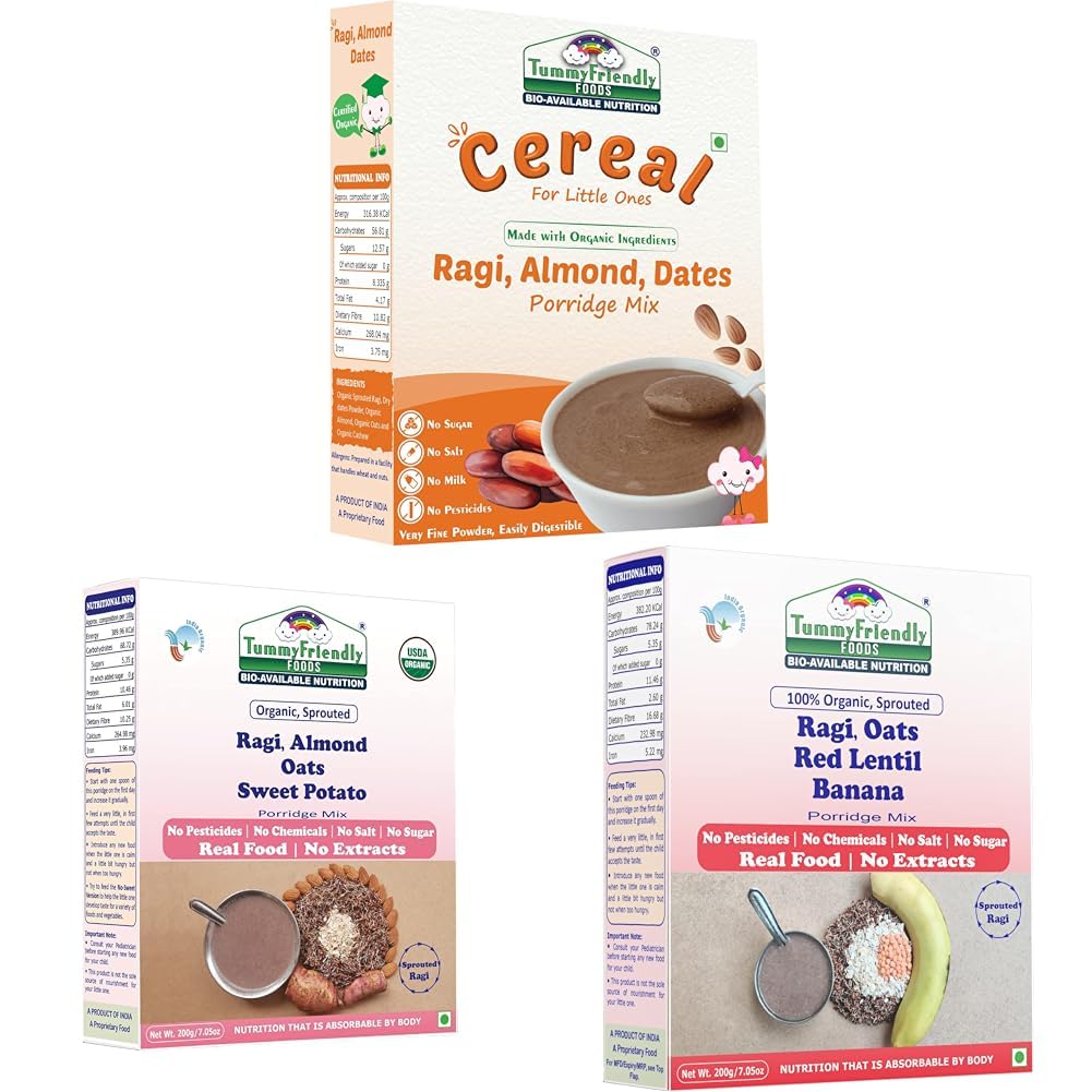 HomeGroceryHealthy BreakfastCereals & PorridgeTummy Friendly Ragi Combo Organic Cereal for Little Ones. Sprouted Ragi Almond Dates Sweet Potato Banana. Available in Baby Trial Packs. Real Food No Harmful Ingredients. Shelf life 8 Months