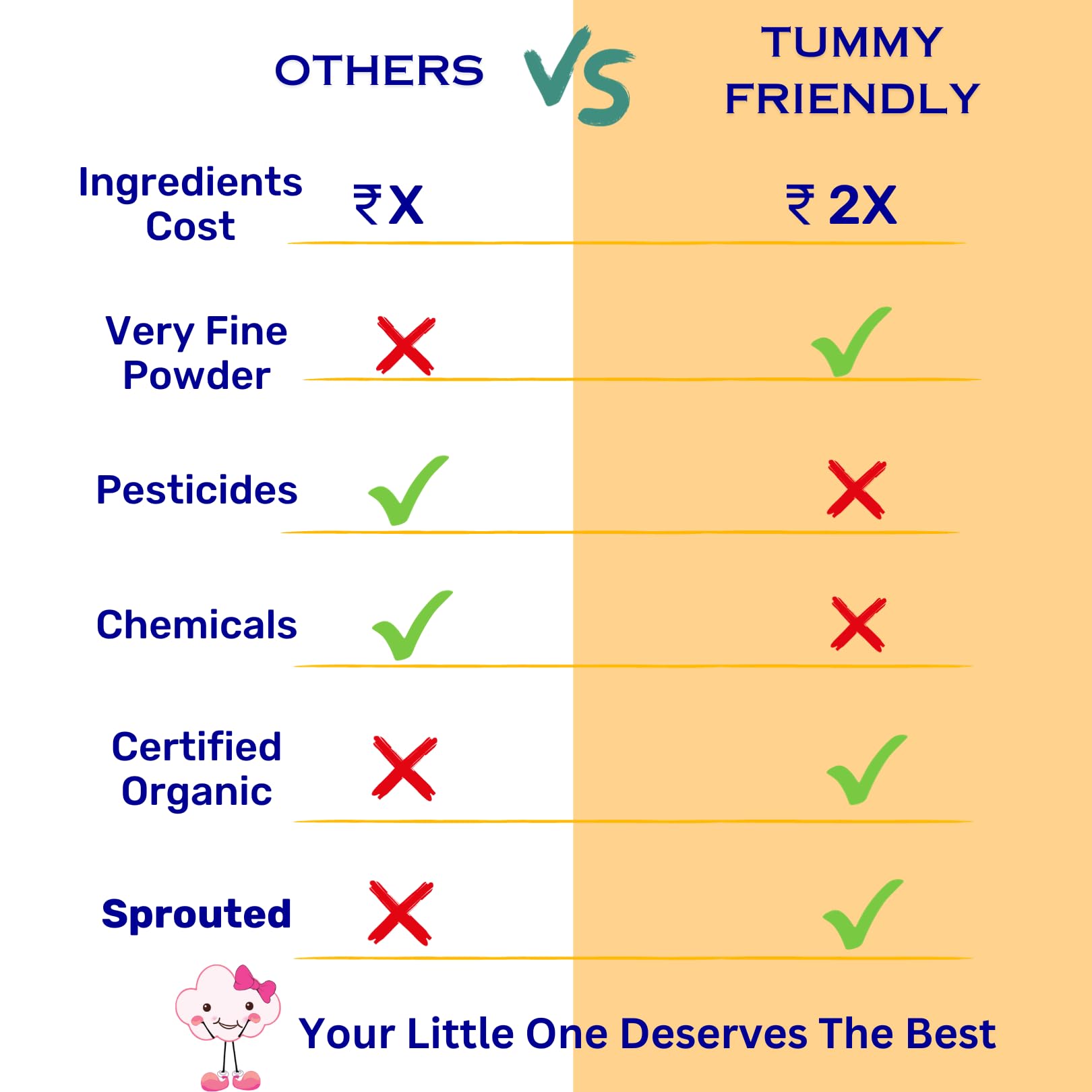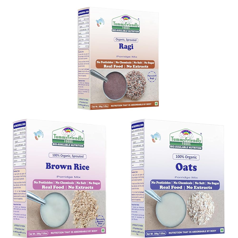 Tummy Friendly Stage1 Organic Cereal for Little Ones. Sprouted Ragi Brown Rice Oats. Available in Baby Trial Packs. Real Food No Harmful Ingredients. Shelf life 6 Months