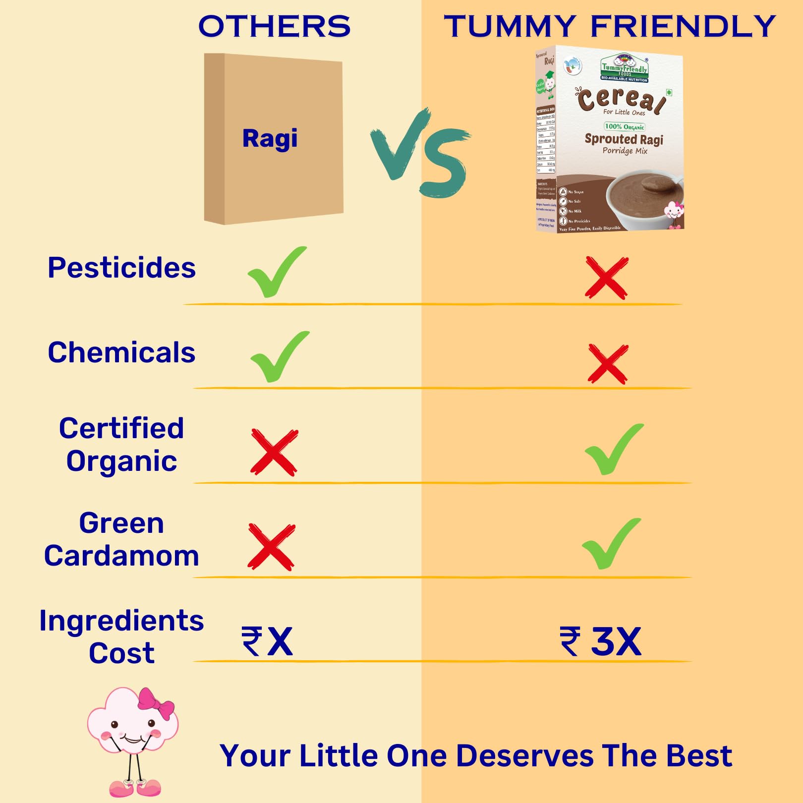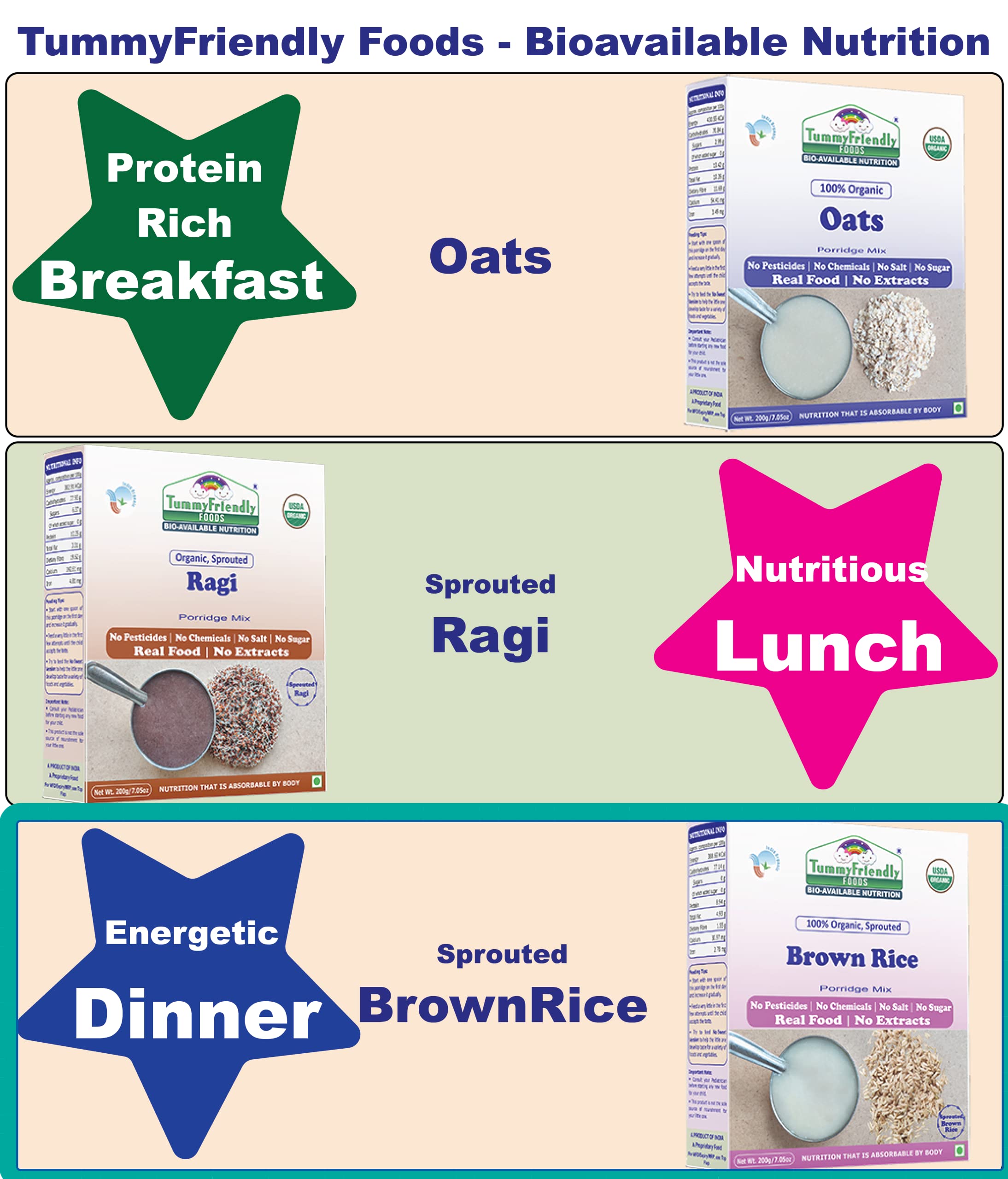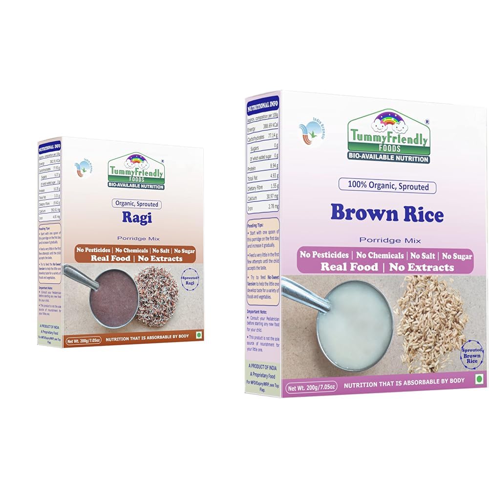 TummyFriendly Foods Certified Organic Sprouted Ragi Flour For Little Ones. Made of Organic Sprouted Ragi Powder | Ragi Flour for Baby rich in Calcium Iron Fibre & Micro-Nutrients. Ragi Sari Nachani Satva. No Sugar No Salt No Milk No Chemicals No Pesticides | Maximum Nutrition From Real Food. Available in Trial Baby Packs too. Shelf Life 6 Month | 200g ONE PACKExcellent source of Calcium and Iron Good source of Protein Vitamins and Minerals Rich in Dietary-Fibre for a Happy-TummyTummyFriendly Foods Certified 100% Organic Sprouted Brown Rice Porridge Mix | Excellent Weight Gain Food | Made of Sprouted Brown Rice Powder For Baby | India-Organic Certified | Maximum possible Nutrition From Real Food | No Sugar No Salt No Milk No Chemicals No Pesticides & No GMO | Available in Trial Baby Packs too | 6 Month Shelf Life | 200g⥠Certified 100% Organic Brown Rice Porridge Mix-200g ⥠Why Sprouting? Because when sprouted the grains & pulses germinate into Baby plants with the nutritional capacity to grow into big plants. ⥠The germination process in Brown Rice is known to multiply the levels of Gamma-Aminobutyric Acid (GABA) a neurotransmitter that strengthens the central nervous system. ⥠Sprouted Brown Rice is known to have high levels of Manganese an essential mineral for bone health and nutrient metabolism. ⥠Sprouted Brown Rice is a good source of Folate Thiamine Niacin and other B-Complex Vitamins. ⥠Sprouted Brown Rice is a very good source of Selenium Phosphorus Magnesium and Zinc. ⥠Sprouted Brown Rice is laden with nutrients it helps support the rapid growth cycles year by year in little ones. ⥠Certified Organic Food For Babies ⥠Easily digestible ⥠6+ month Shelf-Life ⥠TummyFriendly Foods: Maximum possible nutrition from Real-Food ⥠No Sugar No Salt No Chemicals No Pesticides No GMO No extracts and No Unhealthy Ingredients. ⥠Only Real Food!