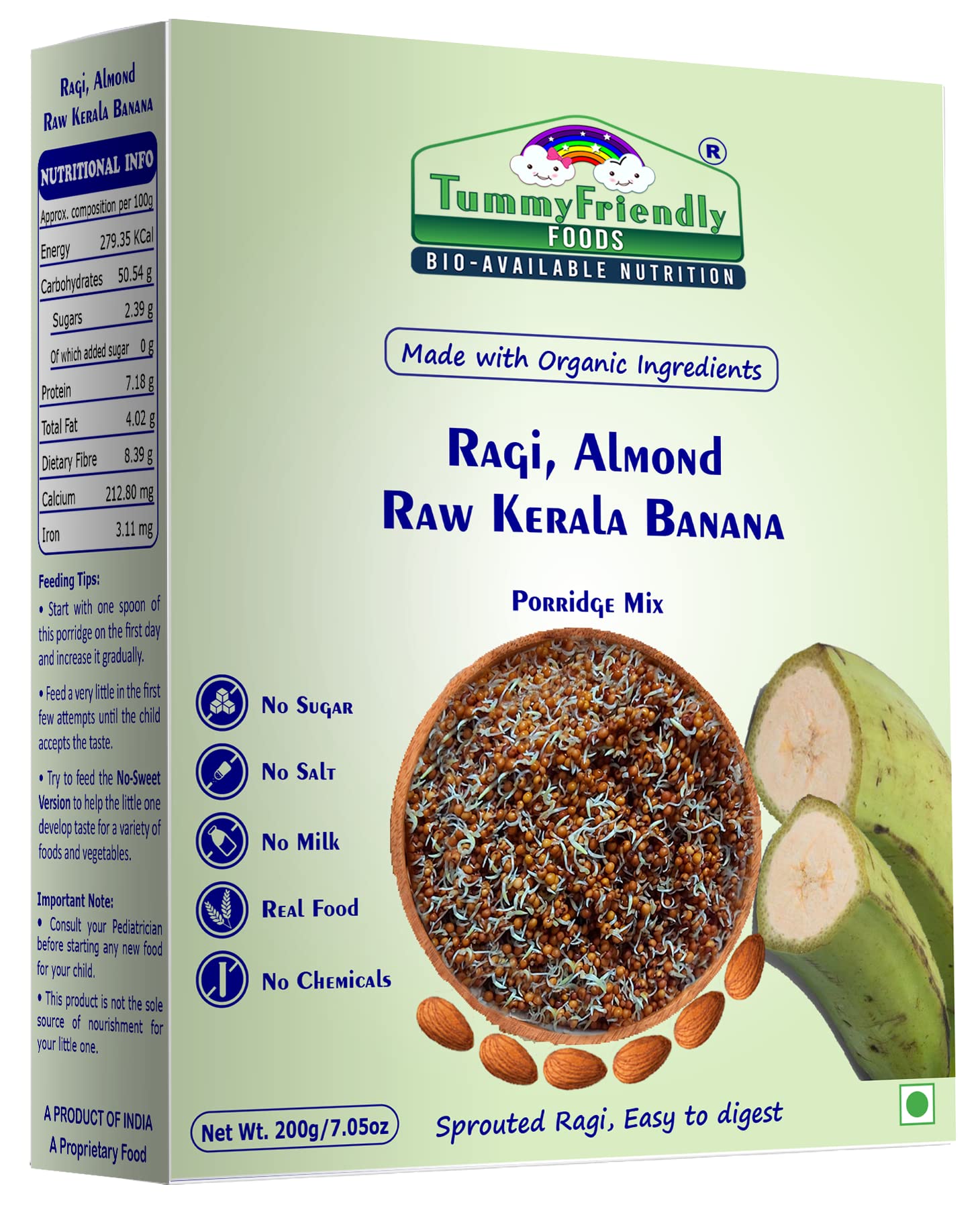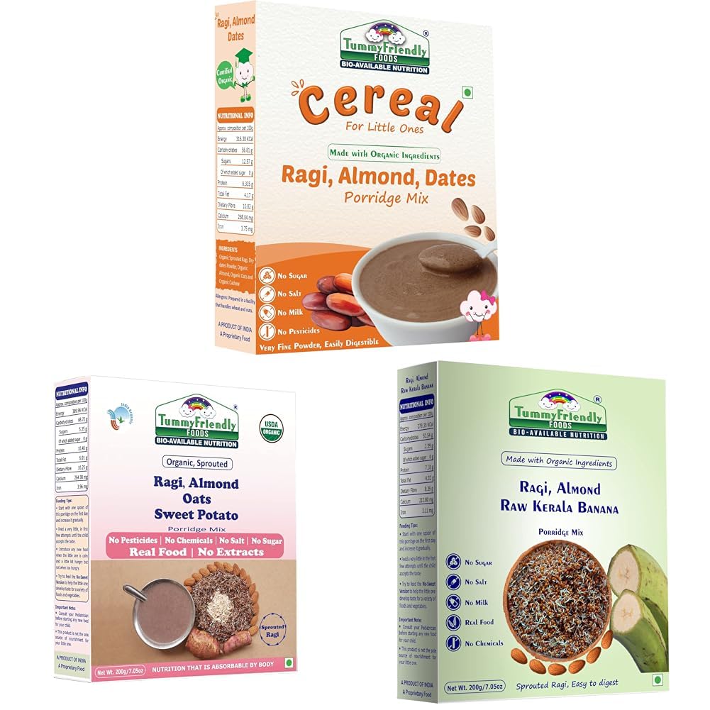 HomeGroceryHealthy BreakfastCereals & PorridgeTummy Friendly Stage3 Organic Ragi Almond Combo for Little Ones. Sprouted Ragi Almond Sweet Potato Raw Banana. Available in Baby Trial Packs. Real Food No Harmful Ingredients. Shelf life 6 Months