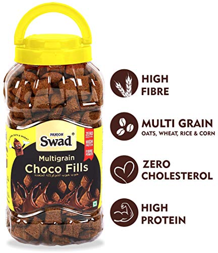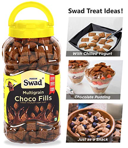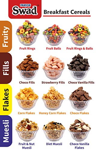Size:370 g (Pack of 1)Swad presents its exclusive range of tasty & healthy breakfast cereals. Swad Fills is made with the goodness of multigrain in a zero cholesterol formula to keep you charges up all day long. 100% natural ingredients multigrain power no preservatives rich in fibre vitamins iron & high in protein. It tastes great with hot or cold milk yoghurt ice creams or enjoy it as a snack with children kids friends & family. Available in 12 unique flavours: corn flakes honey cornflakes flakes vanilla flakes diet muesli muesli fruit & nut chocolate fills vanilla fills strawberry fills & Fruit rings & Fruit balls. Swad breakfast cereal multigrain choco fills [made with oats corn wheat rice zero cholesterol chocolate fills] try all 12 Swad breakfast cereals to experience tastier & healthier breakfast everyday.
