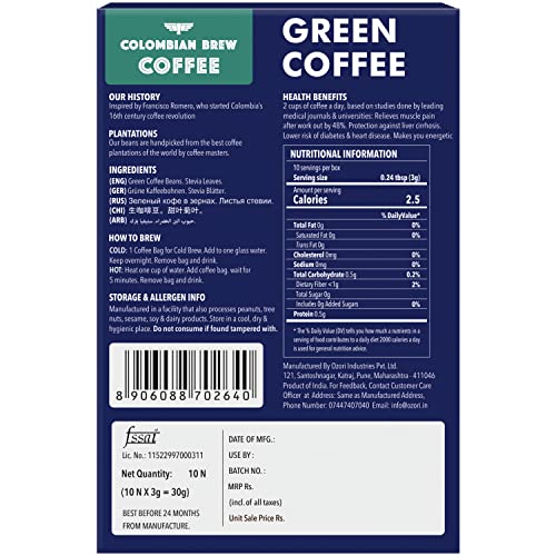 This is a pack of 2 of Colombian Brew 30g - 10 Green Coffee Bags. Each bag makes one cup of green coffee. Made with farm fresh sun dried green coffee beans perfect for weight loss and good health. Colombian Brew is inspired by Francisco Romero a priest in mid-16th century Colombia that started its coffee revolution. Colombian Brew Coffee is sourced from best Arabica Bean Plantations in the world.
