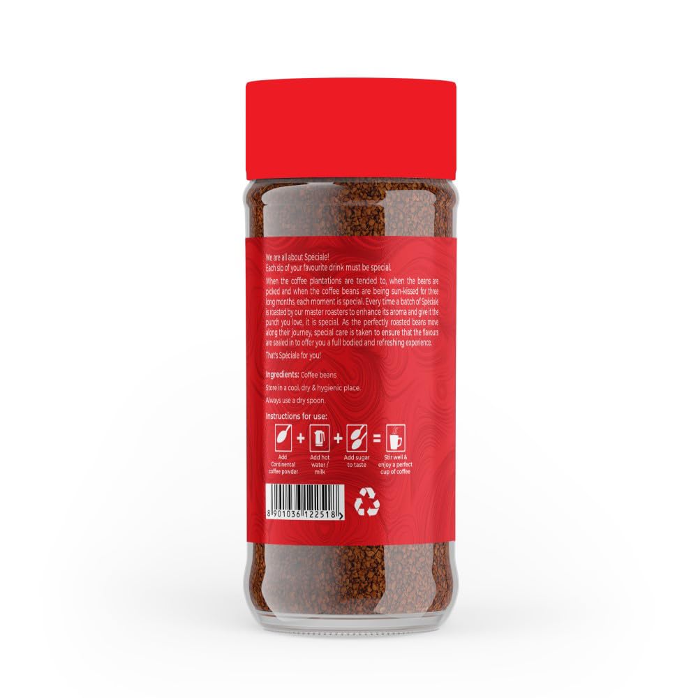 *** India Coffee with Worldwide Experience ***Established in 1995 CCL is India's Largest Coffee Manufacturer and Exporter of Coffee. CCL has become one of the World's Most Favoured Coffee supplying over 200 Coffee Blends to Worldwide Brands in 90+ Countries. CCL now introduce the same Taste Richness and Aroma with the Finest Instant Coffee in India with CONTINENTAL Brand .*** CONTINENTAL SPECIALE *** : Continental Speciale is 100% Pure Instant Soluble Coffee processed from carefully selected plantation Arabica and washed Robusta beans blended to perfection for complete satisfaction instantly. A flavour made out of Hand-picked Natural and Pure coffee beans that makes every morning a Special Affair Continental Speciale could be your every day morning cup of joy. With 100% Coffee and nothing coming in its way Continental Speciale is here to bring you the classic richness and taste of Coffee.*** As You Like It¦ ***Continental Coffee is a beverage of everyone choice. Being so Versatile in its nature it allows itself to twist and swirl into any household or any scenario suiting the flavor palate of every coffee lover. A little milk a lotta milk strong coffee sweet coffee lotsa froth or just Strong Black Coffee. everyone takes their coffee¦As they like it¦ Knowing this Continental Coffees have been crafted to perfection to suit every flavor and every fancy.