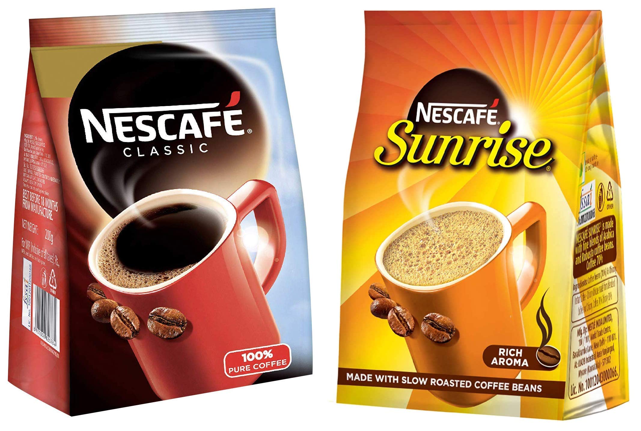 Nescafe Classic Coffee 200gTo take your coffee experiences to the next level NESCAFE the world's favourite instant coffee brand brings forth a rich and aromatic coffee in the form of NESCAFE Classic. The unmistakable flavour of NESCAFE Classic is what makes this signature coffee so loved all over the world. Start your day right with the first sip of this classic 100% pure coffee and let the intense taste and wonderfully refreshing aroma of NESCAFE instant coffee awaken your senses to new opportunities. With over 75 years of experience and working with coffee farmers to help them grow more sustainable coffee through improved crop techniques we deliver the best coffee produced by the best selecting roasting and blending methods. Usage: Simply follow the instructions on the back of the pack and mix the coffee powder with hot water or milk to get your own cup of premium instant coffee right at home. Storage Recommendation: On opening transfer the contents of the pack into an airtight container. Always use a dry spoon.Nescafe Sunrise Rich Aroma Instant Coffee-Chicory Mix 200g Pouchp>"NescafeSunrise is an instant coffee-chicory mixture made from blends of 70% coffee and 30% chicory. This coffee is made with the fine blends of Arabica and Robusta beans which are slow-roasted for optimal flavour. Awake your senses with the rich aroma and taste of NescafeSunrise every morning. It all starts by handpicking the best beans from coffee farms in South India. They are slow roasted in rotating drum roasters till they develop the perfect aroma. Nestleâs world class technology then ensures this aroma is retained all through the coffee making process and finally capture in aroma granules. Usage: Simply follow the instructions on the back of the pack and mix the coffee granules to hot water sugar and milk to release the rich aroma in your cup every morning. Storage Recommendation: On opening transfer the contents of the pack into an airtight container. Always use a dry spoon.