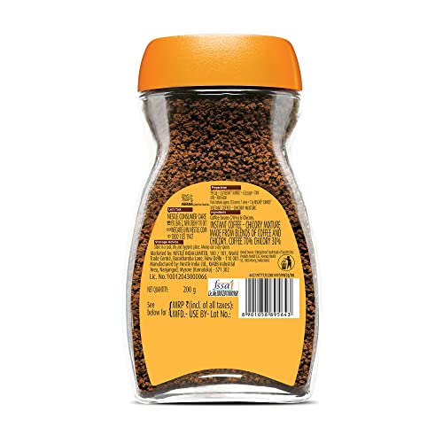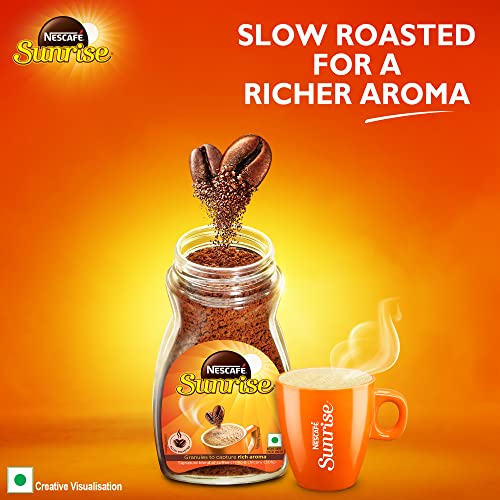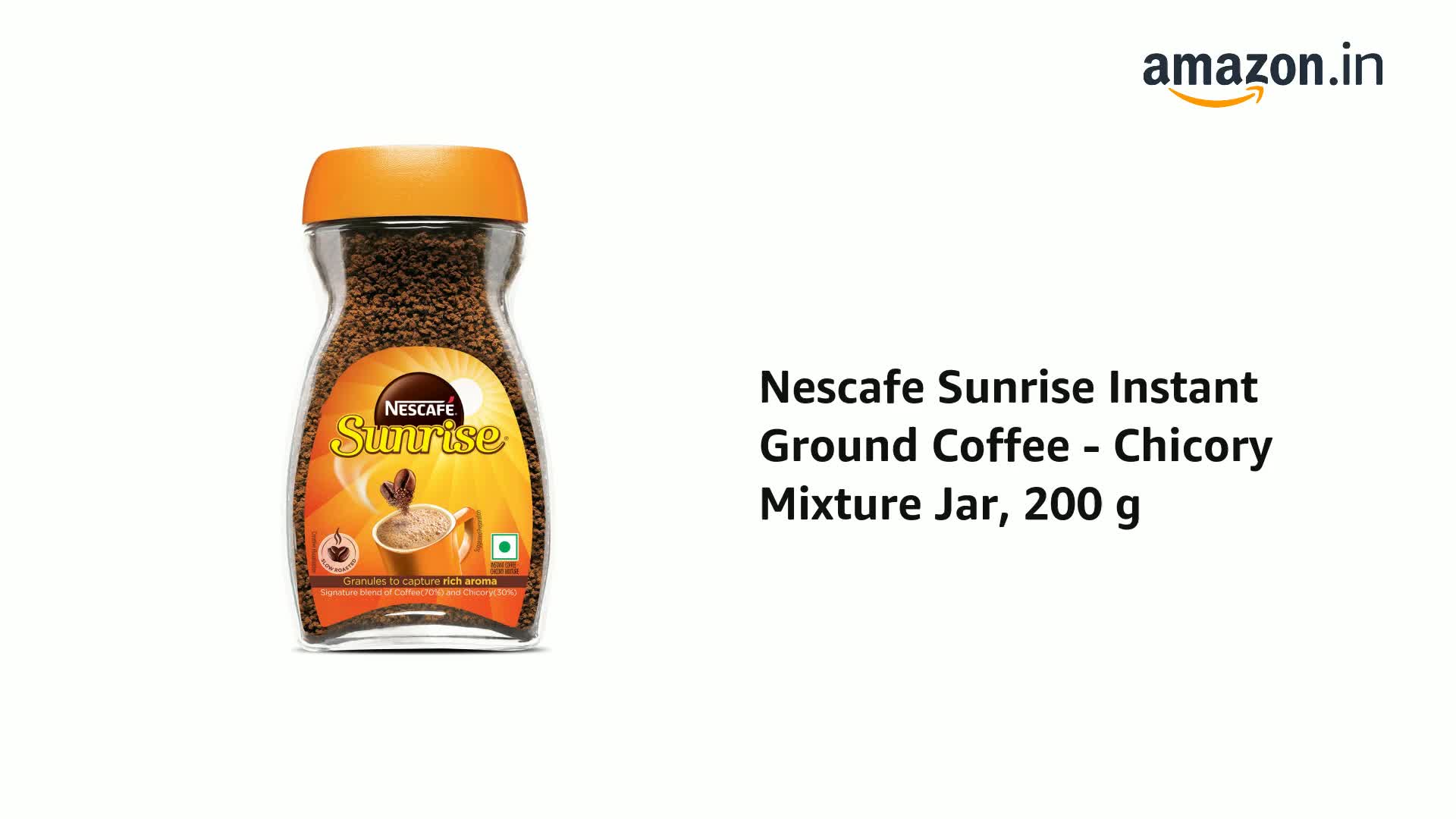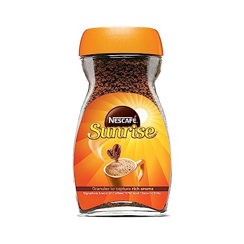 Nescafe Sunrise is an instant coffee-chicory mixture made from blends of 70% coffee and 30% chicory. This coffee is made with the fine blends of Arabica and Robusta beans which are slow-roasted for optimal flavour. Awake your senses with the rich aroma and taste of Nescafe Sunrise every morning. It all starts by handpicking the best beans from coffee farms in South India. They are slow roasted in rotating drum roasters till they develop the perfect aroma. Nestle's world class technology then ensures this aroma is retained all through the coffee making process and finally capture in aroma granules. Usage: Simply follow the instructions on the back of the pack and mix the coffee granules to hot water sugar and milk to release the rich aroma in your cup every morning. Safety Information: On opening transfer the contents of the pack into an airtight container. Always use a dry spoon.
