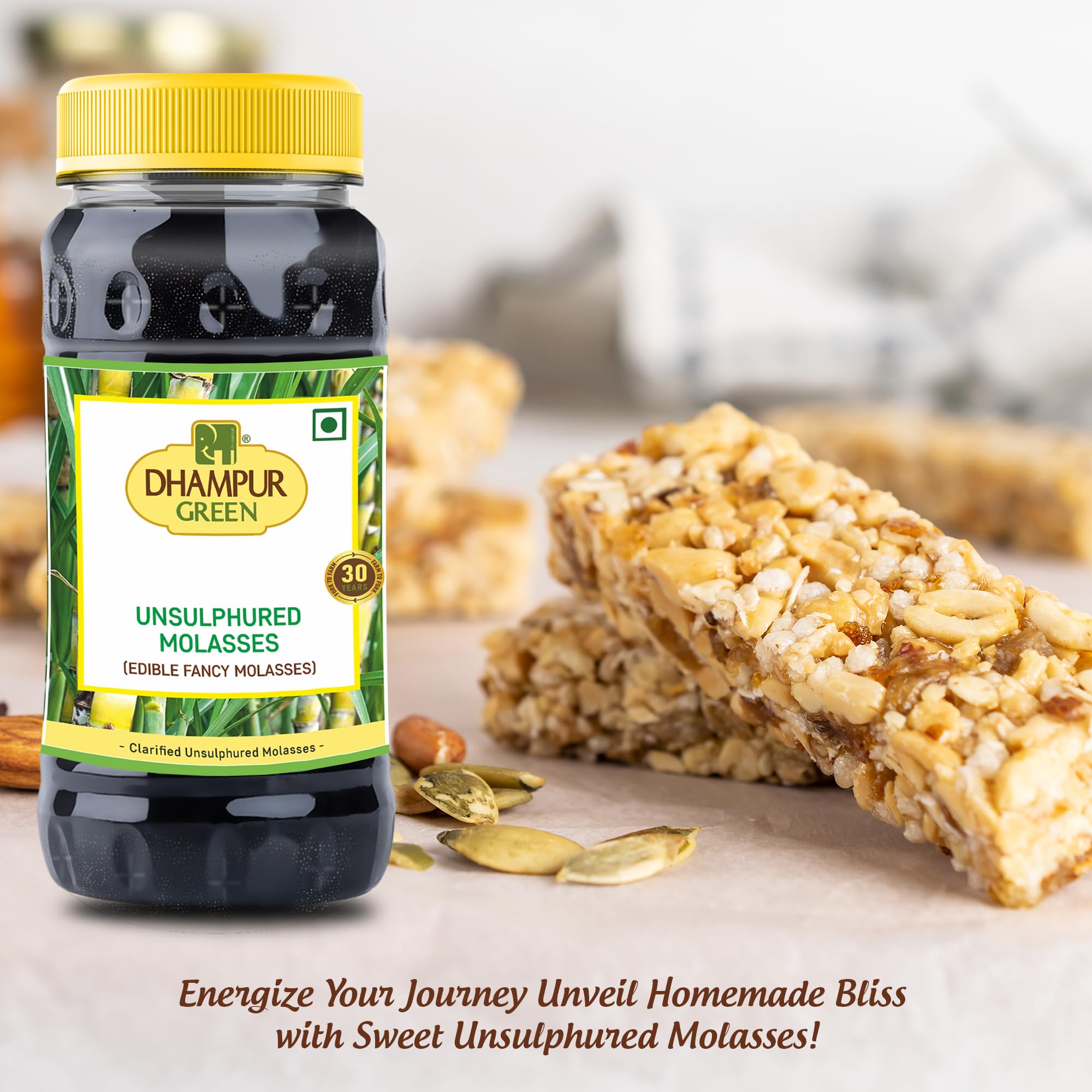 Unsulphured Molasses/ Cane Syrup/ Fancy Molasses/ Kakvi/ Raab is delicious concentrated sugarcane juice that is clarified and concentrated. It is rich wholesome and has a full-bodied robust flavor that adds natural color and opulent caramel sugarcane flavor to recipes. Loaded with natural micro-nutrients minerals and vitamins it works great in sweets cereals baking cooking or as a topping. It adds a distinctive rich aroma to traditional sweet treats like fruitcakes gingerbread treacle tarts BBQ sauces puddings etc. Dhampur Green Molasses is pure sugarcane molasses and is often known as the healthiest molasses since it is so pure and contains a lot of minerals and vitamins including iron manganese copper calcium and potassium. Additionally it includes a lower glycaemic value because the majority of the sugar was extracted throughout the triple processing. This definitely is the highest quality unsulfured sun-ripened sugarcane molasses made without preservatives artificial flavors or artificial colors and is fat free and . At Dhampur the process is minimalistic so that natural nutrients are retained. After the sugarcane is cut and crushed the liquids are extracted and boiled and you get this molasses which is sulphur-free and is perfect for all of your healthful baking needs or as an energy-boosting natural health supplement. It is lower in carbs and packs more vitamin B6 and much more potassium than granulated sugar. Back in the day if you had tummy troubles or an iron deficiency your grandma probably would have given you a daily teaspoon of molasses. Some people who lead a vegetarian lifestyle still pop a teaspoon to help boost their iron intake as well. This rich full-bodied syrup that adds natural color and opulent caramel molasses tones in recipes. Please note: If you are on heart or sugar medication do check with your doctor to make sure that this product doesn't interfere with your meds. Remember to use in moderation.