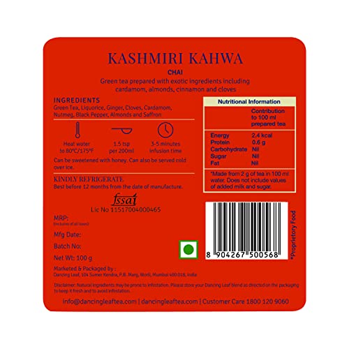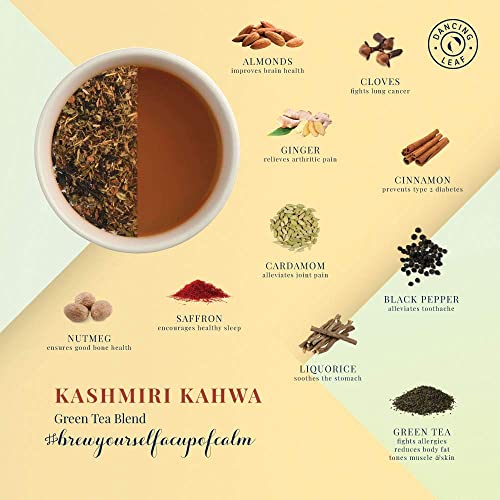 Dancing Leaf Kashmiri Kahwa | Green Tea, Liquorice, Ginger, Cloves, Cardamom, Nutmeg, Black Pepper, Almonds & Saffron | Green Tea Blend | Loose Leaf Pouch (50gms)