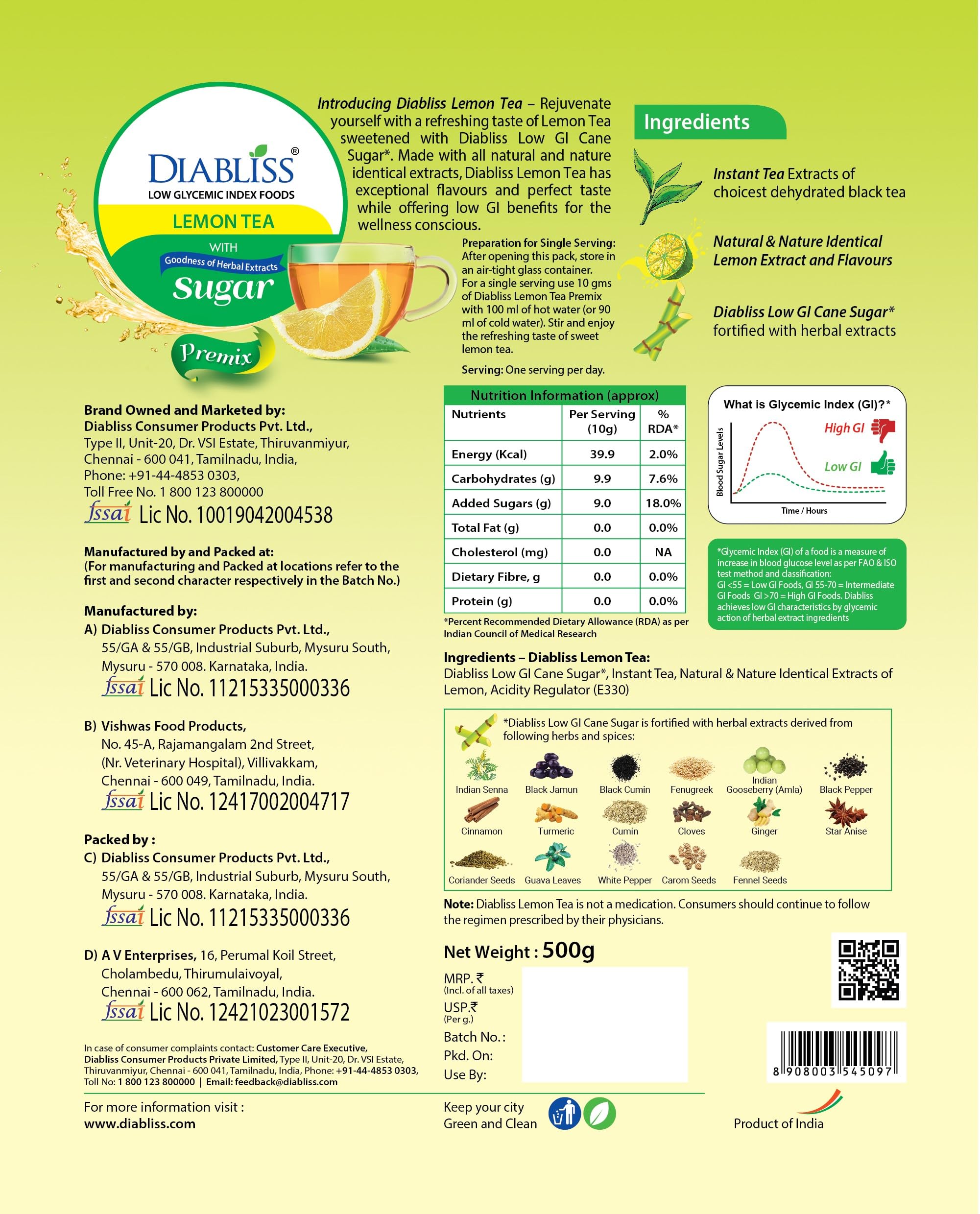 DiaBliss Herbal Diabetic Friendly Lemon Tea 500g - Low Glycemic Food