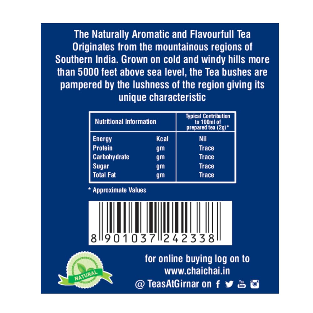 Royal brew with a mild brown hue The unique flavour of this tea will drive away your all-day blues. From slopes popularly known as the Blue mountains Girnarâs Nilgiri Tea makes for a cup of very aromatic tea with delicate floral notes. To appease the senses even more it has a bright liquor and balanced flavour with an undercurrent of briskness. A slower blooming period helps tea from the Nilgiris develop its unmistakable character. Finishes with a creamy mouthfeel when complemented with milk and sugar.