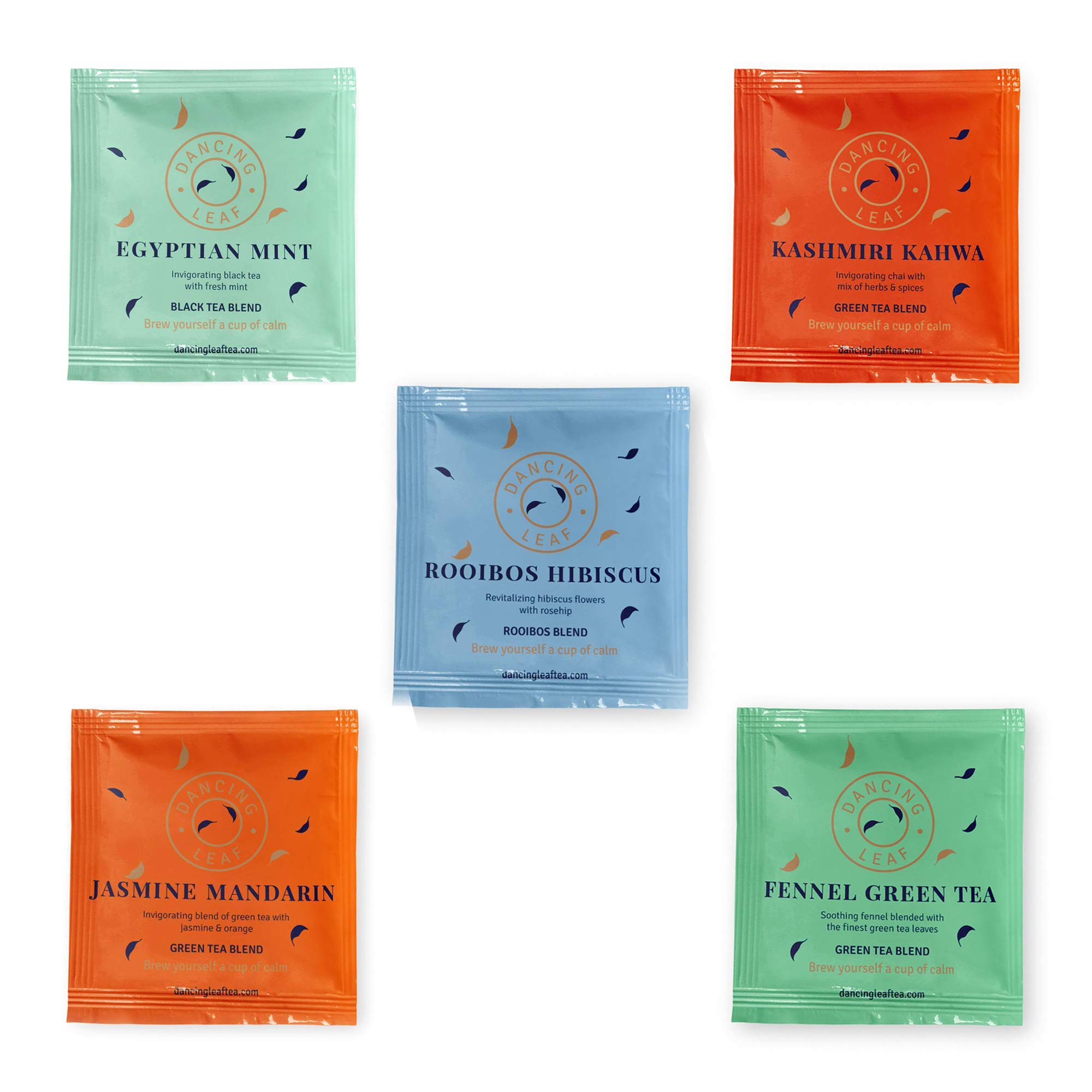 Pocket friendly selection of energizing blends and traditional teas lets you sample a new flavour every day of your work week! Featuring ingredients like jasmine flowers mandarin bits and hibiscus these blends make for a refreshing pick-me-up. Taste a handful of our popular house blends twice! Zero in on your favourites and come back for more. This pack contains 5 blends with 2 pyramid shaped tea bags of each blend. A total of 10 teabags. Rooibos Hibiscus (Rooibos Blend) An epicurean's delight when warm or iced this subtle dynamite is made with a blend of Rooibos Hibiscus flowers and rosehip - ideal for those revitalizing moments. Ingredients: Rooibos Hibiscus Flowers & Rosehip Fennel Green Tea (Green Tea Blend) A perfect palate cleanser that is a soft m©lange of spices fused with the distinctive flavours of star anise and liquorice. Ingredients: Fennel Liquorice Green Tea Star Anise & Mint Leaves Kashimir Kahwa (Green Tea Blend / Chai) Kahwa's signature flavor is derived from the use of saffron strands that are included in the blend. This one is a truly celebratory tea. Ingredients: Green Tea Liquorice Ginger Cloves Cardamom Nutmeg Black Pepper Almonds Saffron Jasmine & Mandarin Green Tea (Green Tea Blend) This delicious blend is a soothing infusion with light floral undertones combining green tea with jasmine and mandarin for an explosion of citrus flavor. Ingredients: Green Tea Orange Petals Jasmine Flowers & Mandarin Bits Egyptian Mint (Black Tea Blend) A rejuvenating black tea infused with the raw and natural flavour of mint eases you into a refreshed state of mind with each invigorating sip. Ingredients: Black Tea Liquorice Cinnamon Chicory Orange Peel and Mint