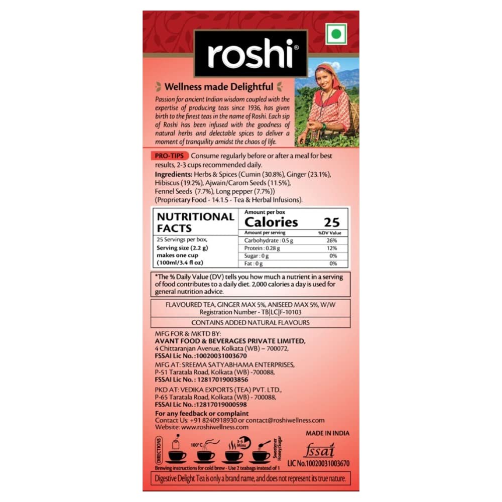 Roshi Digestive Delight Tea | 25 Teabags | Digestive Herbal Hibiscus Tea alongwith the Goodness of Ginger Saunf and Ajwain | Prevents Indigestion Gas and Bloating | After Meal Digestion Tea